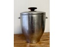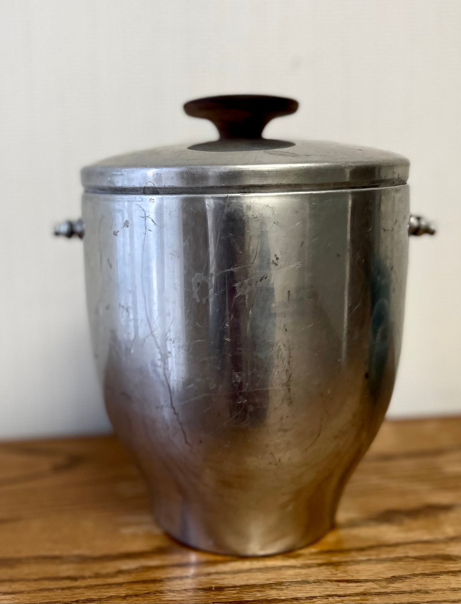 Amazing and Very Cool- Mid Century modern stainless steel ice bucket with oversized wood knob and side handles. A few dings here and there- but cannot detract from the atomic/ vintage industrial style. 8 wide x 10 high.