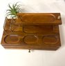 Mid Century Modern Mens Wooden Dresser-Top Valet, Valet, Jewelry Box. Nice wood, brass accents, in excellent vintage condition, 3 compartments in lower drawer, red plush velvet lin ed. 11.5 x 6.5 x 5 high