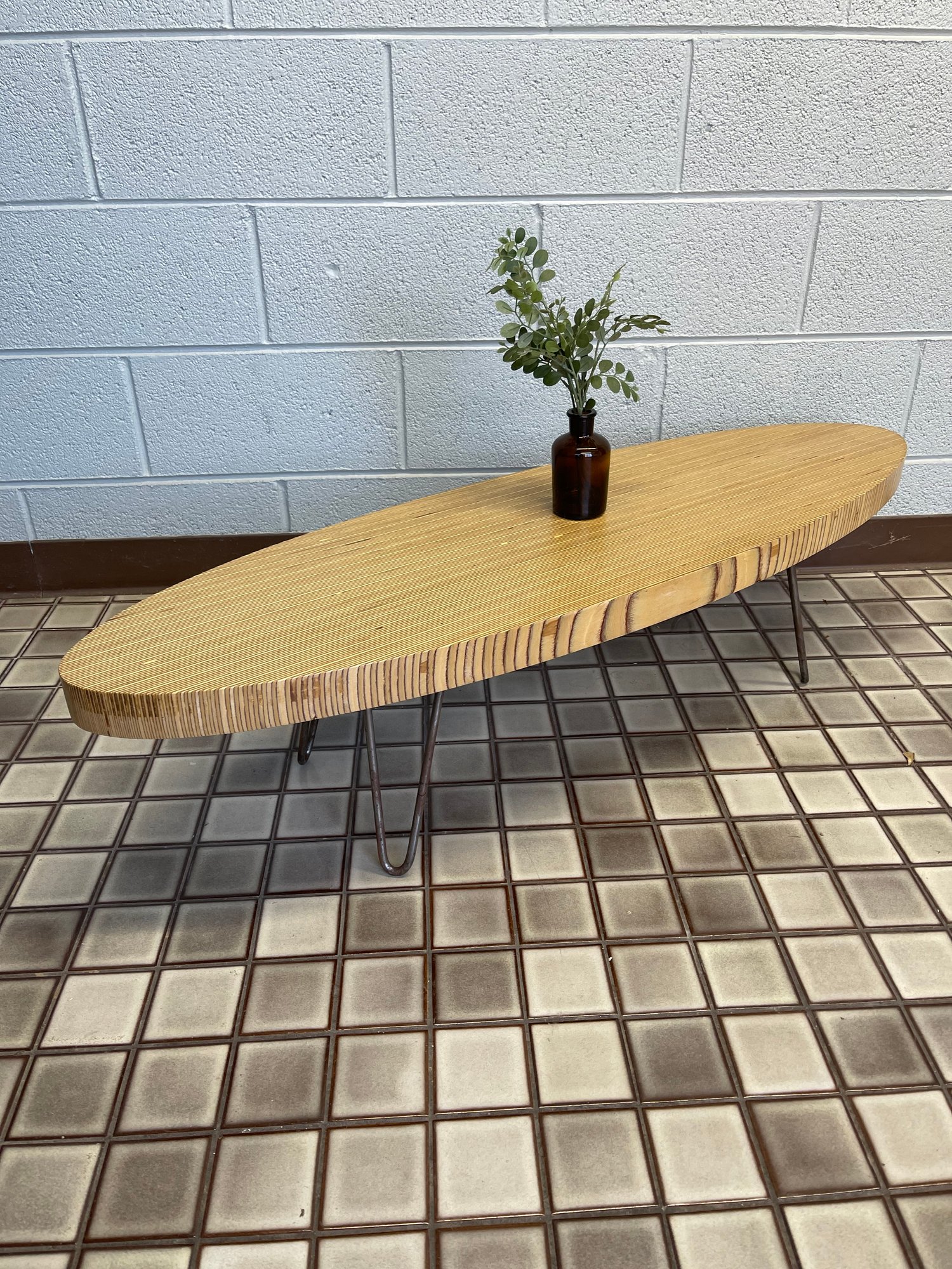Attractive and stylish Bamboo like surfboard coffee table. Table top very thick and solid with steel hairpin legs. 48 x 14 x 12. Heavy and solid!