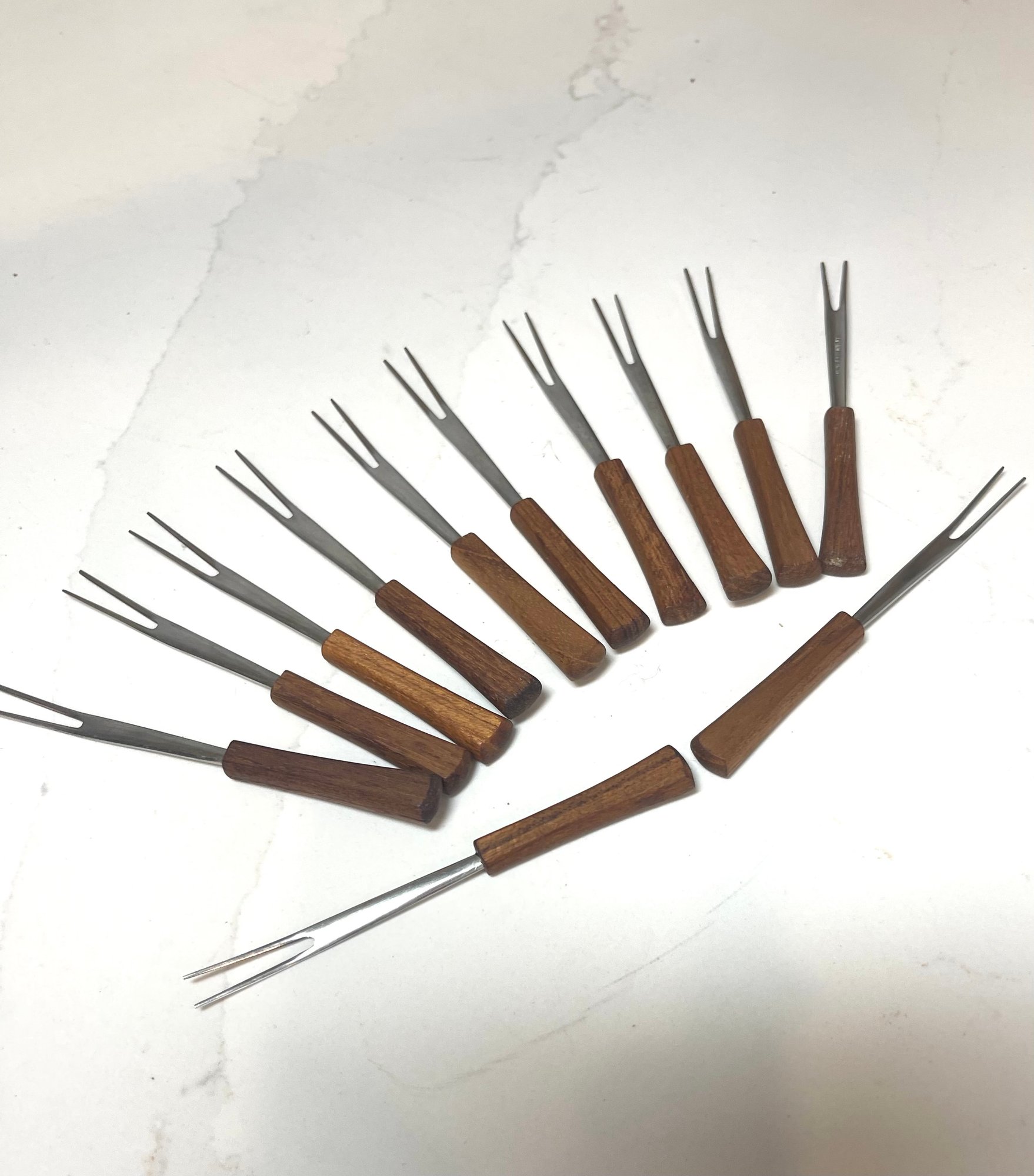 Mid Century Modern Teak Handled Cocktail Forks. Set Of 12.