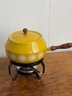 Classic quilt pattern on bright yellow fondue pot. Showing some wear on one side, consistent with age and use.