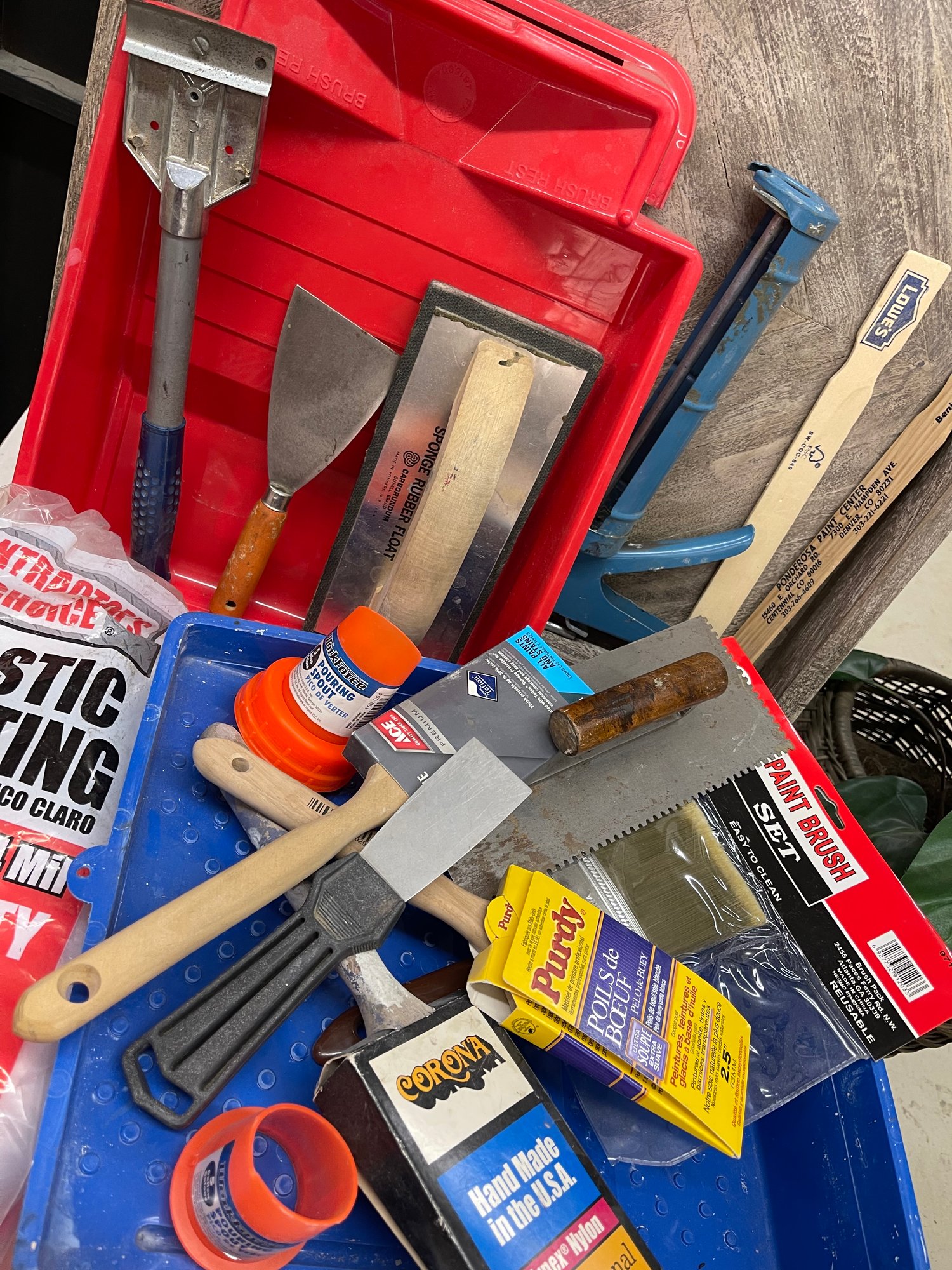 Painting supplies and prep tools. including new in box Purdy, Ace brushes, stirrers, paint bins and plastic drop cloth. Ready for your next project!