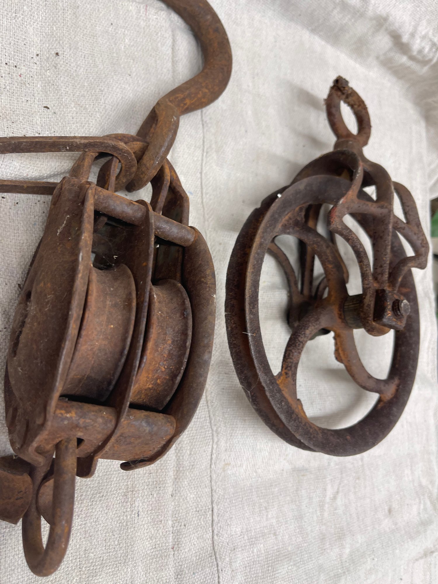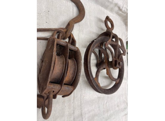 Cast iron Pulley with decorative brace/hanger. ( 8 diaper x 11 high), and double pulley with chunky iron hook marked Hartz. 14 long x 3 wide.