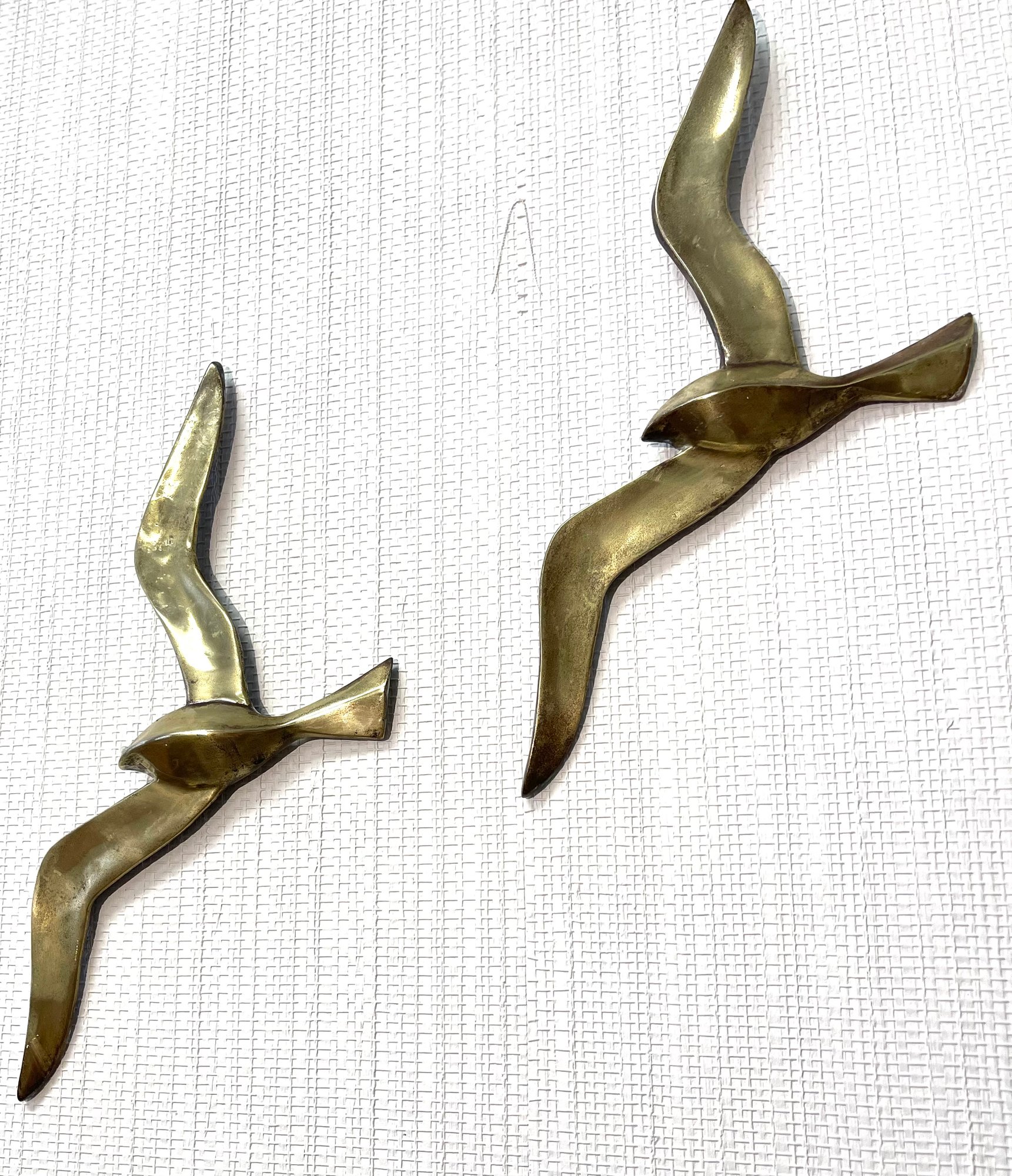 Gorgeous Set Of Mid Century Modern Brass Seagulls. showing some tarnish but will clean up to original shine. 13 x 7. welded loops on back for easy hanging