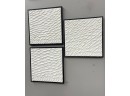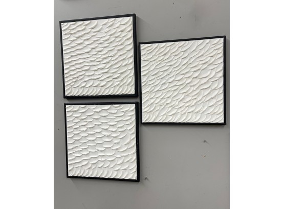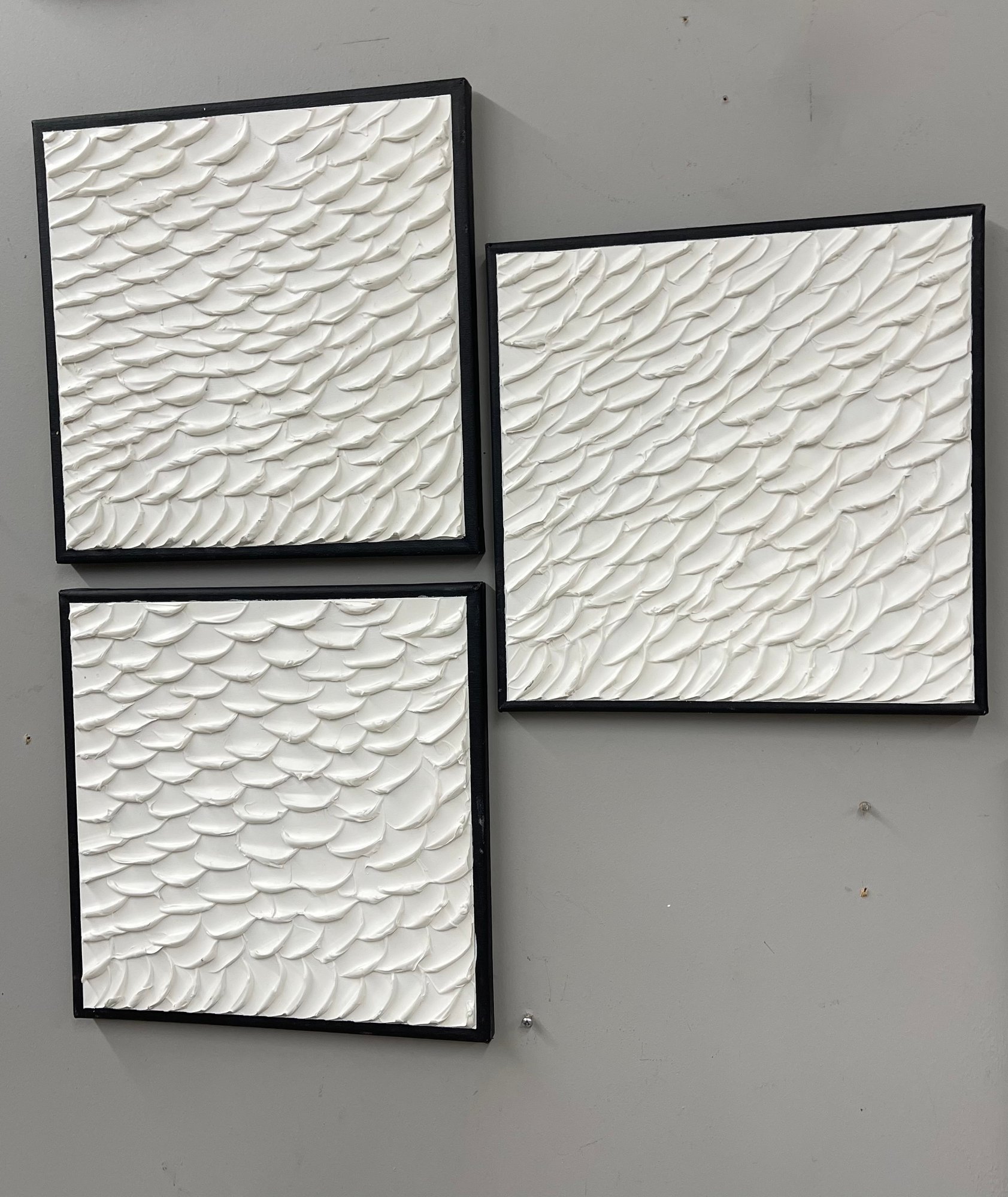 Bold textural/dimensional art canvases from Abigail Joy Studios. Bold white texture on black border wrapped canvases. Set of three, titled Waves. 12 x 12 each. Lots of option for bold textural impact!