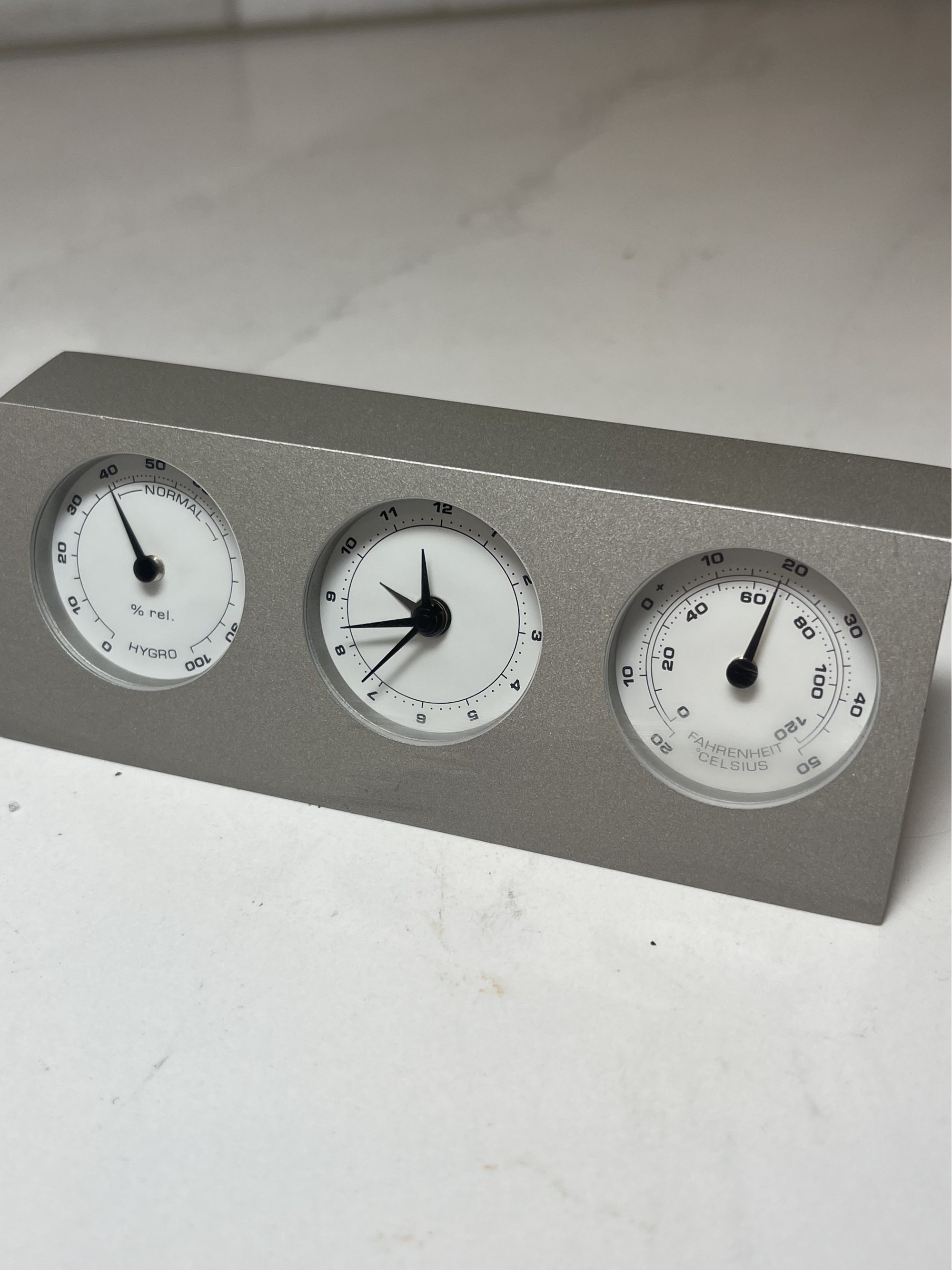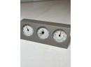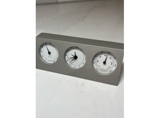 Small and rare Bey-berk 3-dial clock and barometer with a matte nickel finish. Displays the time in the middle dial, with humidity in the left-hand dial and temperature (fahrenheit and centigrade) on the righ-hand dial. Item weighs 12.6oz and is in excellent condition. Approximate measurements are 4.75" wide x 1.75" tall x .75" thick.