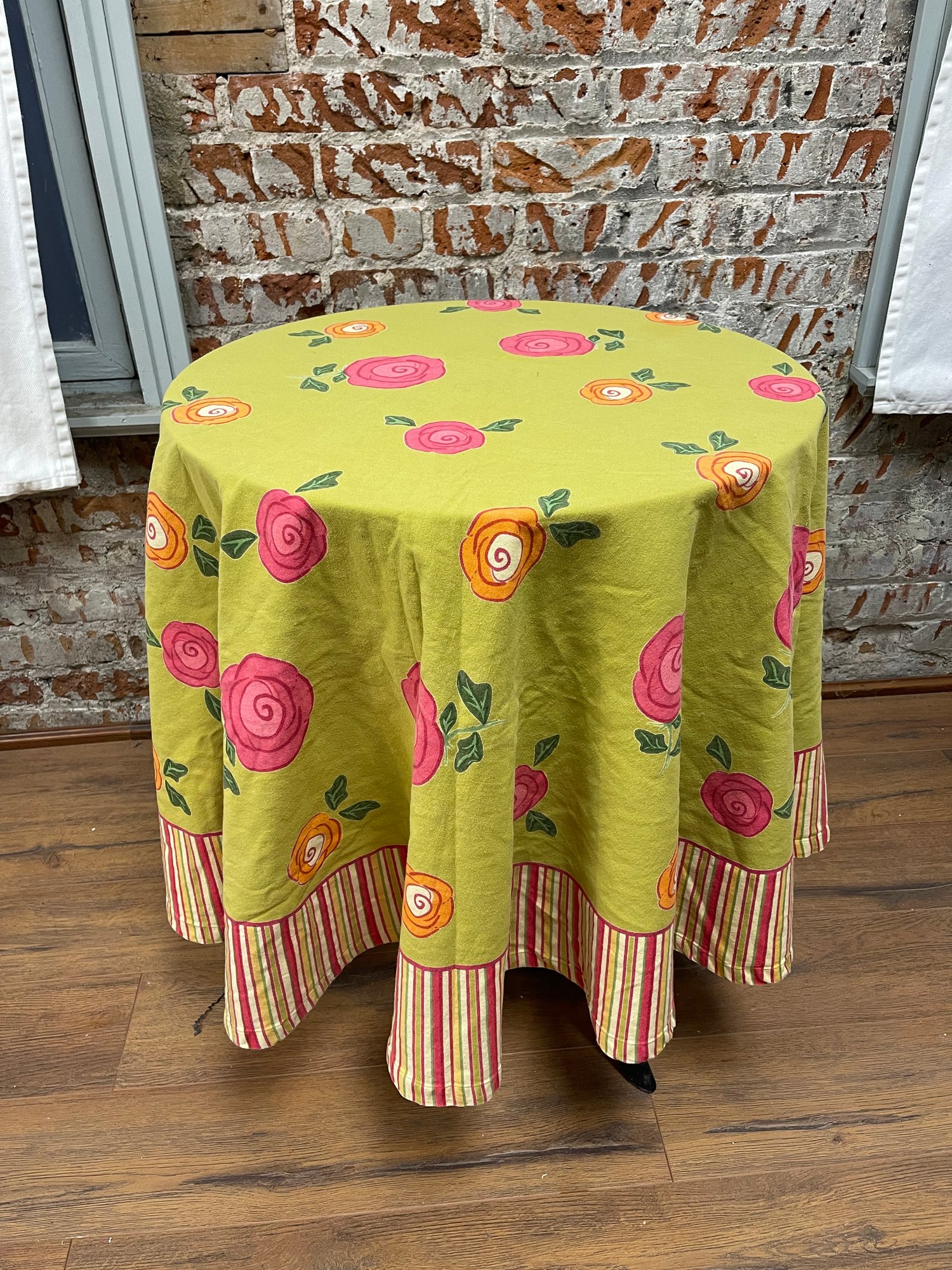 Beautiful green, pink, &, orange TAG tablecloth in excellent condition. 72" Diameter