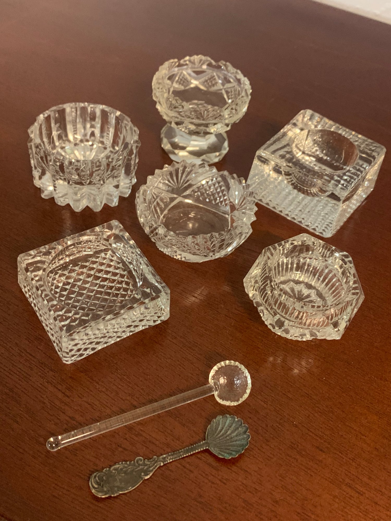 Set of Six Glass Salt Dishes With Silver spoon & Glass Spoon