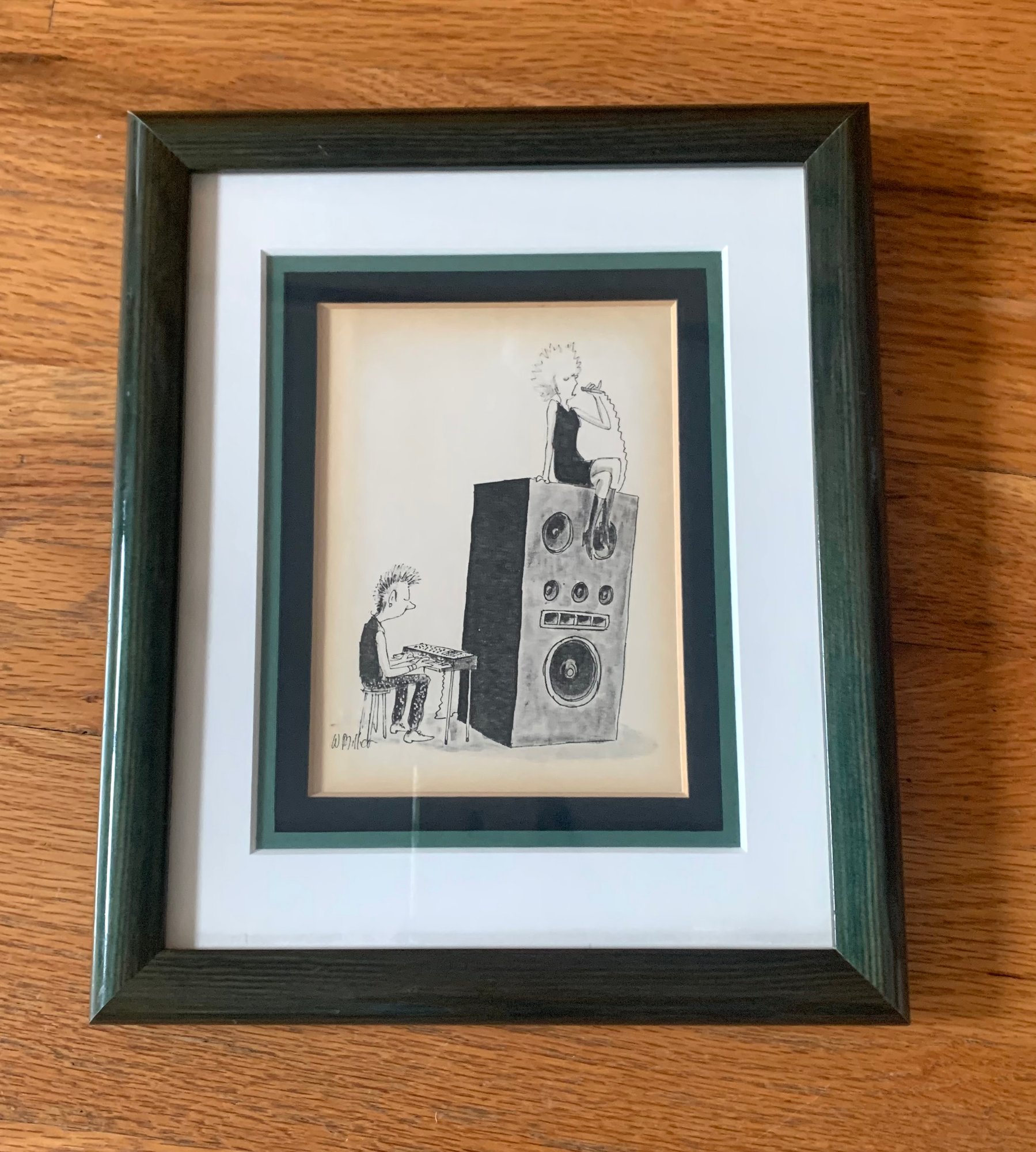 Punk rocker playing Key board connected to huge speaker approx. 11.5”x 9”