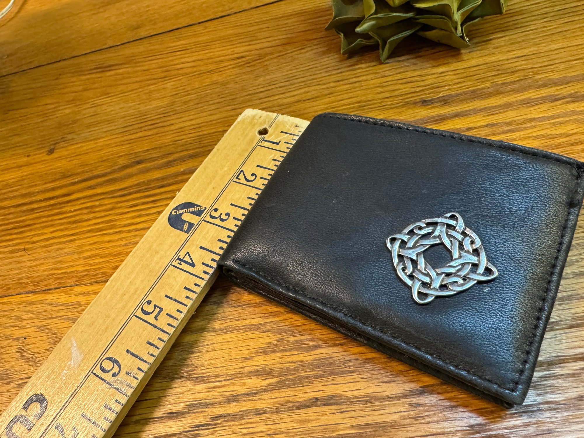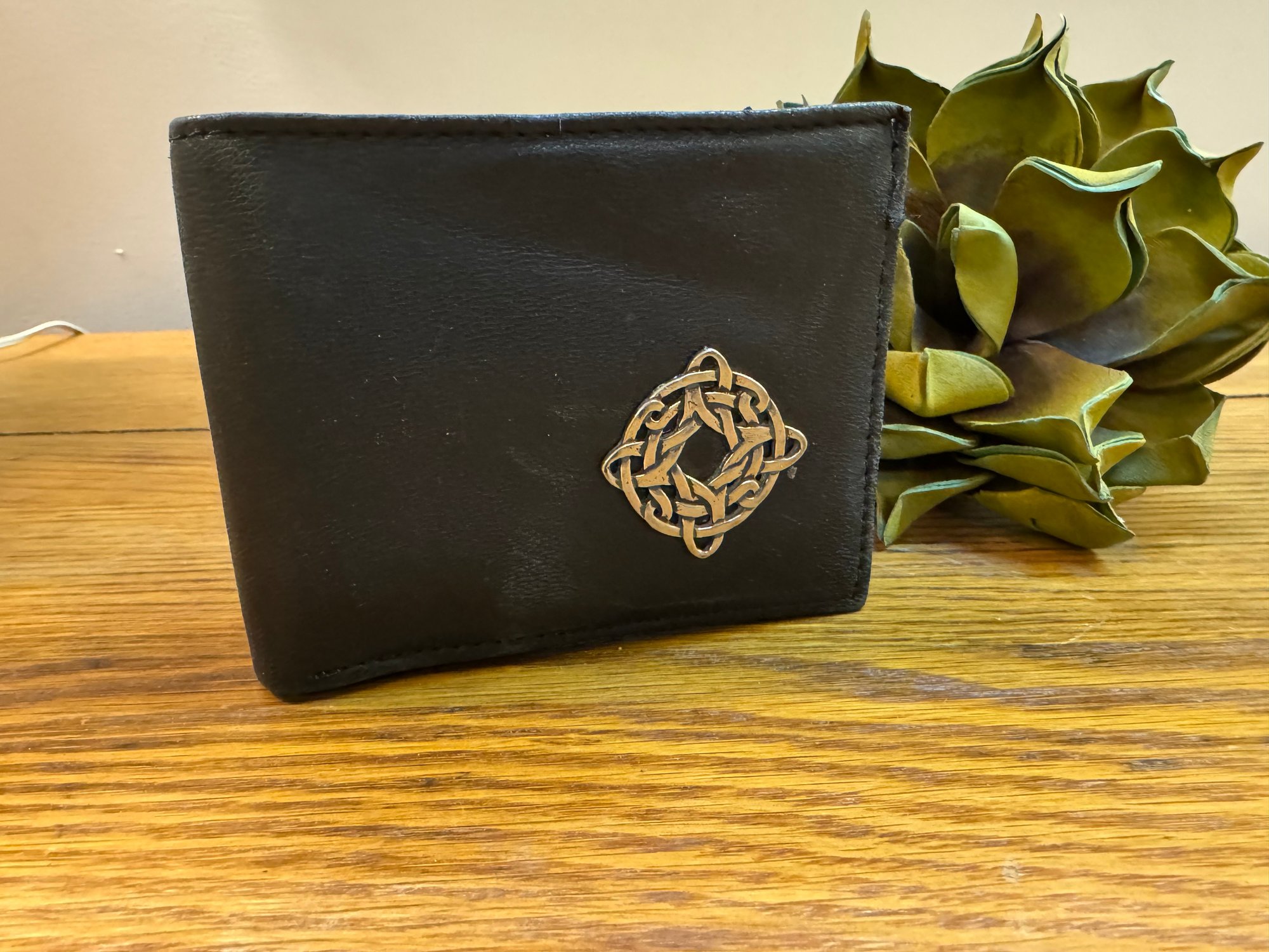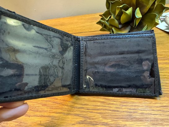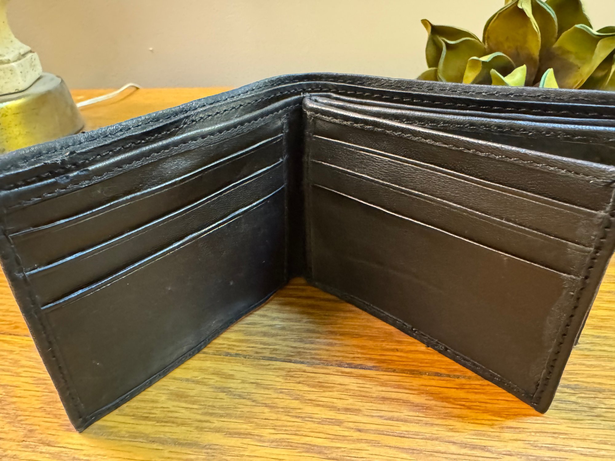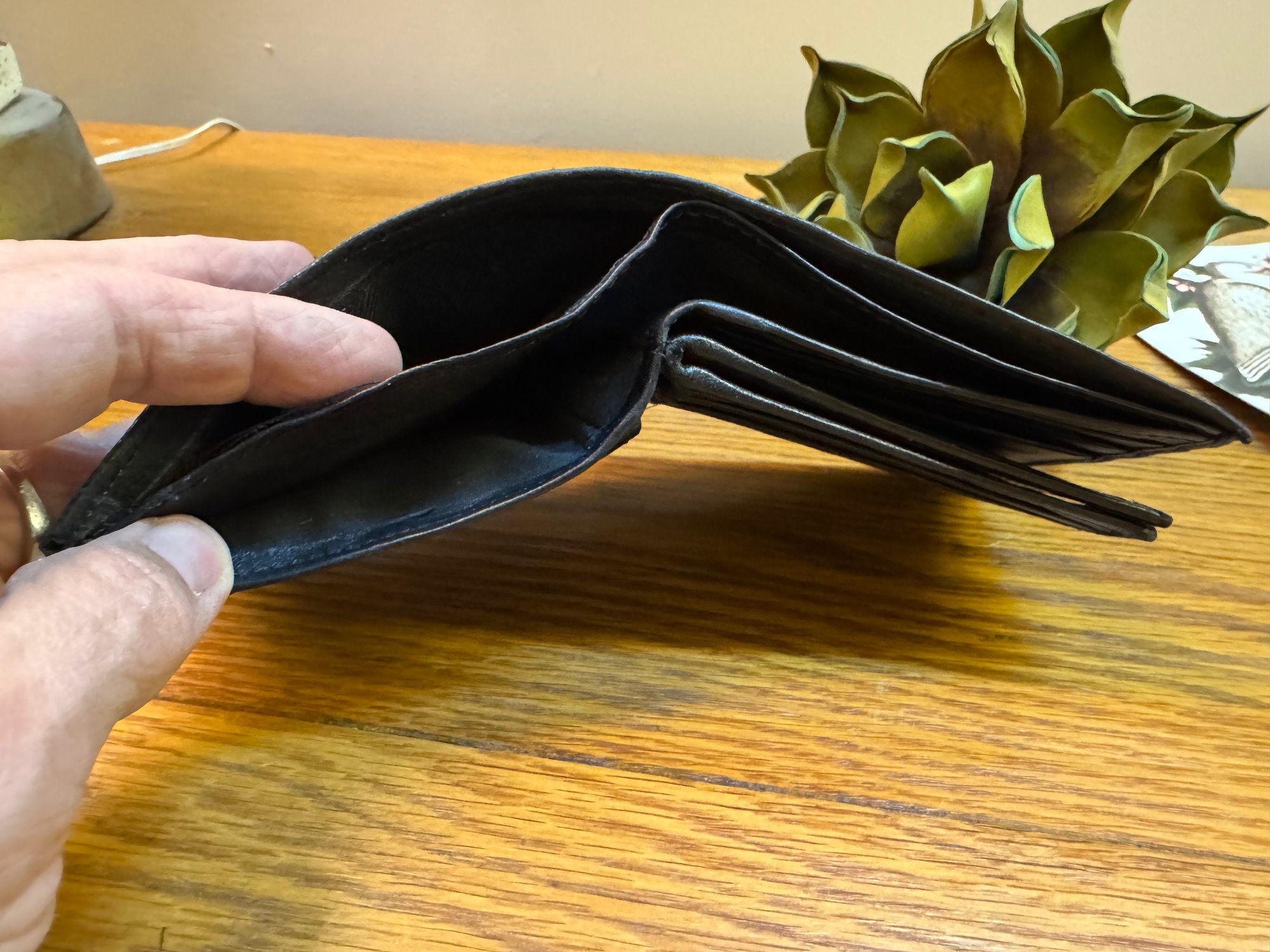Lots of interior pockets on this wallet made of so-so soft tanned leather. Even room for photos!