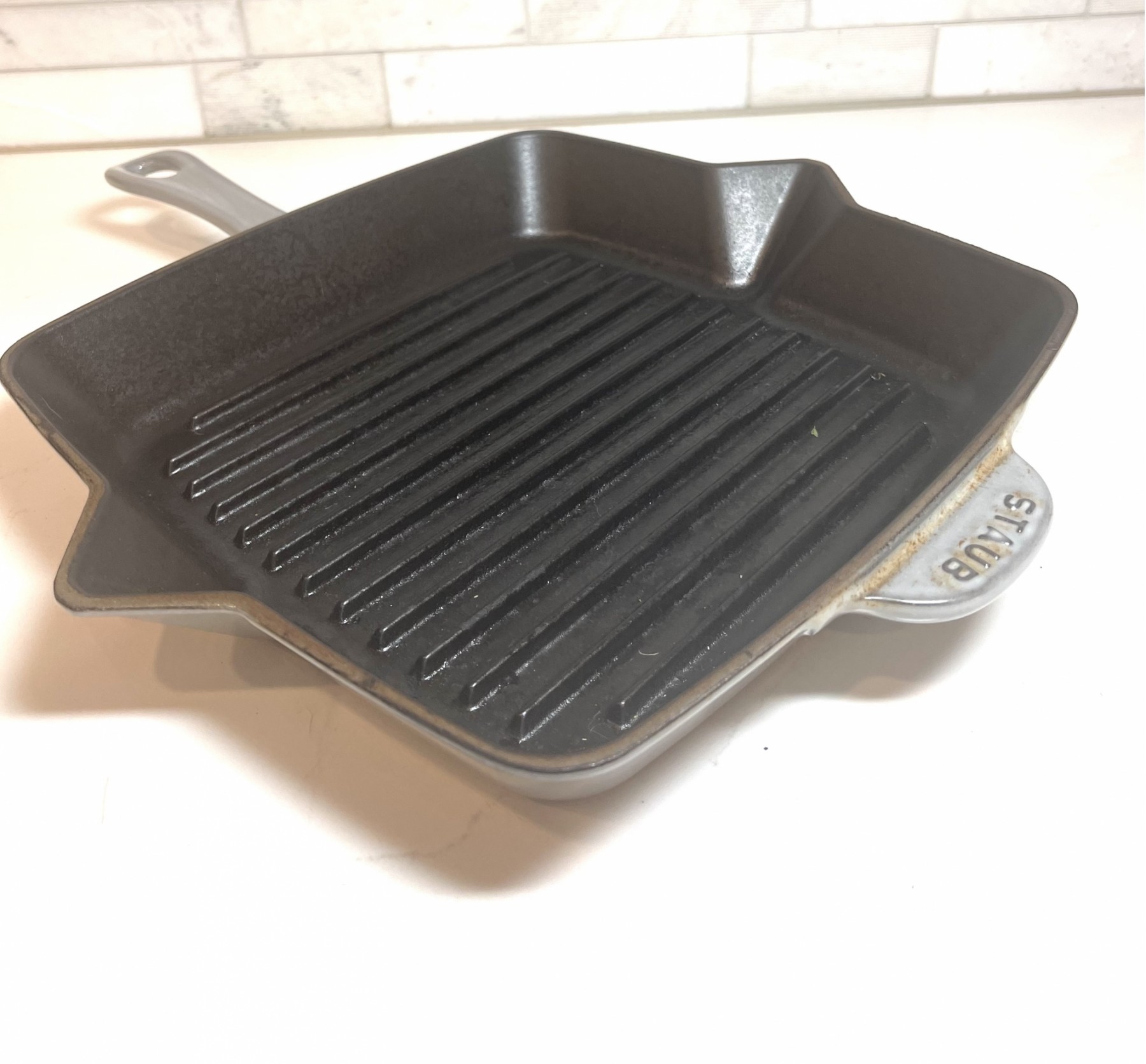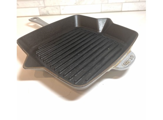 Gray in color, approximately 10 inches square. Heavy duty grill pan. One of the best brands of cookware you will ever own.