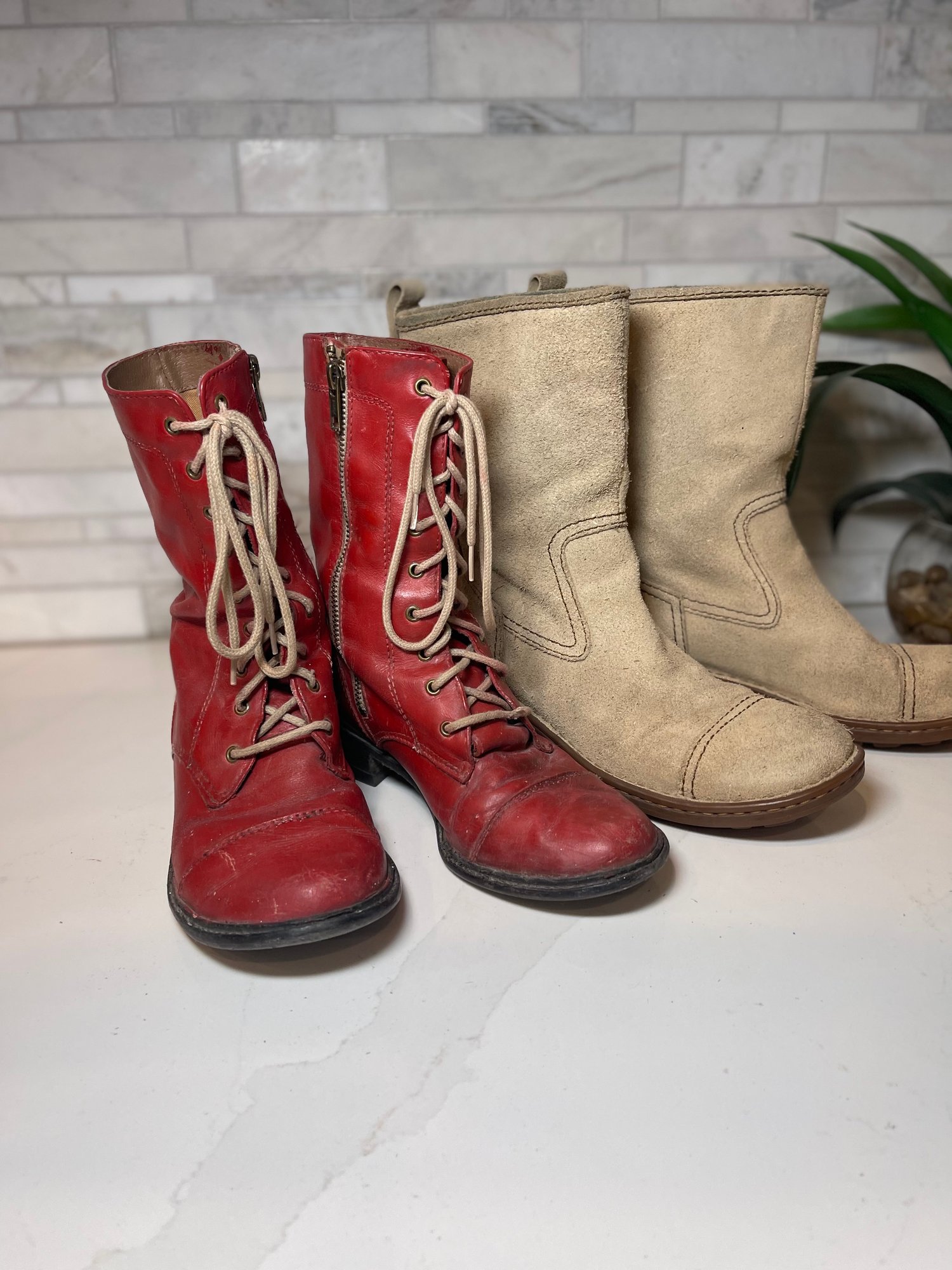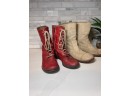 2 great pair of work/play boots. Camel colored Suede are Born( size 7.5), red leather lace up boots with zipper are Mia.( Size 7)