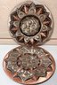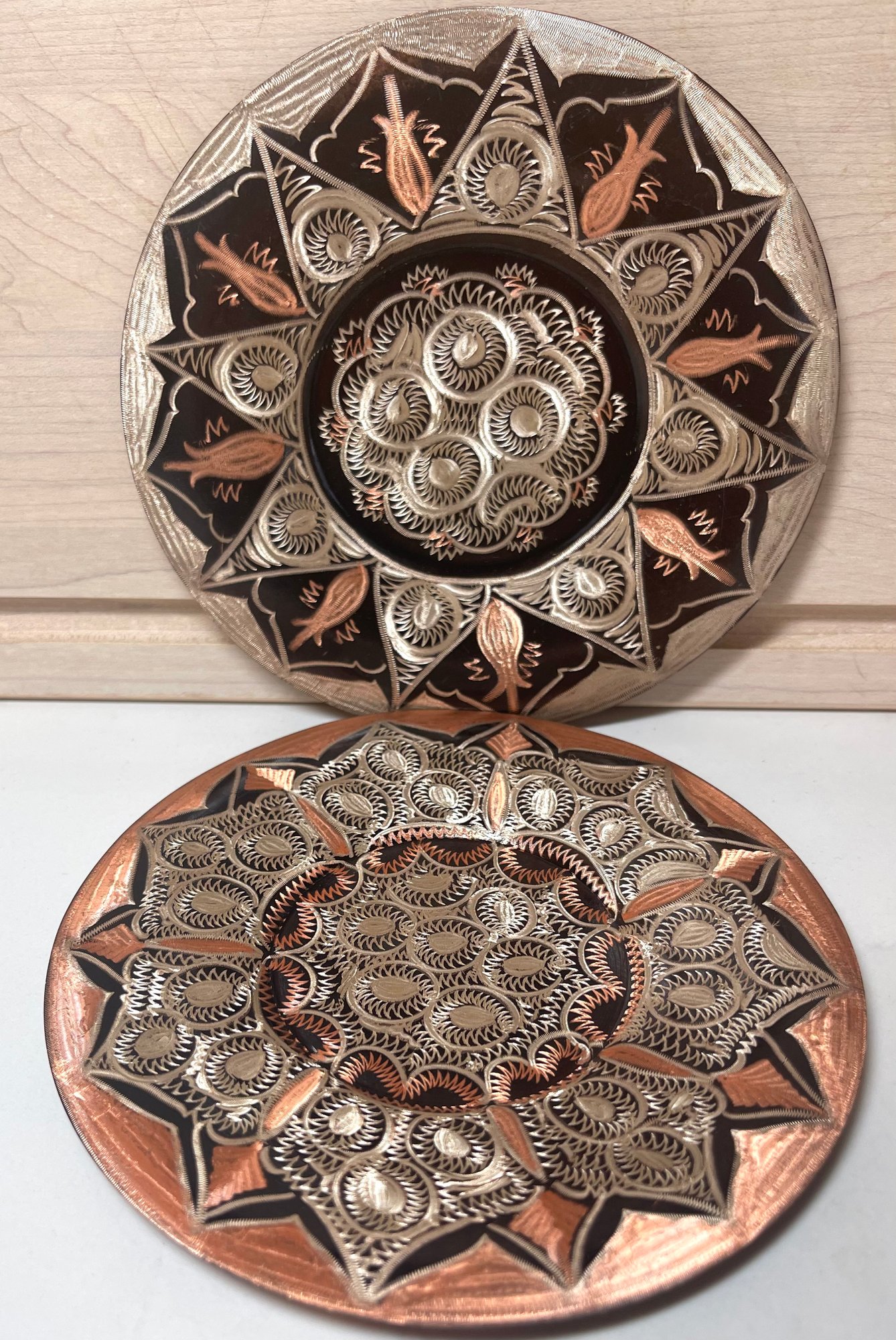Elegant and ornately detailed Set of 2 Hand Etched And Carved Decorative Copper Turkish Plates/Wall Hangings . Welded hangers on Back, approx 6 inches in diameter. Made in Turkey.