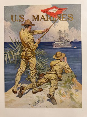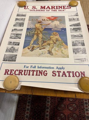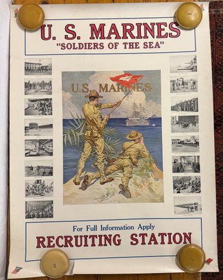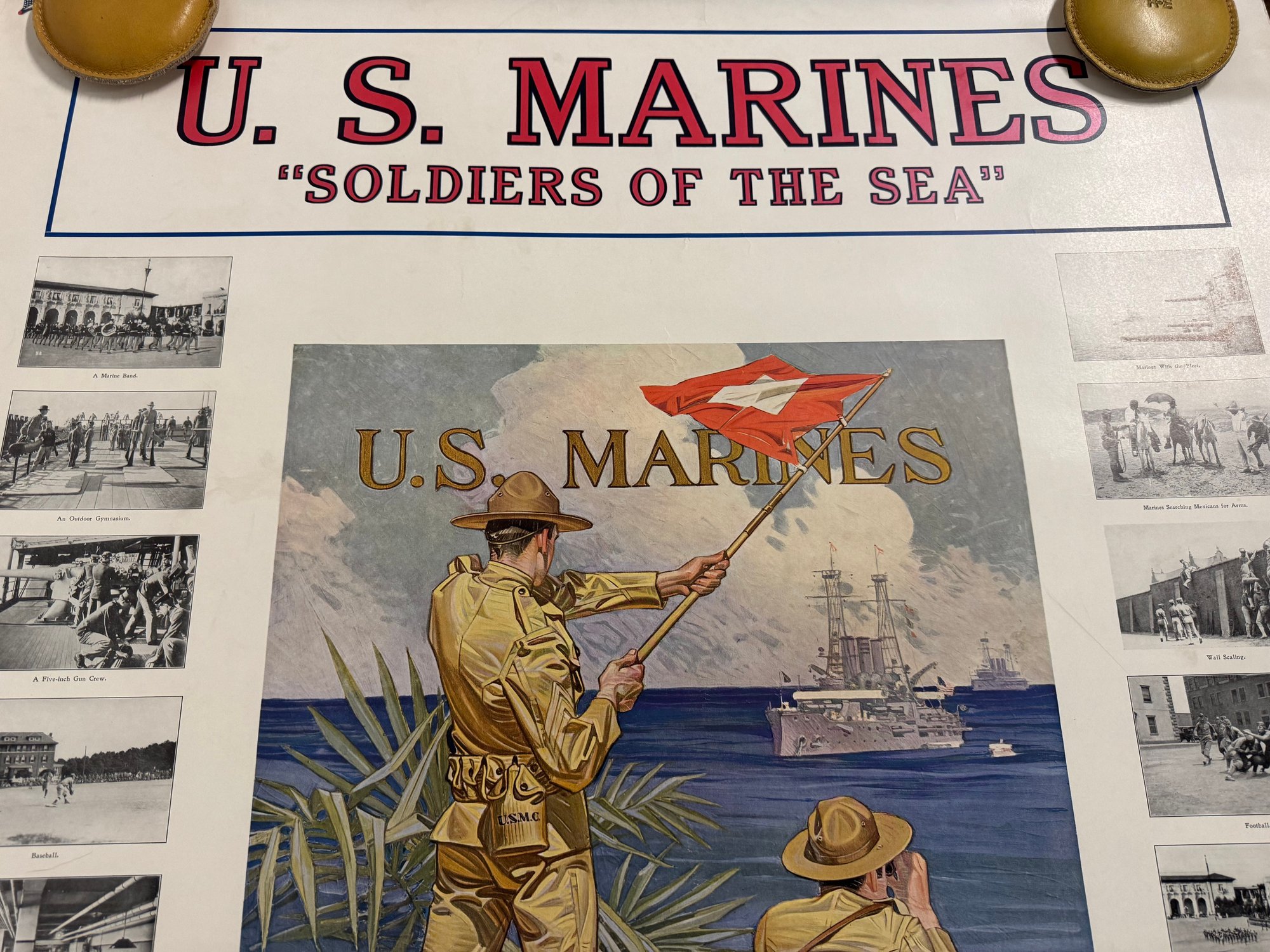 UPDATE: This classic World War One recruitment poster is in overall good condition although it did have pin holes and little flag stickers attached to it by the young boy that we were told was given to him by the recruitment office. United States Marine Corps; "Soldiers of the Sea" by Joseph Christian Leyendecker.