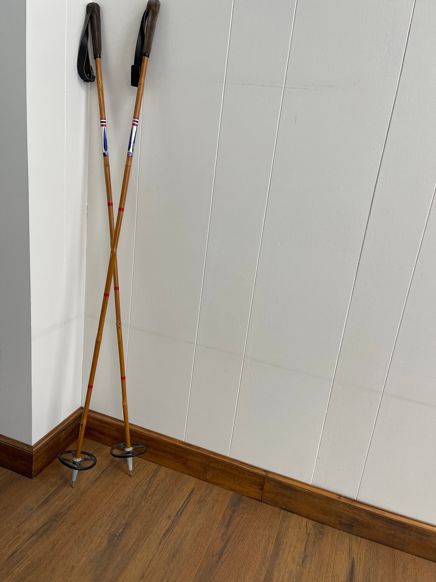 Vintage Bamboo Ski Poles, Made In Norway with suede/leather handles. In fabulous condition, 53 high Great cabin decor!