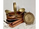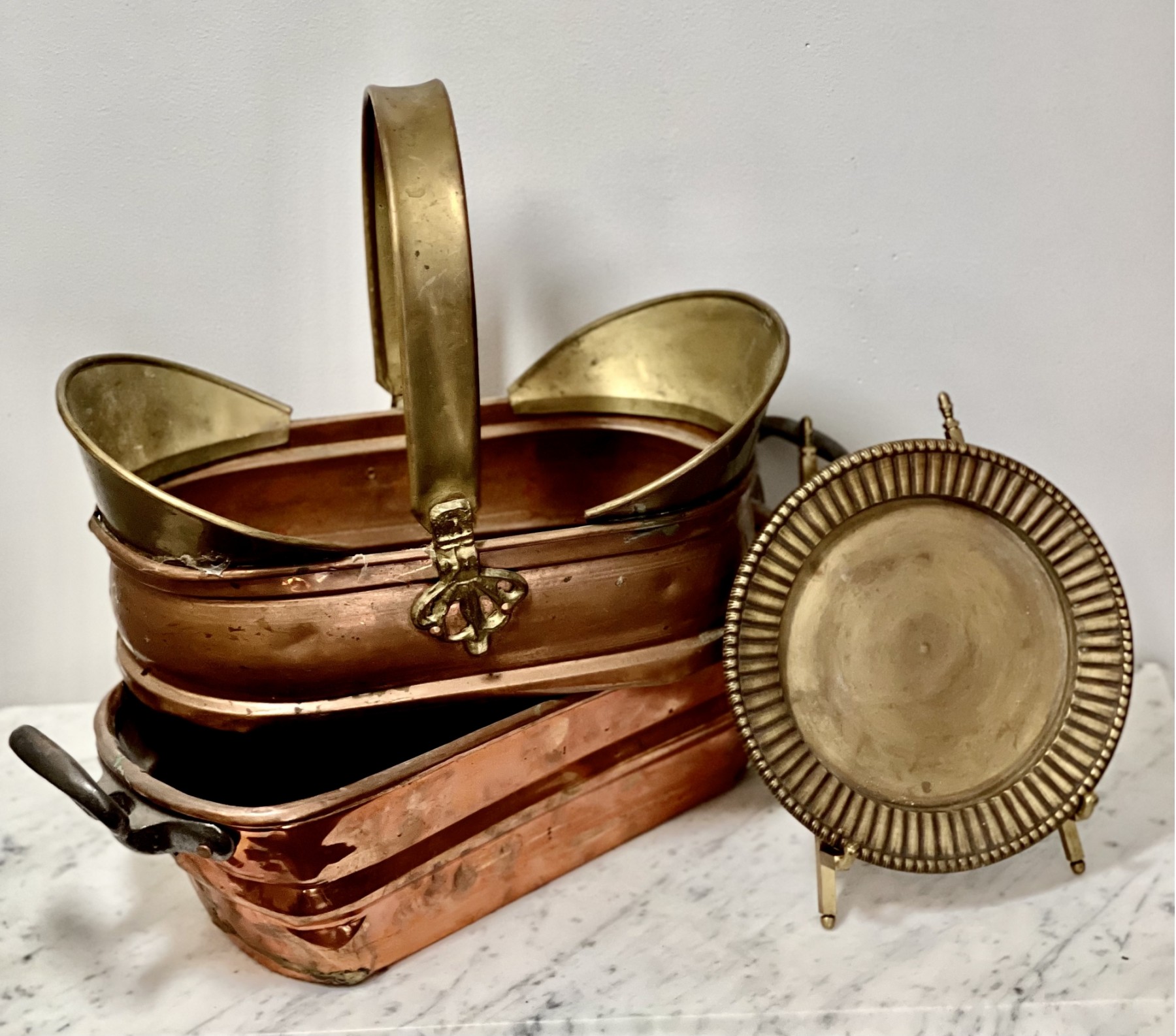 Vintage Brass and copper pieces: Rectangular planter with brass handles, 15 x 6 x 5, Copper vessel with brass ends and carrying handle( 12 x 6 x 11 high with handles, and solid ribbed plate with feet, 7 diameter