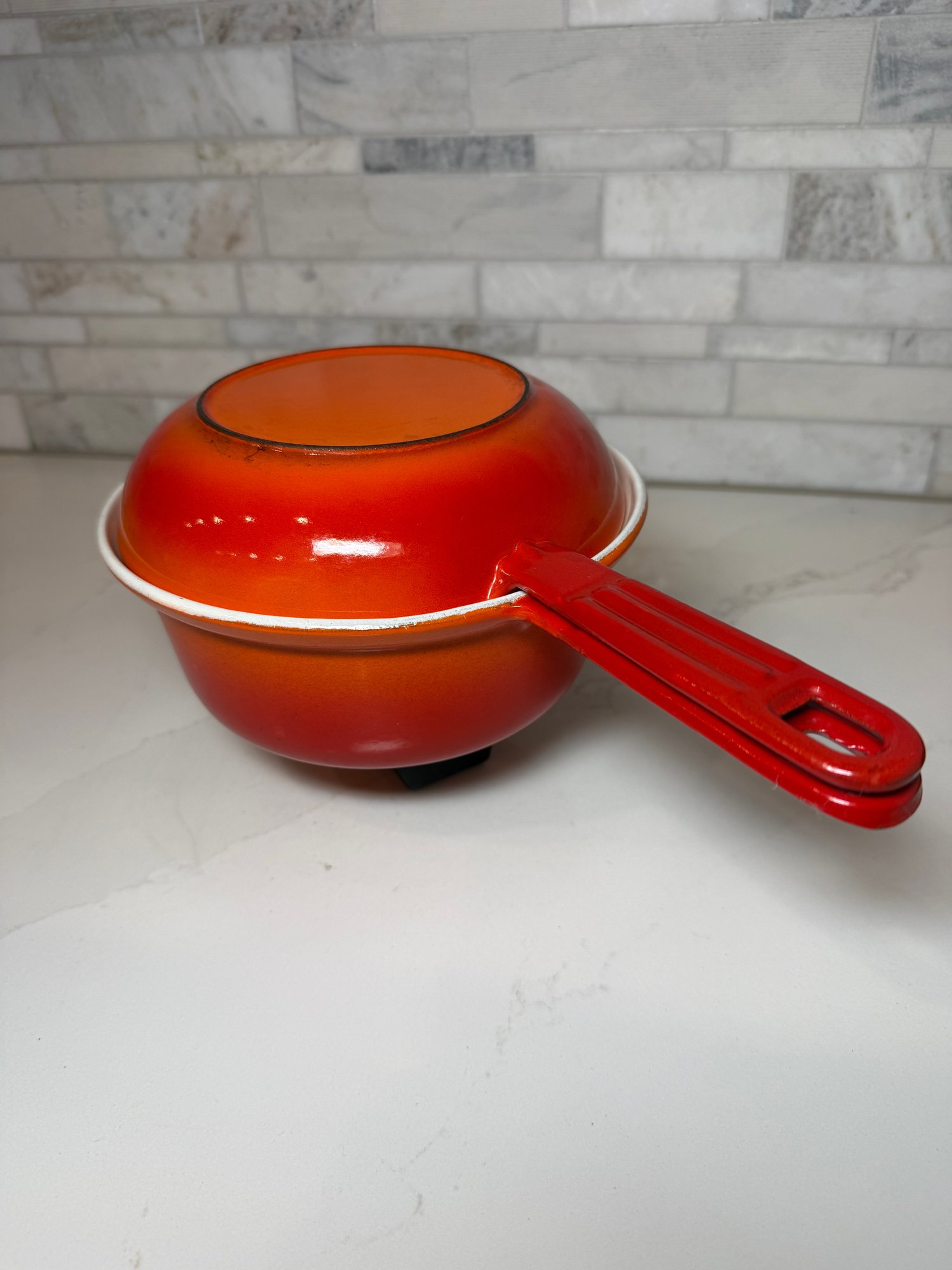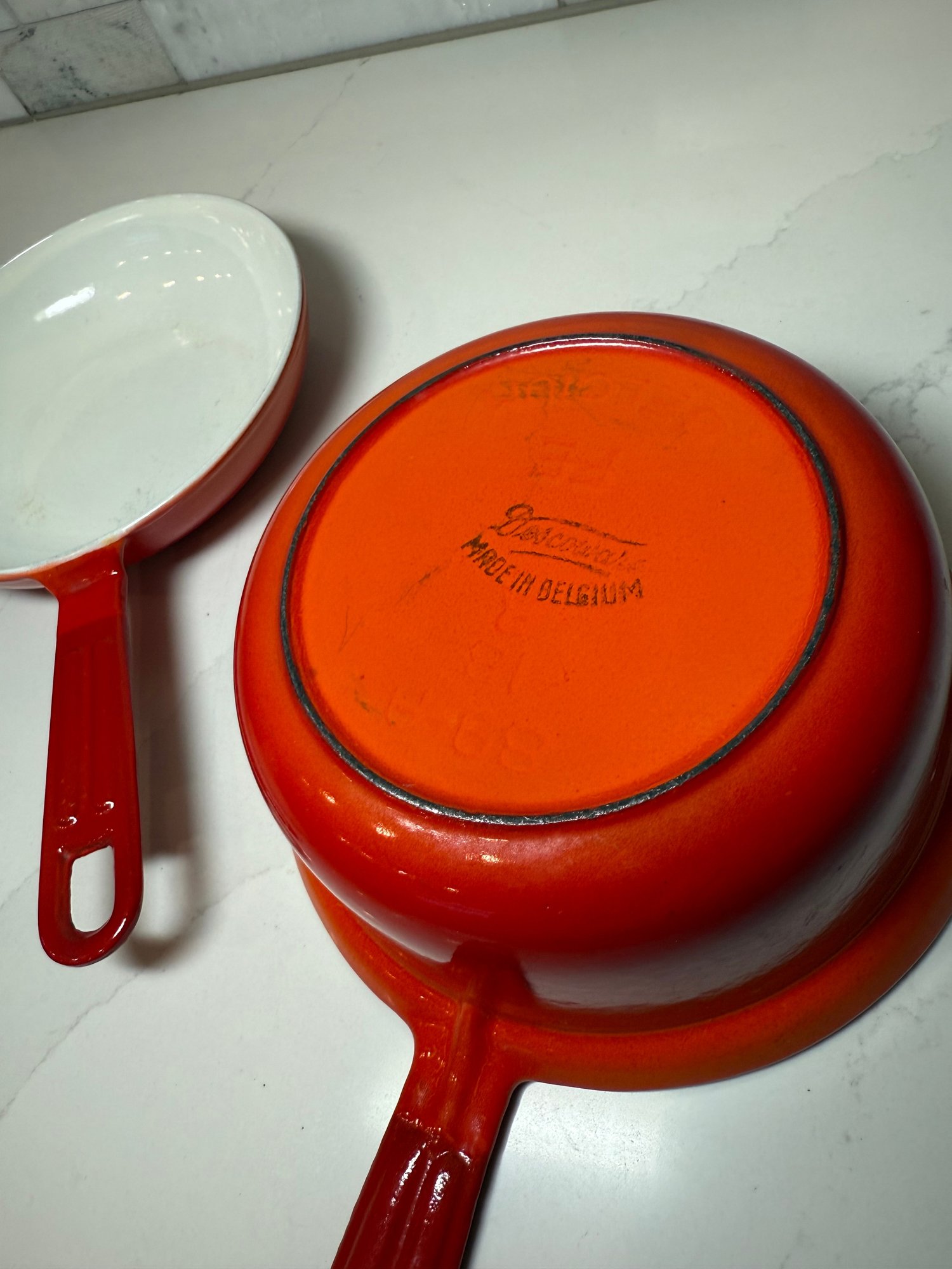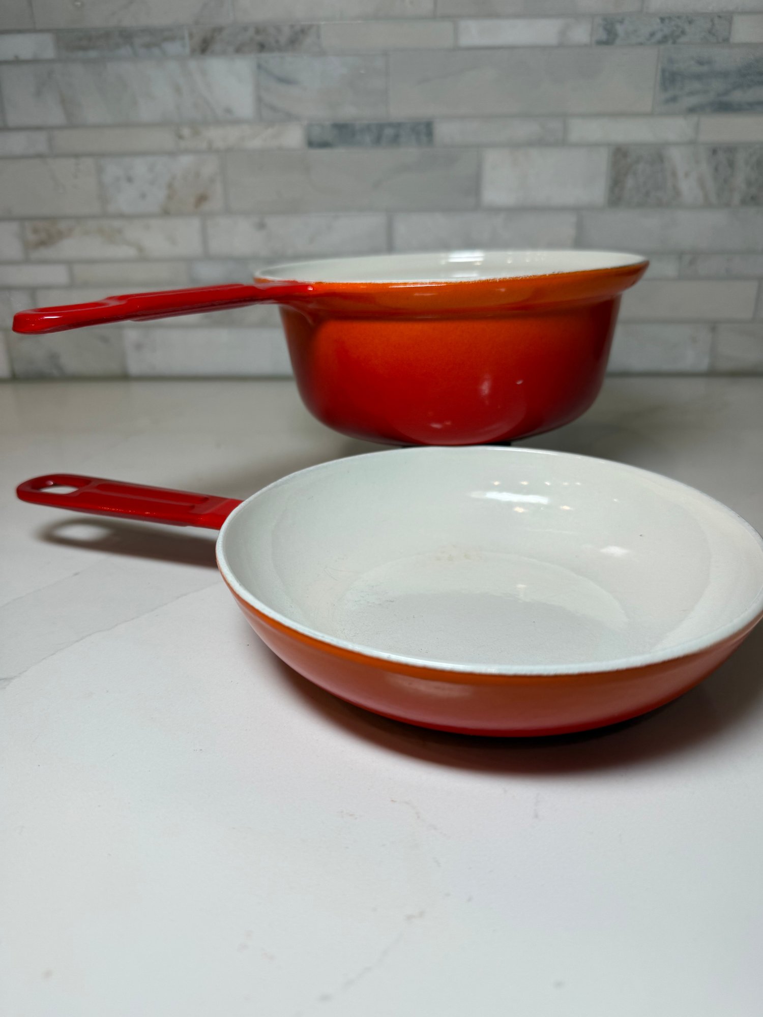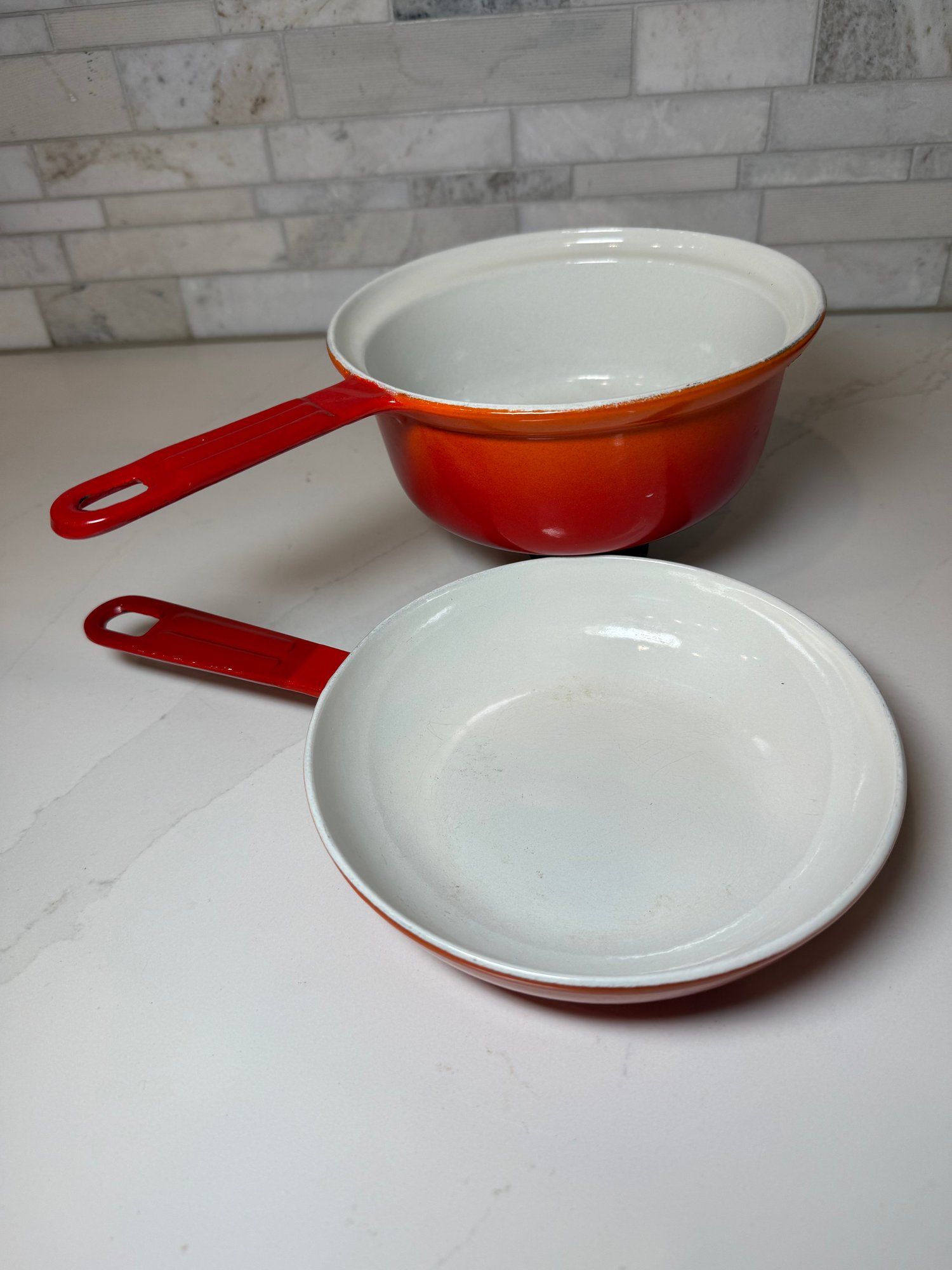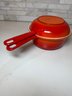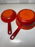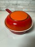 Vintage Descoware Enamel Cast Iron In Flame Orange, Saucepan And Skillet