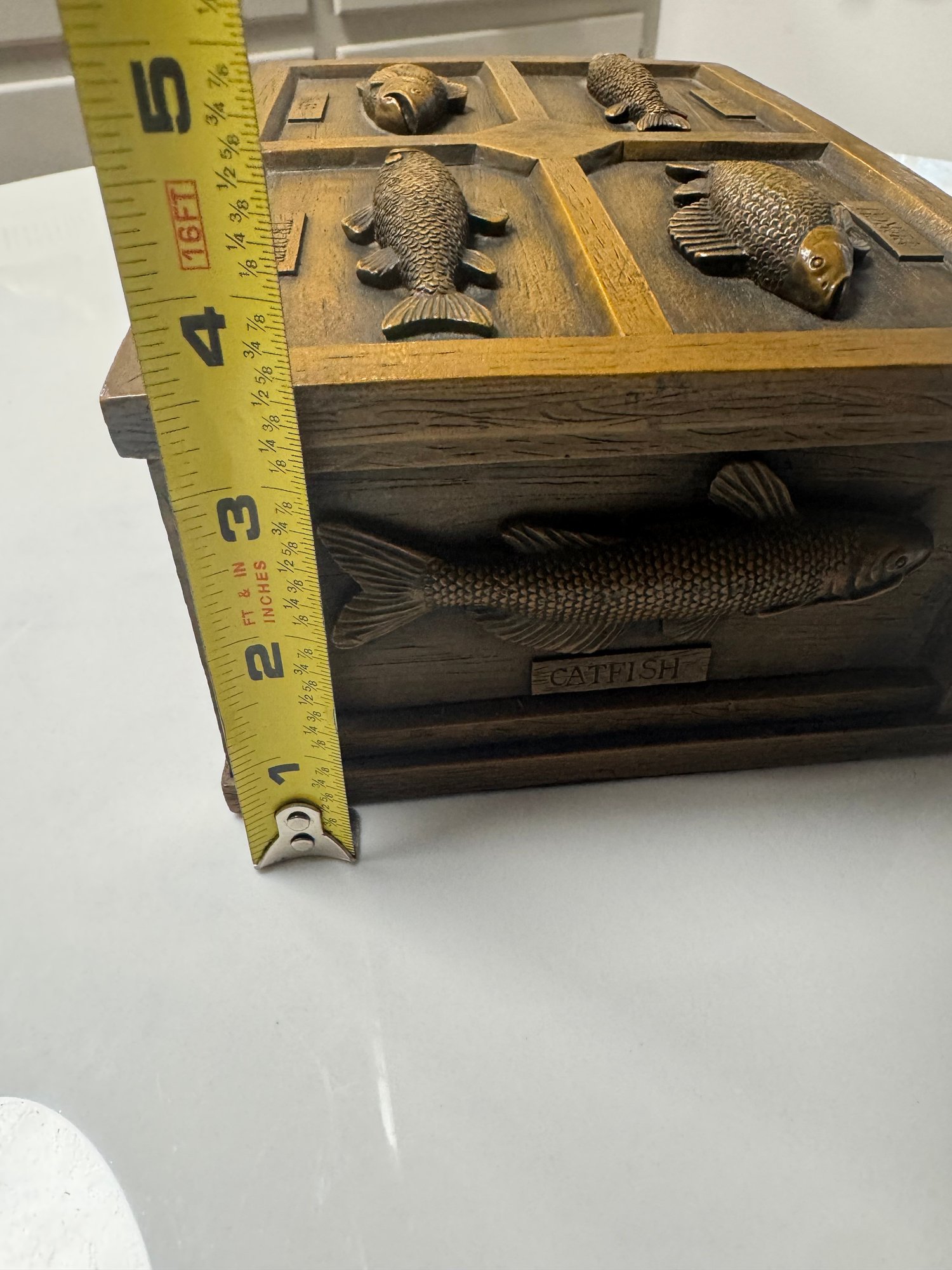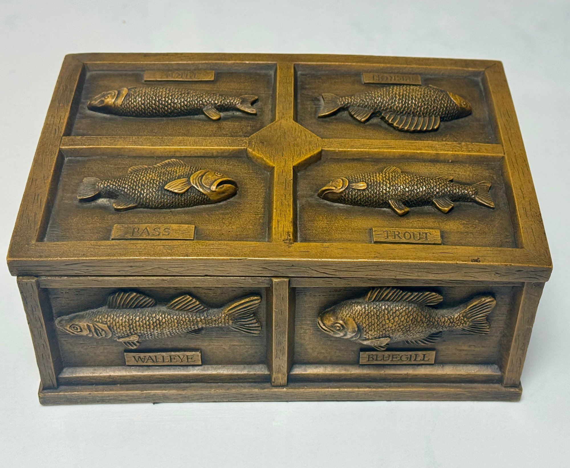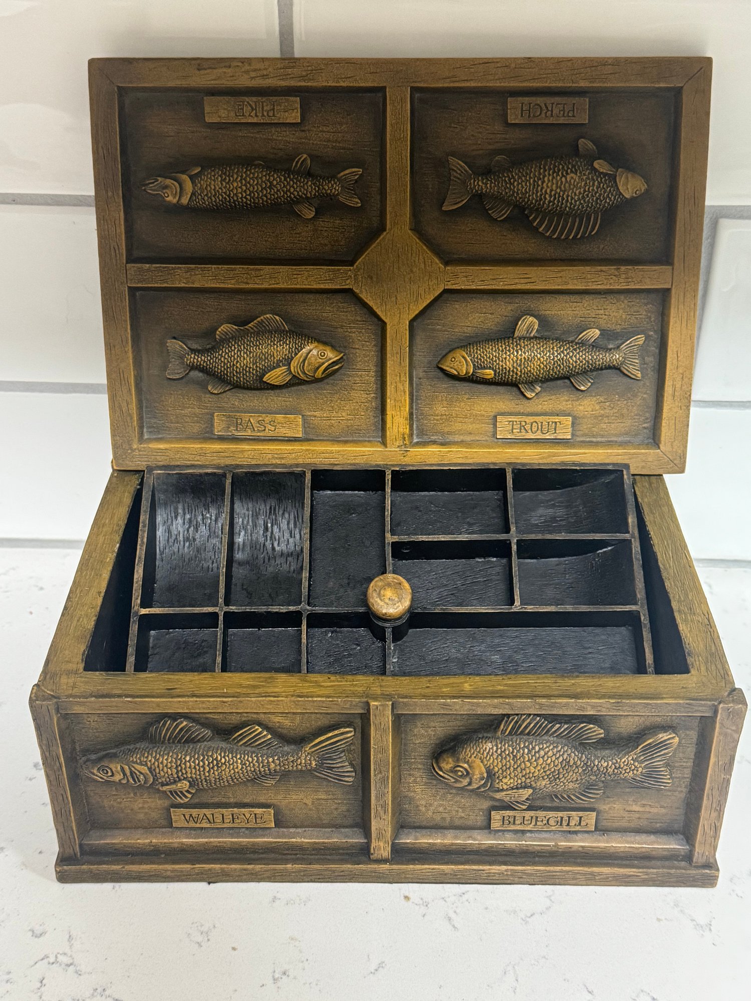 vintage fish, jewelry, trinket box, organizer, brown, resin wood grain