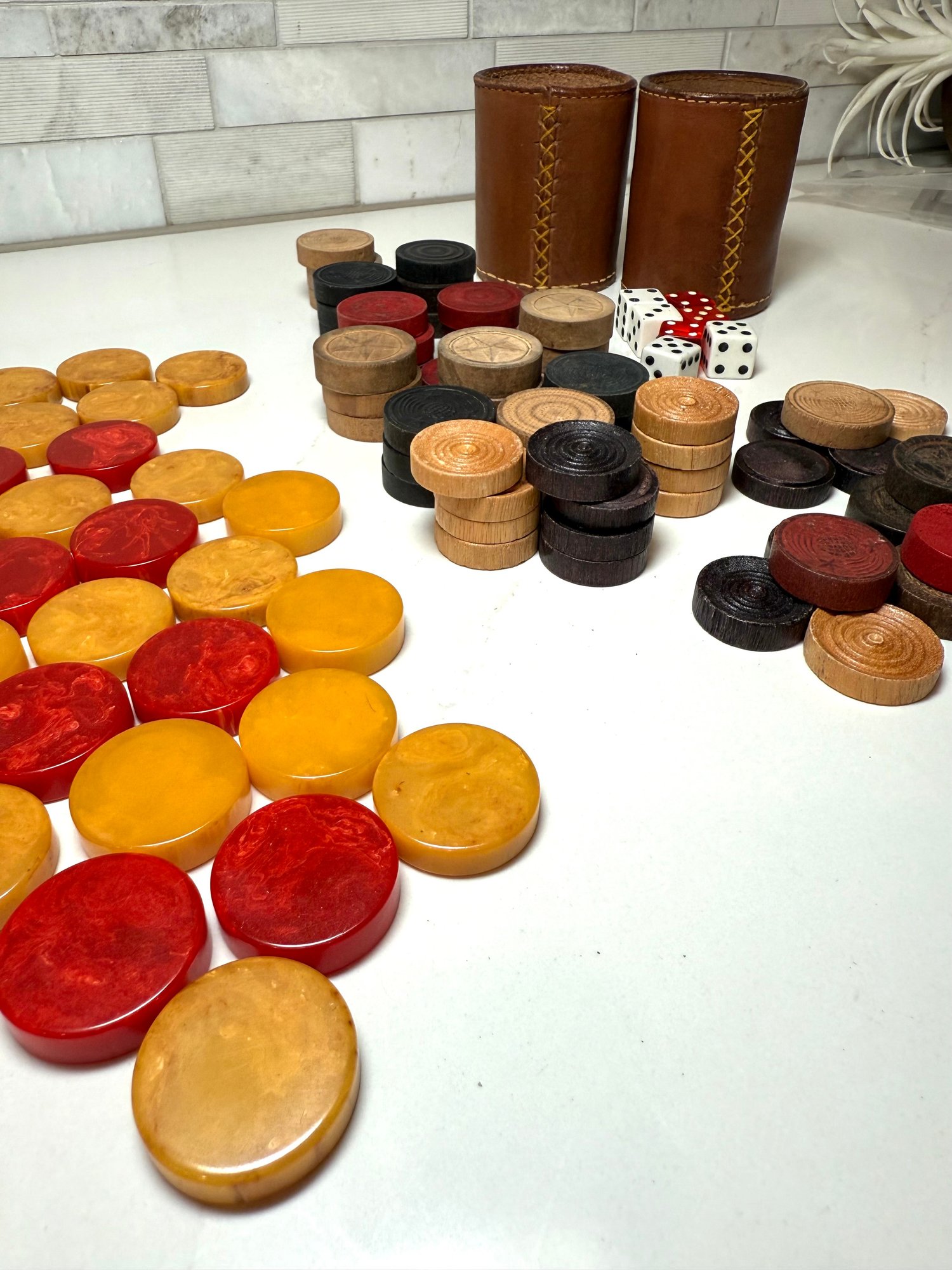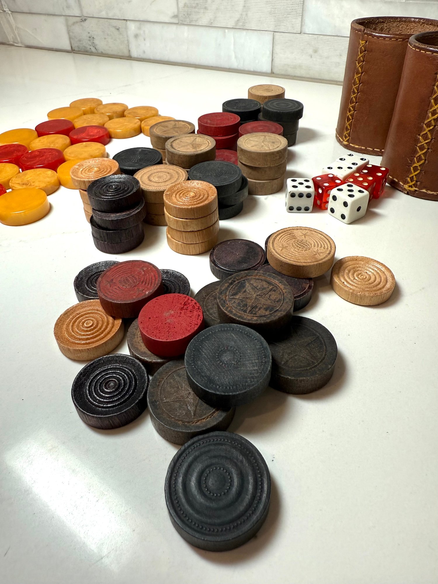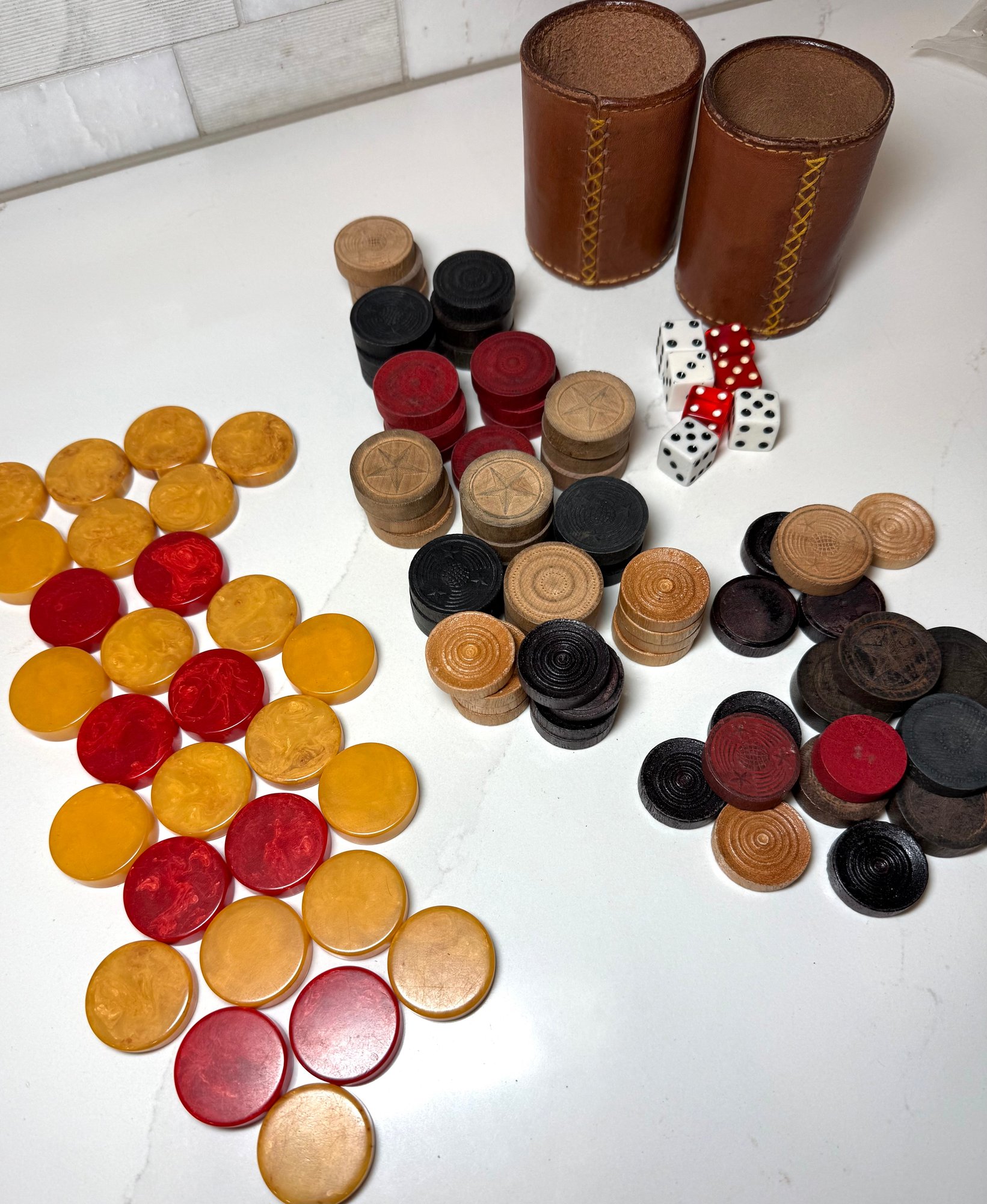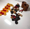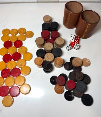 Vintage Game Pieces: Bakelite Pucks for backgammon, Wood Checkers, Dice and 2 stitched leather cups for throwing dice! Let the games begin!