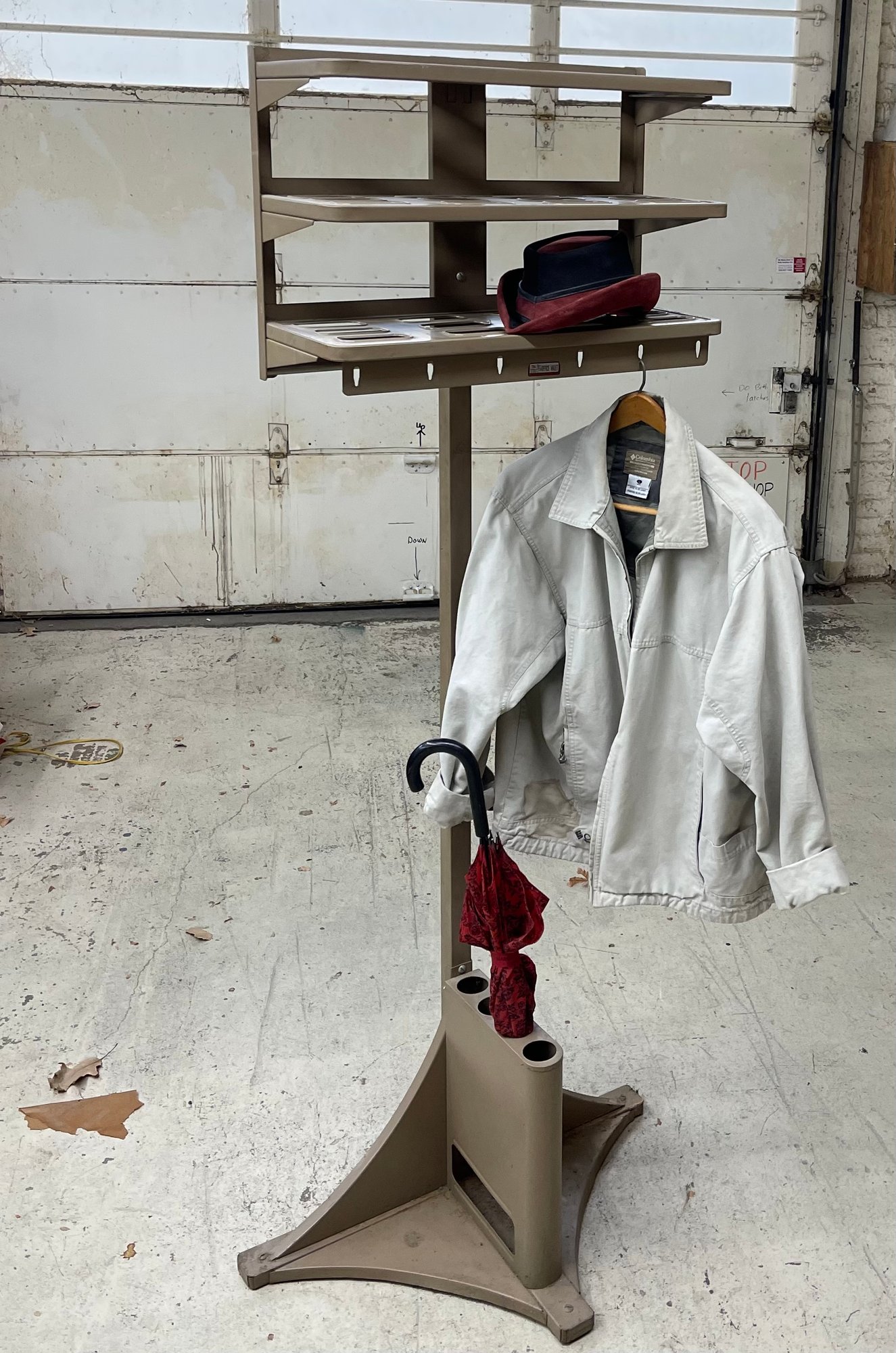 Vintage Industrial Trademarked " Office Valet" Coat rack. Fabulous industrial piece- holds coats hats, gloves etc and all go the umbrellas, canes walking sticks etc. MFR by Vogel-Peterson Co. Of Elmhurst ILL. Large, well built and relatively heavy. 73 tall 24 wide and approx 15 deep