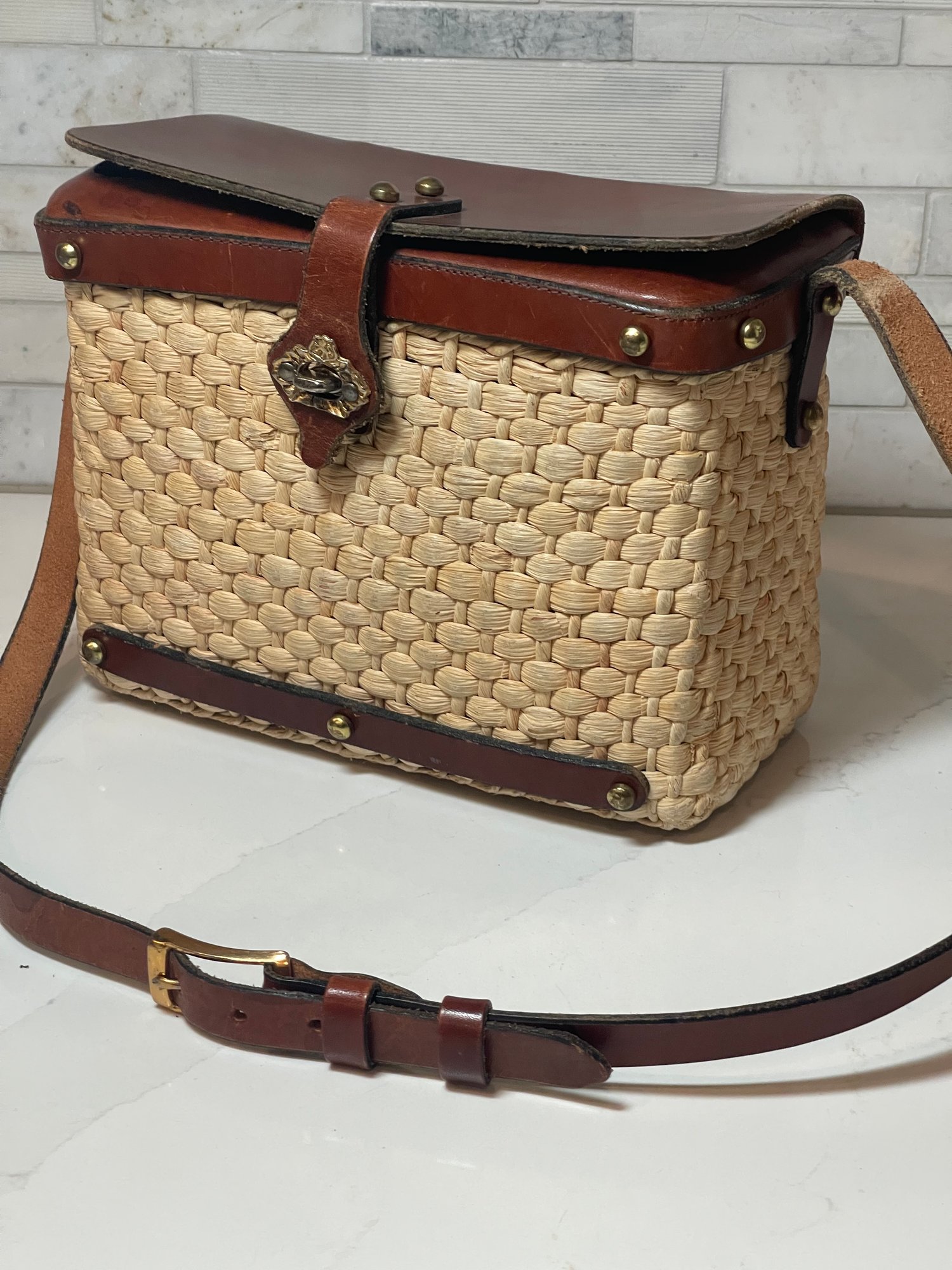 So charming and a truly vintage/fashion forward hand bag. Brass feet, nailhead and latch. genuine leather trim and strap. 9 wide x 7 high x 4.5 deep