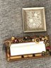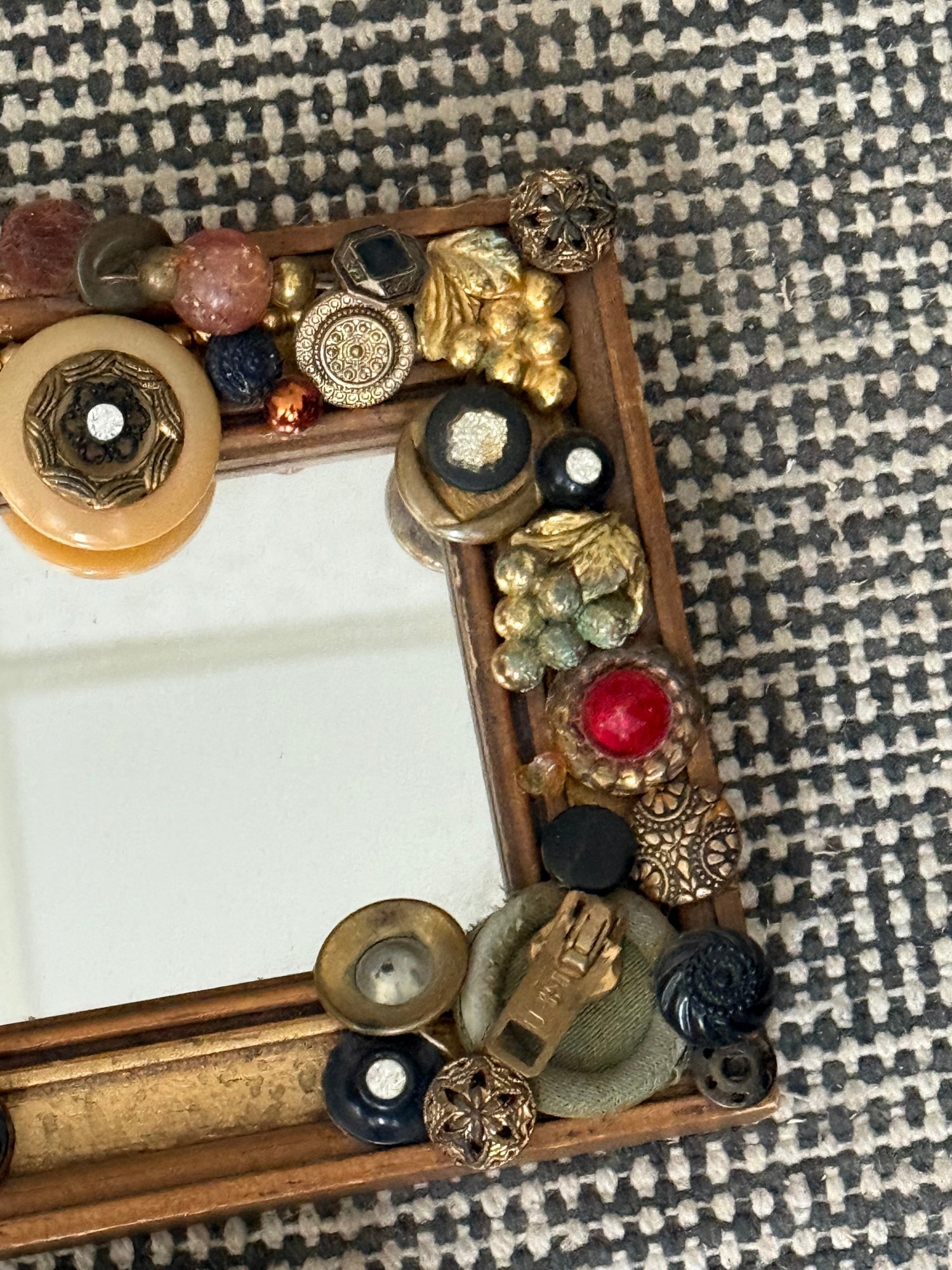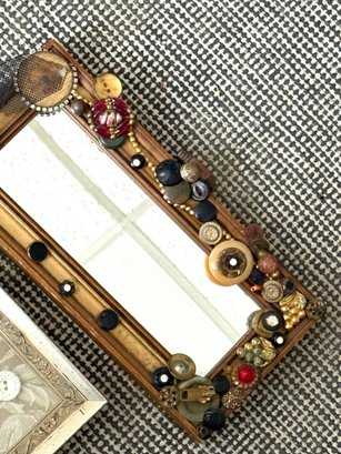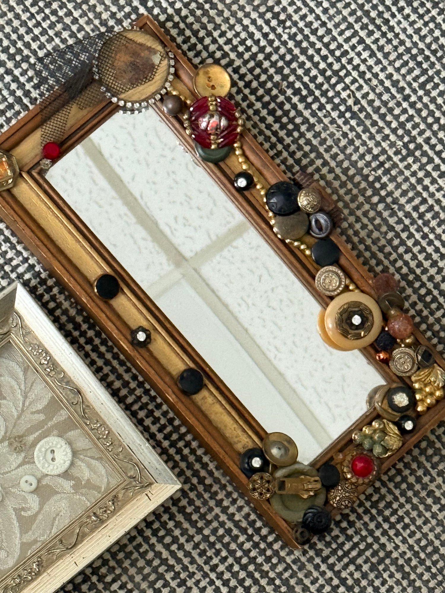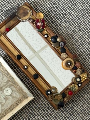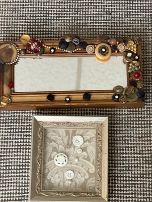 Framed buttons, 5 x 5.75, Embellished framed mirror is 9.5 x 4.75
