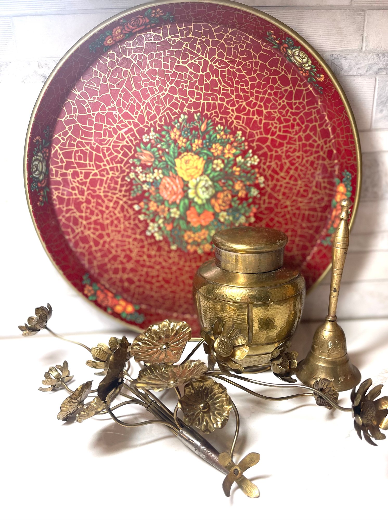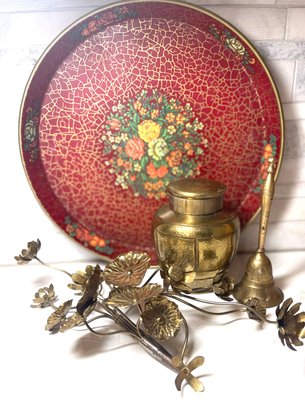 Vintage Red Metal Tray With Brass Bell, Lidded Urn And Flower Sculptures