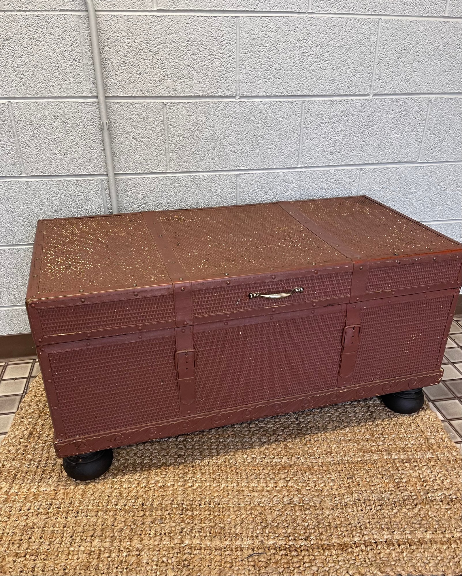 Lots of storage, bun feet, wicker like trunk/coffee table. Painted earthy red with solid wood bun feet. 40 x 20 x 20. Large area for storage, heavy piece. Has som paint chipping but in solid condition. Handles on either side and on front lid.