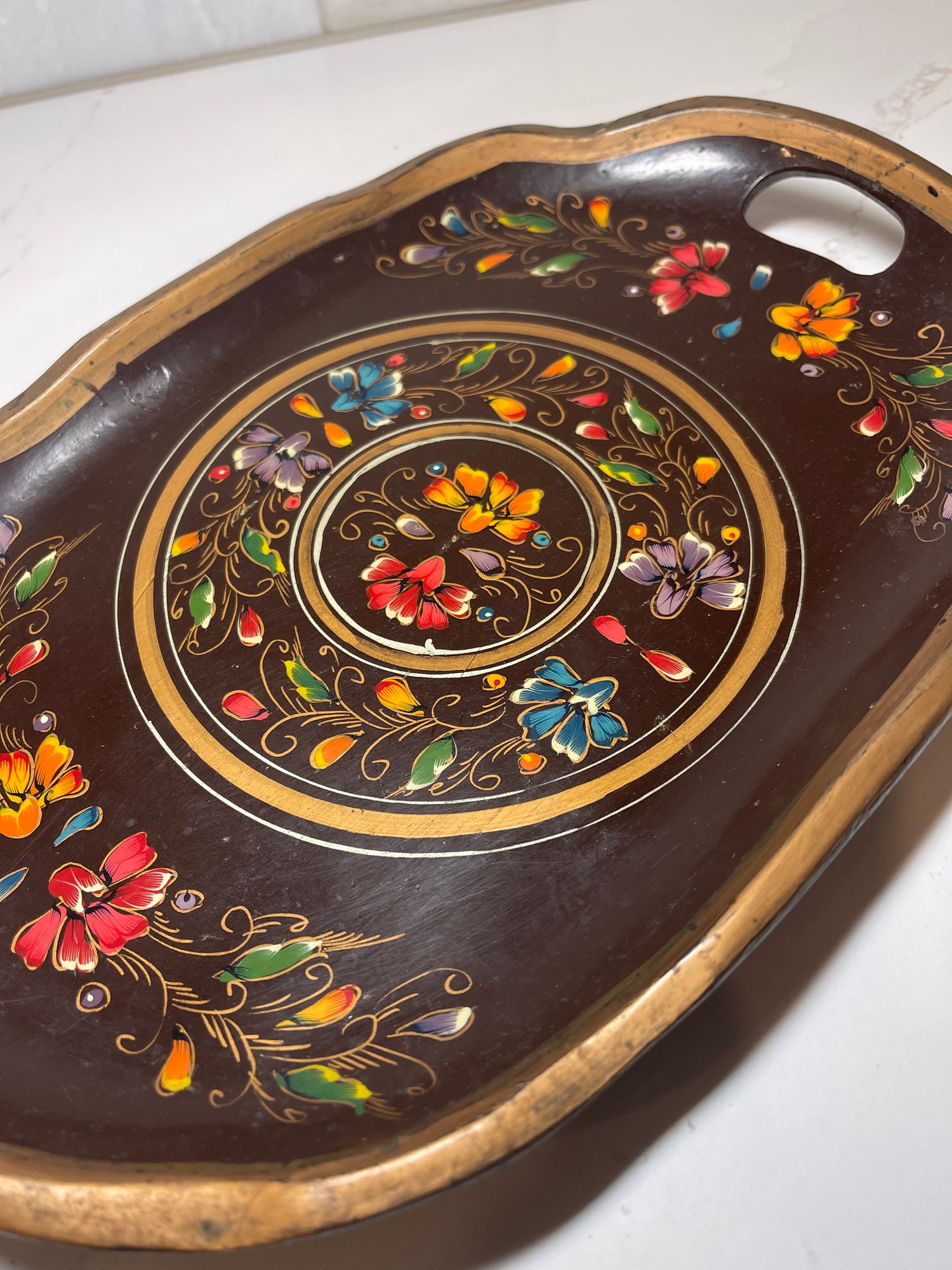 Brightly colored Hand Painted floral Tray. Mexican inspired with handle cut outs on each end. 13.5 x 9.5