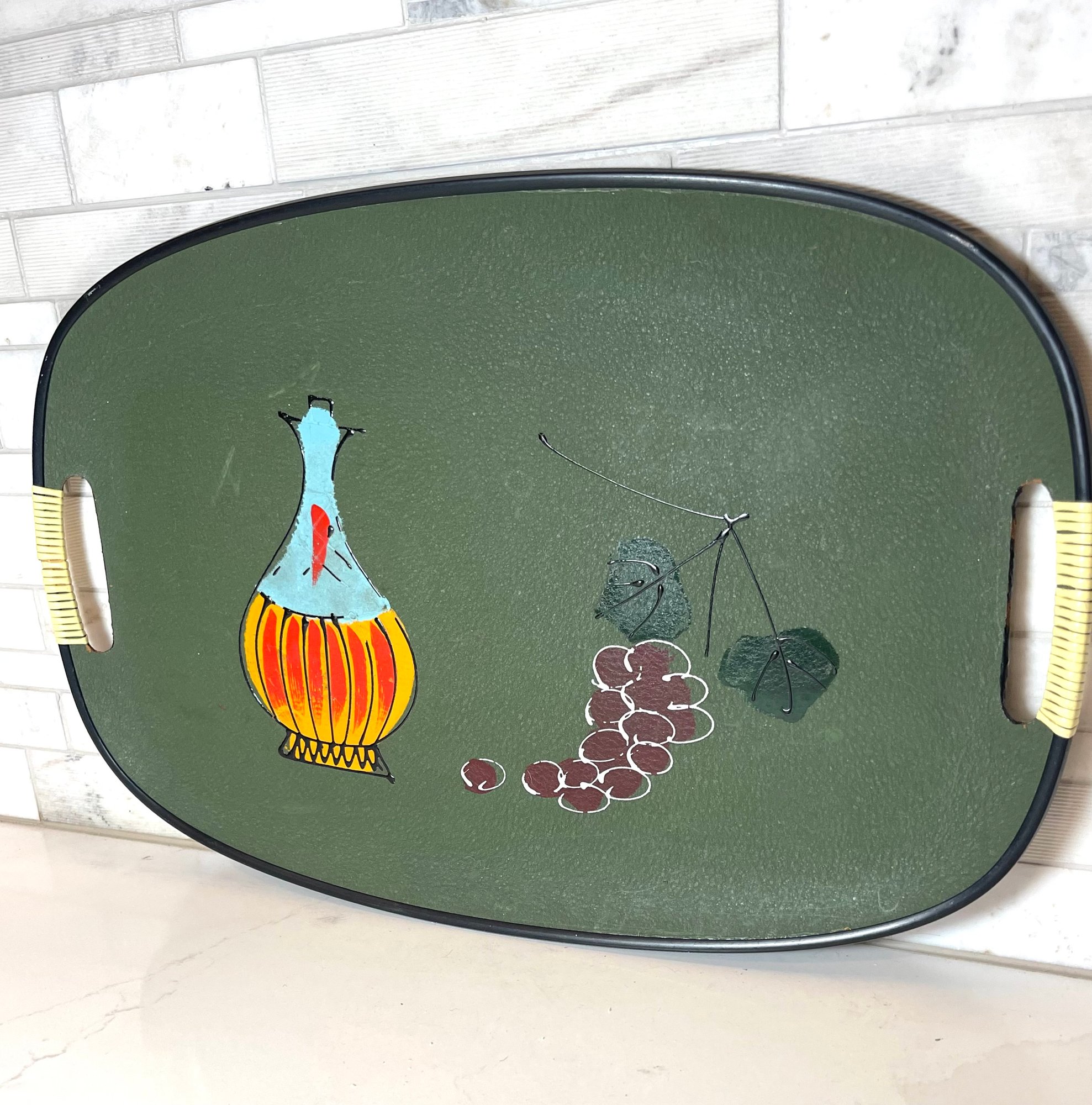 VTG Mid Century Painted Resin Tray, Wine Decanter And Grapes Motif. Great vibrant color, retro vibe. 18 x 11.5
