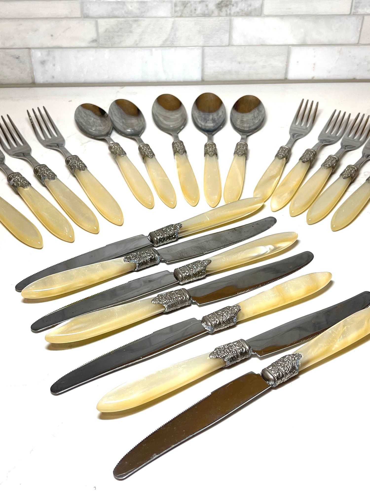 Vtg Pearlized Ivory Flatware With Ornate Siver Band