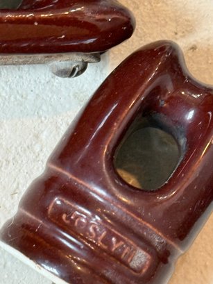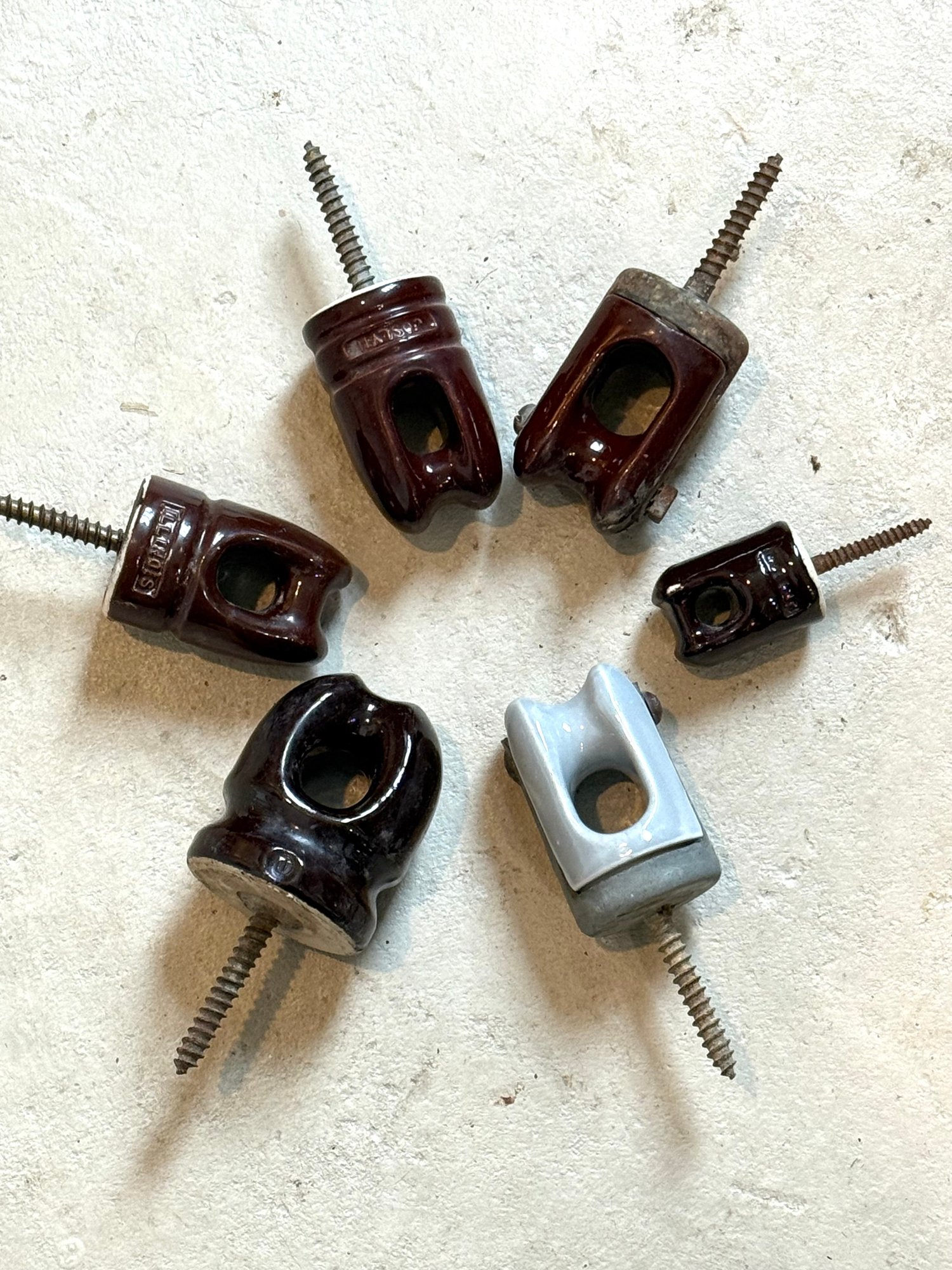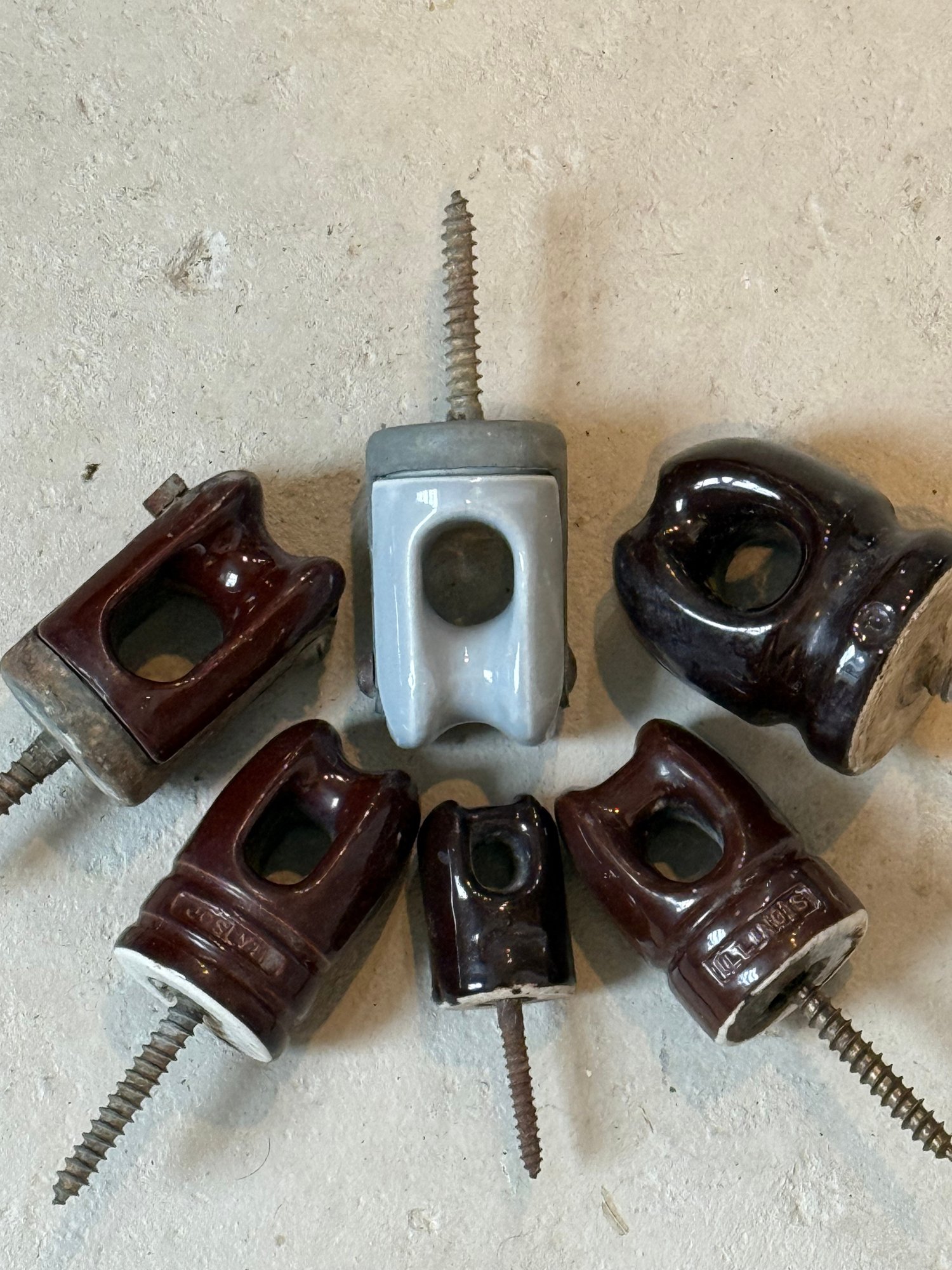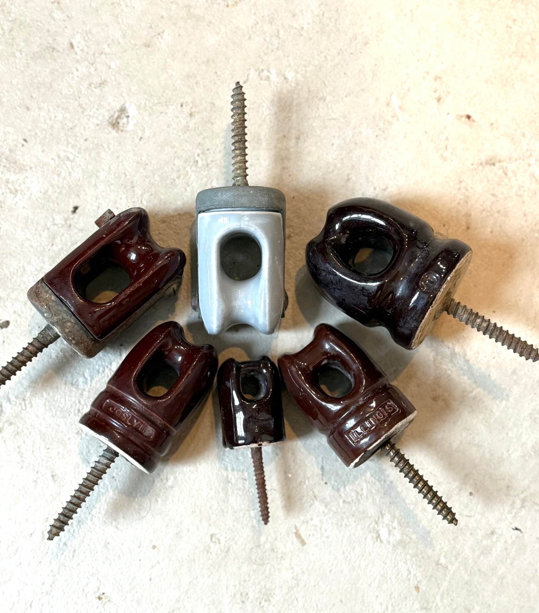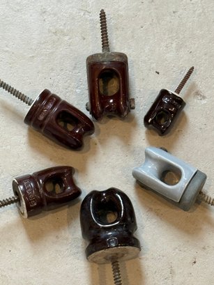 Assortment of 6 Ceramic Porcelain Electrical Insulator Cups. Some Marked, Illinois, Joslyn etc. Various sizes, rare gray.