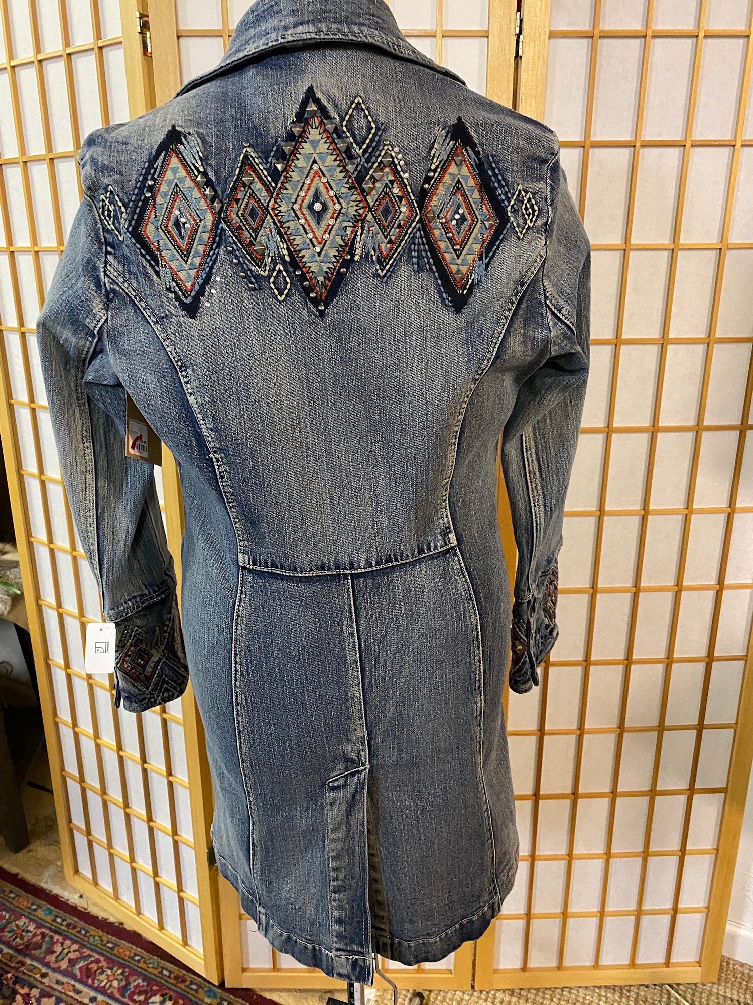 Fantastic design in this Zenium long jean jacket with embroidered cuffs and back