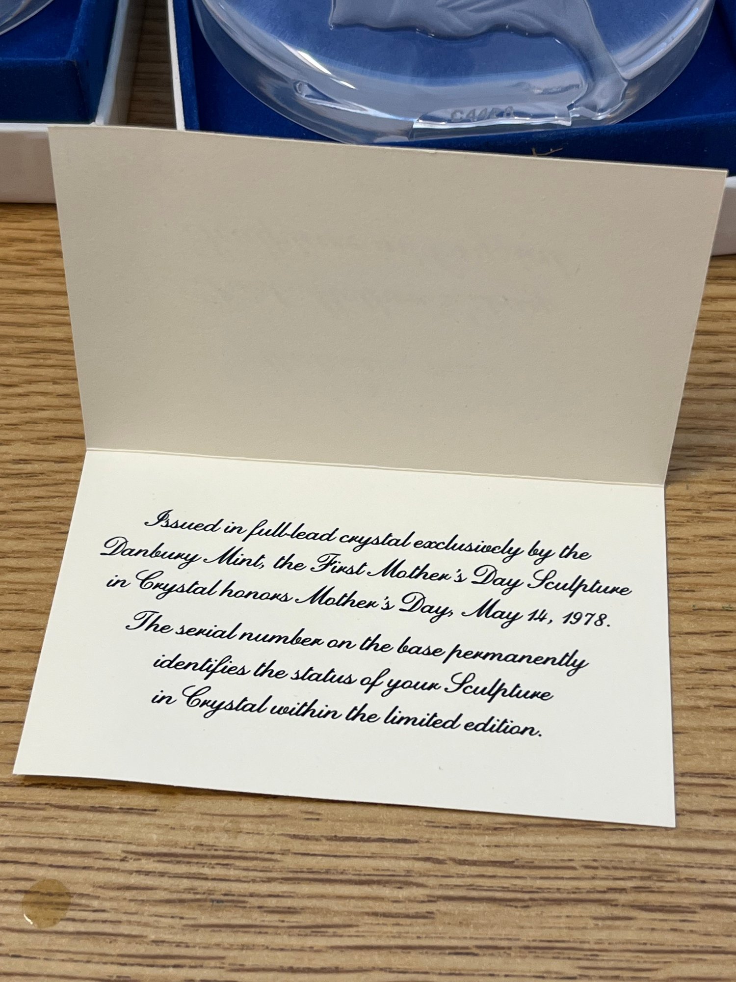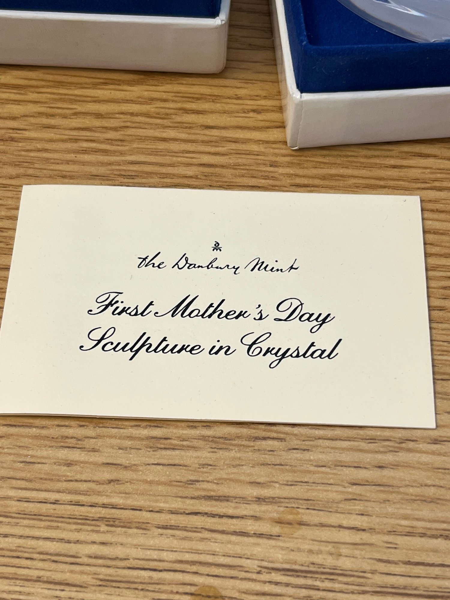 A pair of Danbury Mint Mother's Day paperweights arrives here as a quietly charming ensemble — the kind of sentimental collectible that once graced a cherished display shelf and carries the warmth of that history with it. Danbury Mint has long been synonymous with finely crafted limited edition pieces designed to honor life's most meaningful occasions, and these Mother's Day offerings are no exception. Each paperweight speaks to the brand's signature attention to decorative detail, making them equally at home as functional desk accessories or standalone display pieces. Whether you're an established Danbury Mint collector rounding out a themed grouping or a thoughtful buyer seeking a meaningful vintage gift, this pair represents a rare opportunity to acquire two pieces together — a combination that amplifies their collective appeal and display potential. Condition details will be confirmed upon request, but the inherent desirability of the Danbury Mint name ensures strong collector interest. Bid with confidence on this endearing set.