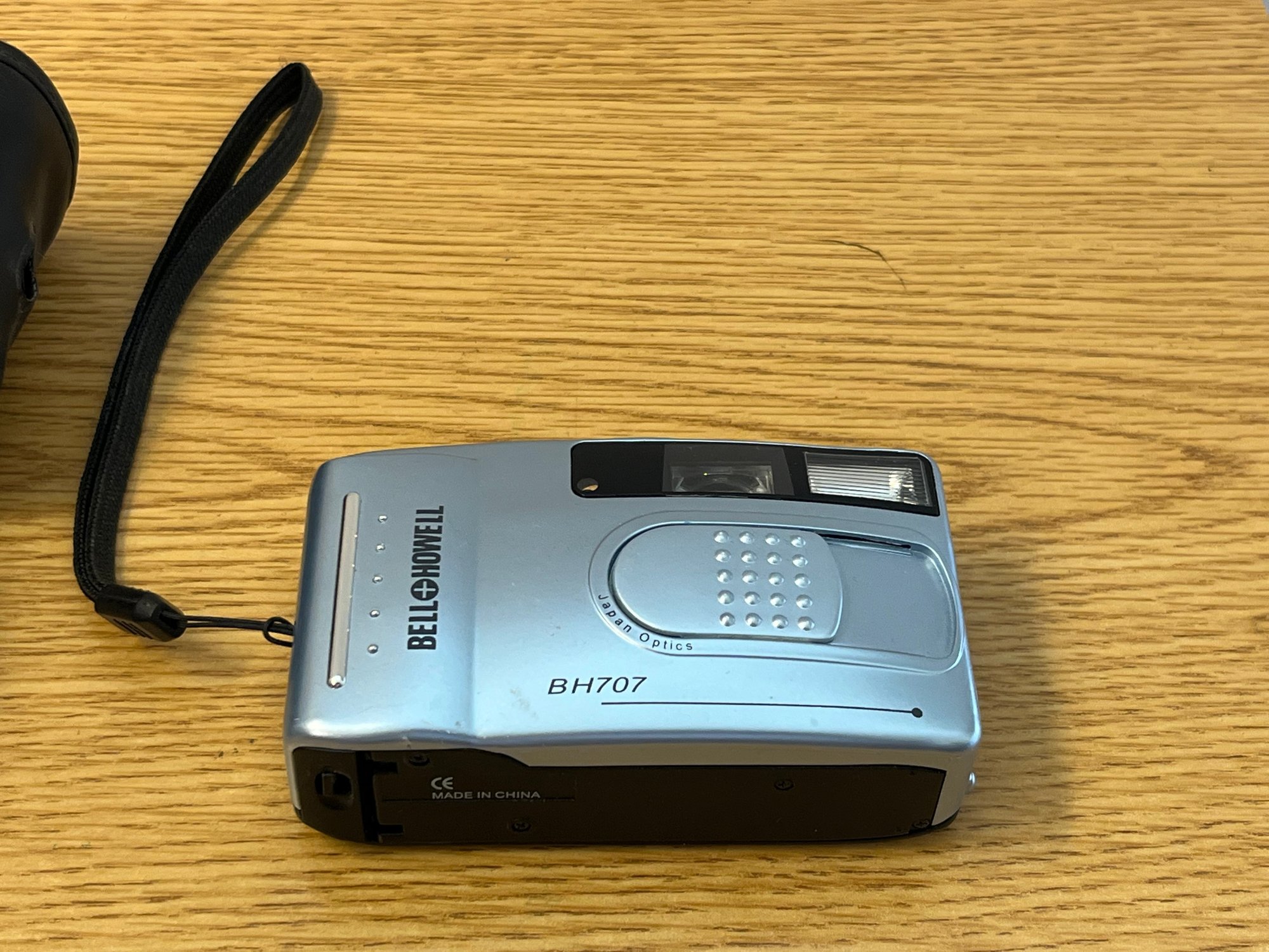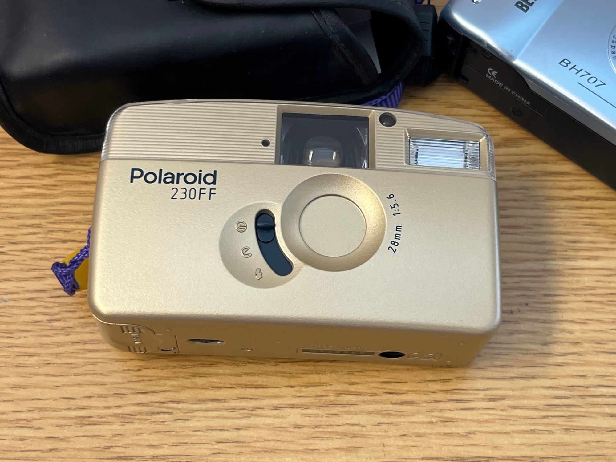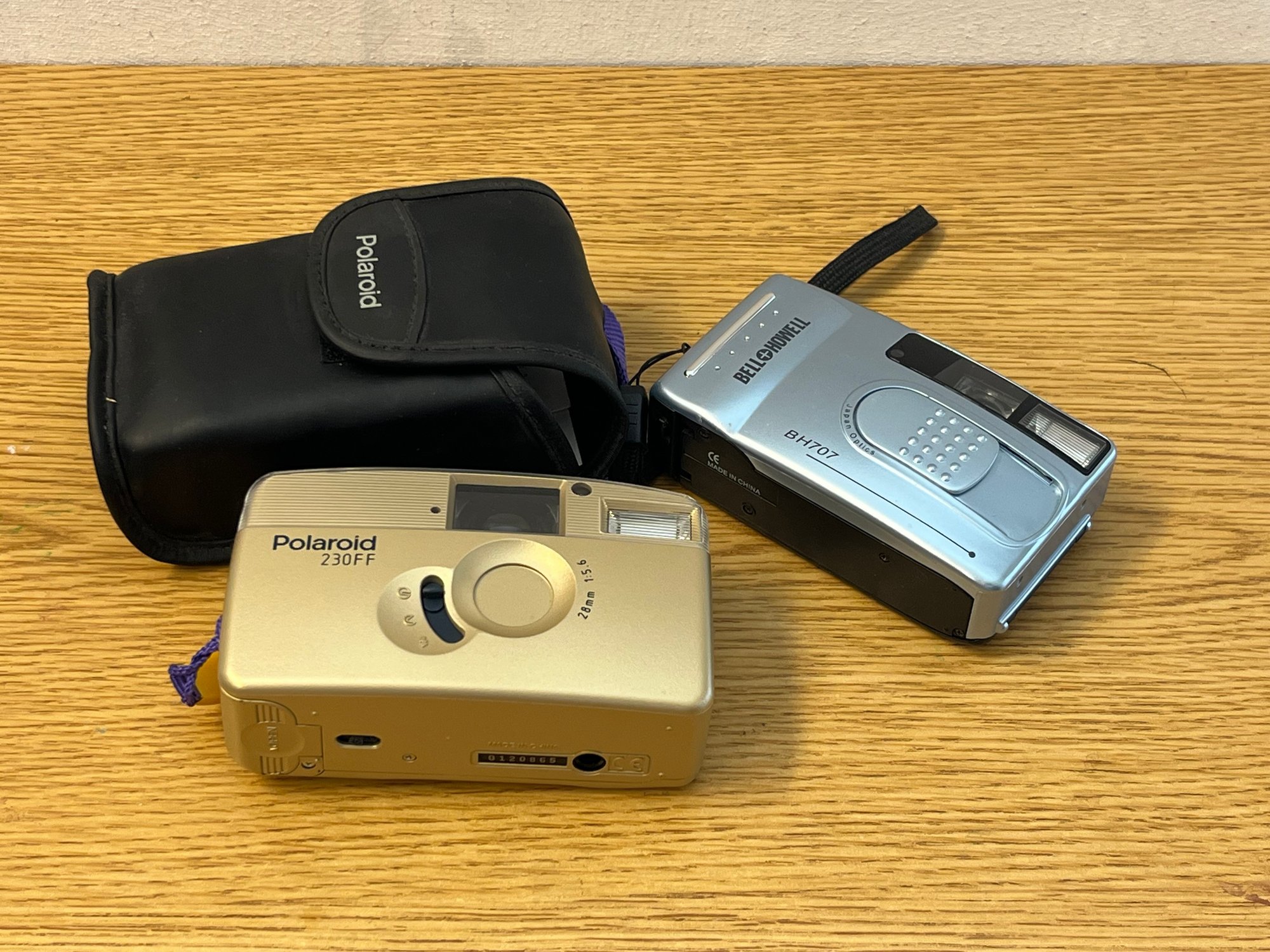 Here is a compelling pairing for the serious collector or analog photography enthusiast: two iconic relics from the golden age of instant imaging, offered together as a single, irresistible lot. The Polaroid 230FF, fitted with a 28mm f/5.6 lens, represents the elegant simplicity that made Polaroid a household name — a folding-body classic that carries the unmistakable design language of mid-century consumer ingenuity. Alongside it, the Bell & Howell BH707 brings its own distinct character, a testament to an era when rival manufacturers competed fiercely for a share of the instant-film market.