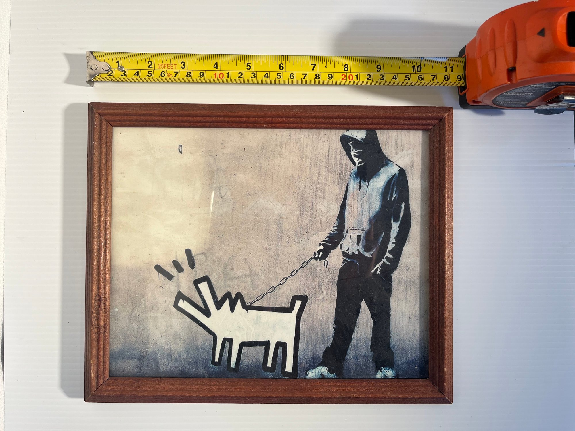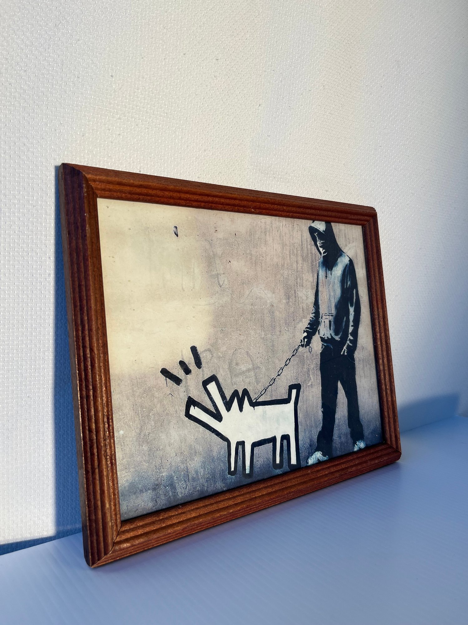 Prepare to elevate your art collection with this extraordinary Banksy print that captures the provocative essence of contemporary street art. This exceptional piece showcases Banksy's iconic style, featuring a masked youth walking a stylized dog reminiscent of Keith Haring's distinctive aesthetic – a powerful commentary on urban culture and artistic rebellion.
