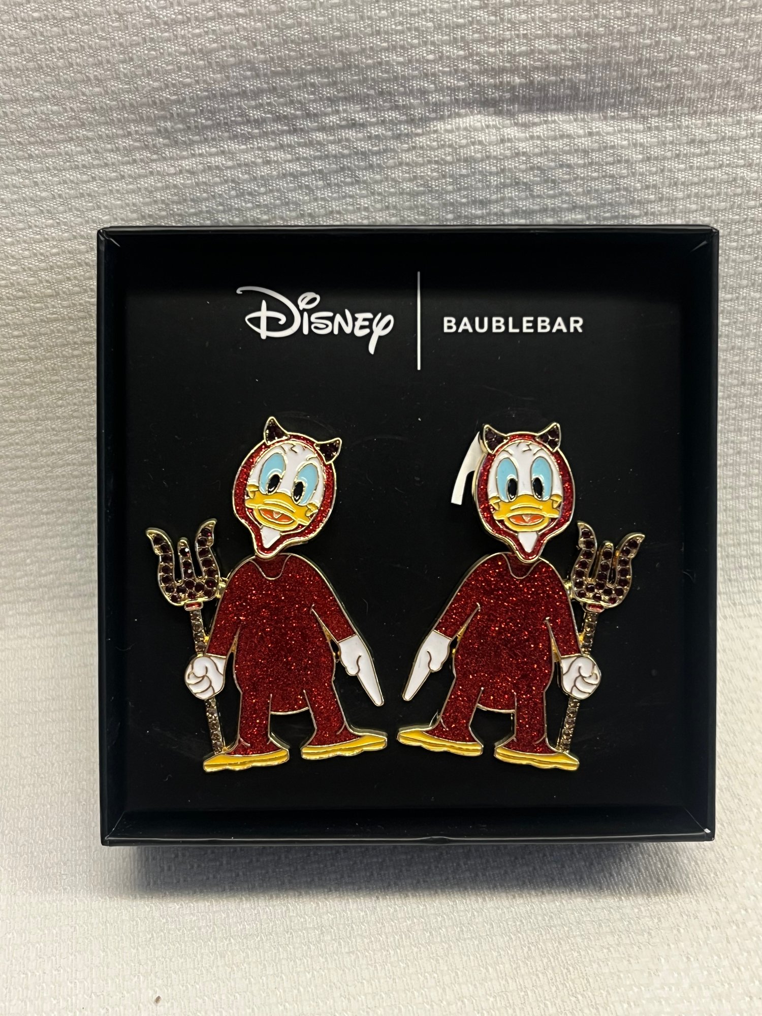 Unleash your inner Disney villain with these absolutely adorable BaubleBar x Disney Donald Duck Devil Halloween Costume Earrings! A must-have for Disney collectors, Halloween enthusiasts, and fashion-forward fans, these brand-new earrings capture the mischievous spirit of everyone's favorite temperamental duck. These playful earrings transform Donald Duck into a delightfully devilish character, complete with adorable devil horns and a cheeky Halloween-inspired aesthetic. Crafted with BaubleBar's signature attention to detail, these earrings are a conversation starter that bridges pop culture, fashion, and nostalgic Disney magic.