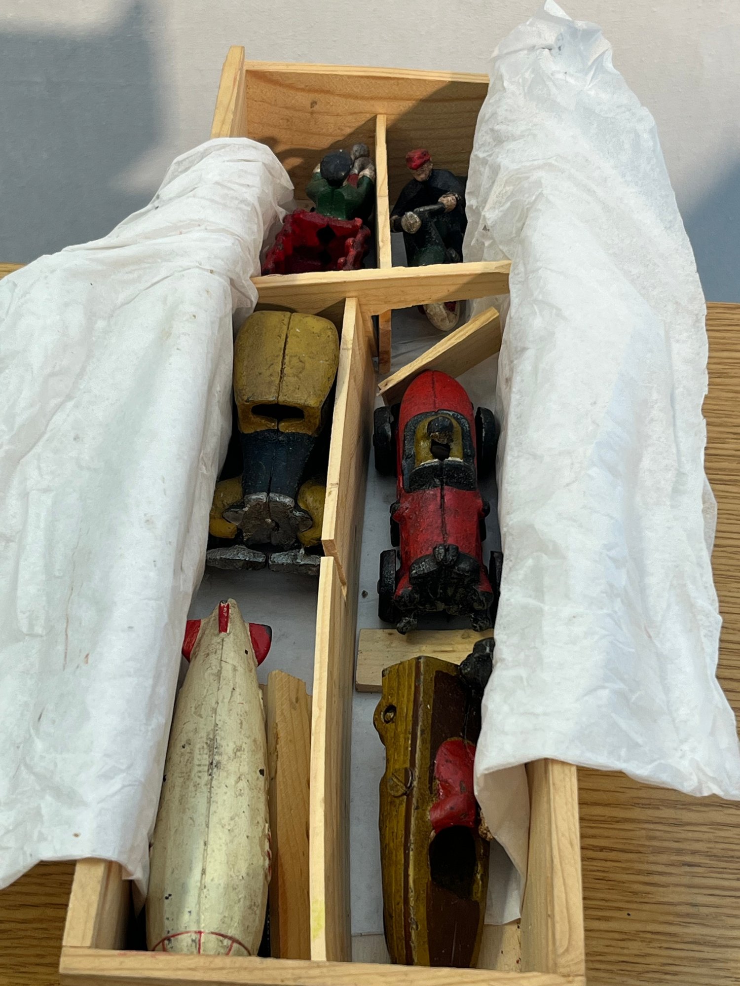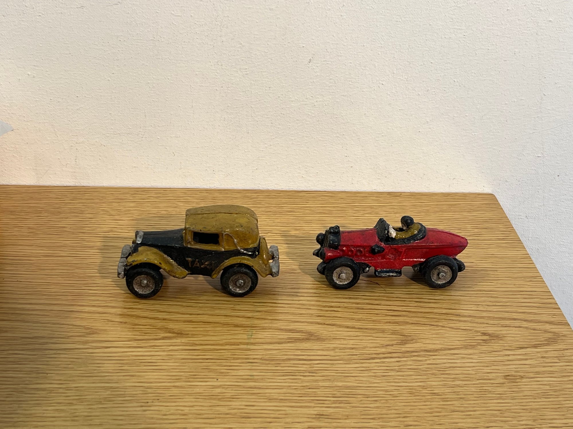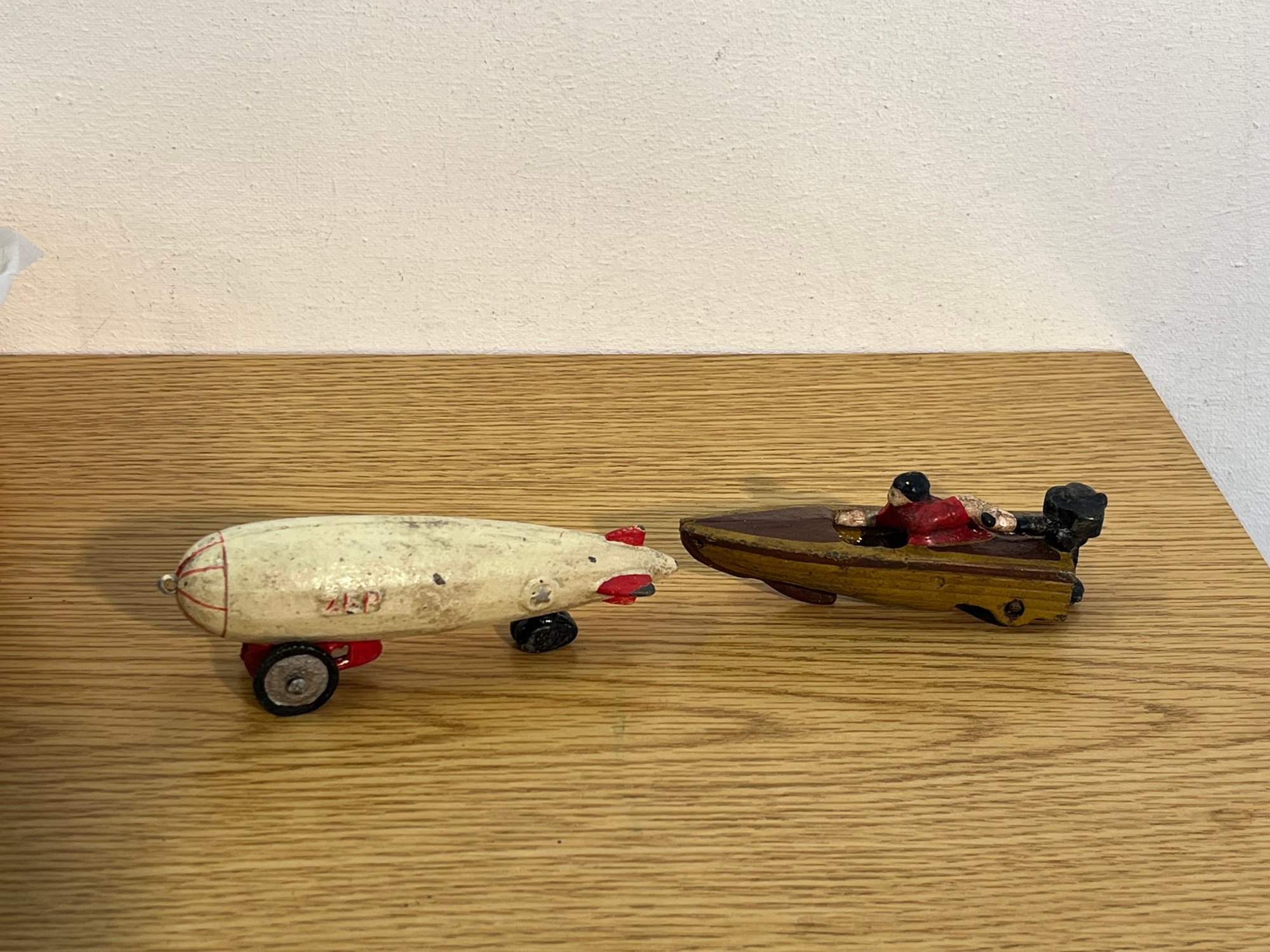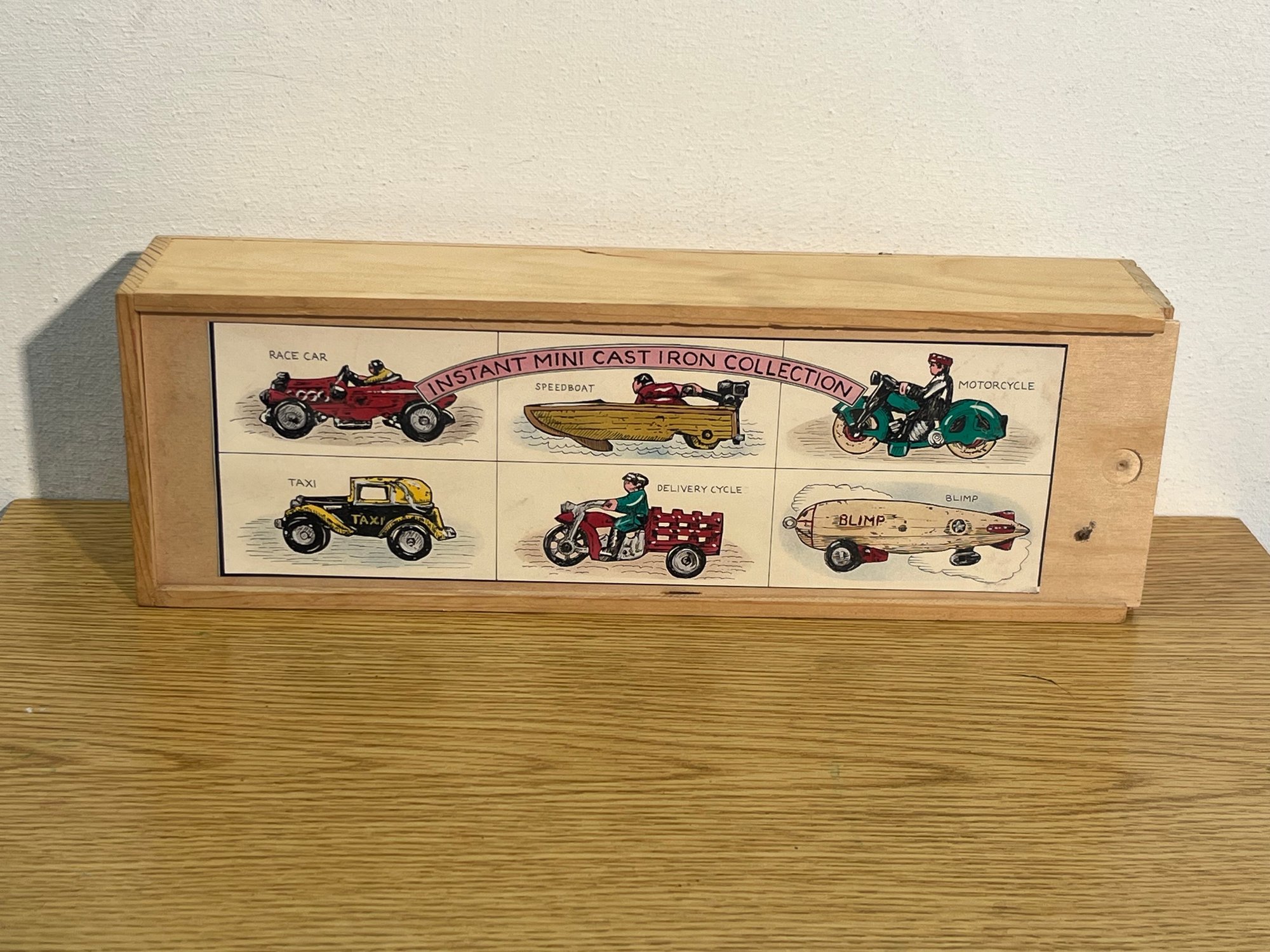 Here is a charming ensemble that will delight the seasoned collector and the nostalgic alike. This six-piece mini cast iron vehicle collection arrives as a complete, ready-to-display lot — a race car poised for the starting line, a sleek speedboat built for open water, a classic motorcycle frozen mid-throttle, a quintessential taxi straight from a golden-era cityscape, a hard-working delivery cycle, and a majestic blimp drifting above it all.