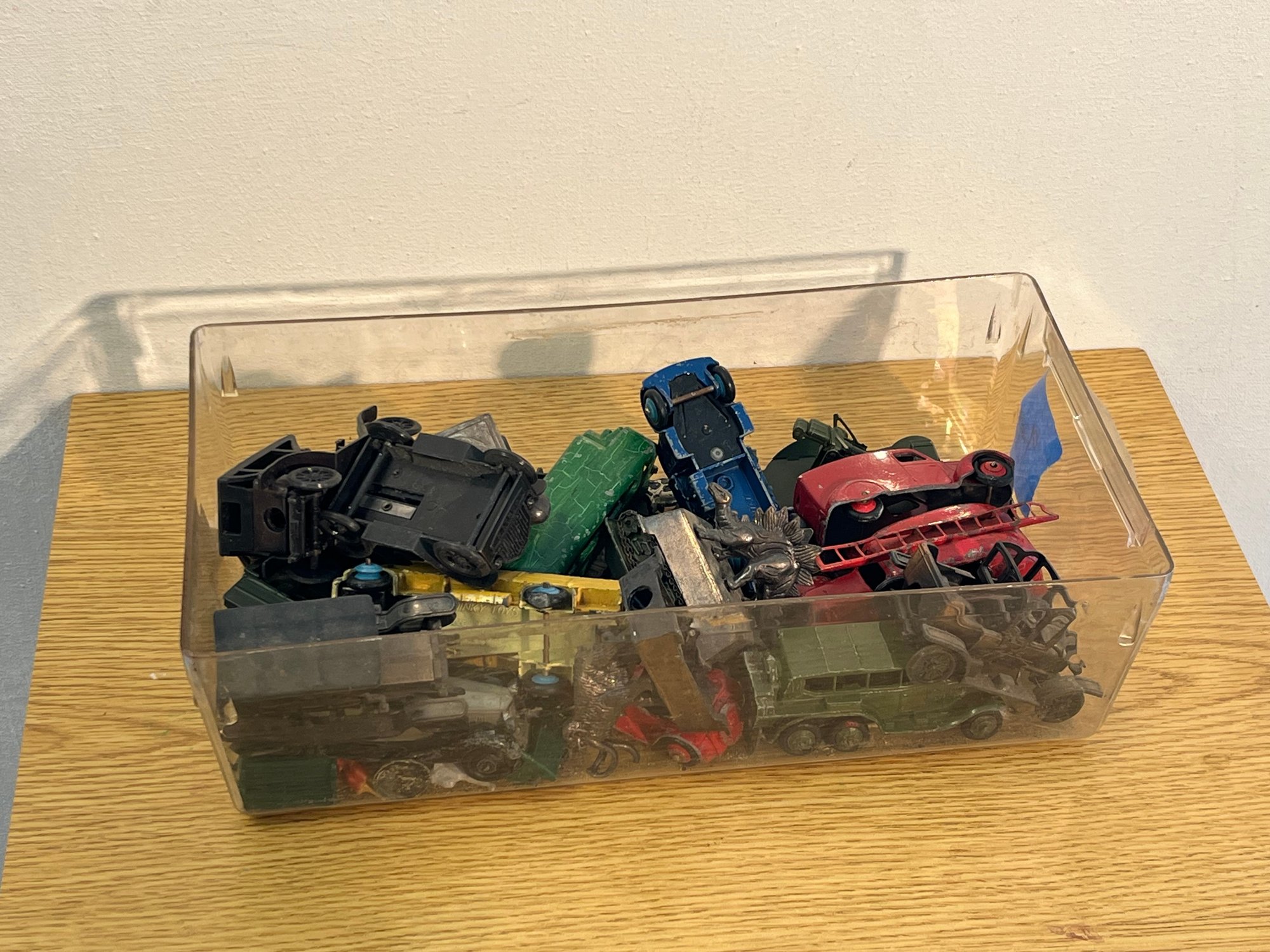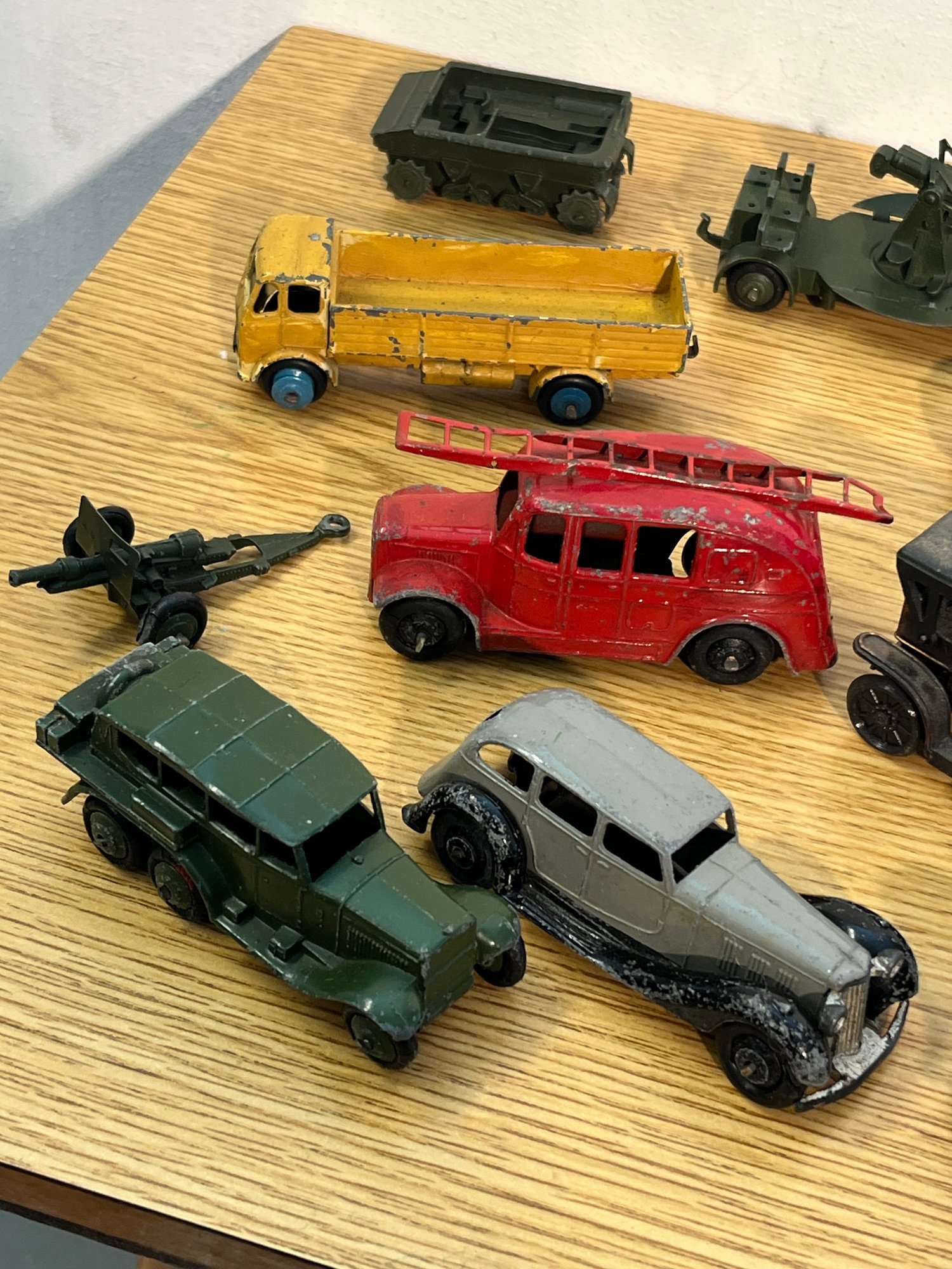 A rare opportunity to acquire a cohesive collection of approximately 18 die-cast and lead alloy miniature vehicles, strongly consistent with British manufacture spanning the 1930s through 1950s — the golden age of the miniature vehicle trade. Dinky Toys provenance is visually compelling throughout, with several civilian and commercial pieces displaying the crisp grille detailing and casting quality characteristic of late pre-war and early post-war production. Military examples — including a tracked artillery carrier, anti-aircraft gun platform, light tank, and olive-green troop transport — present with honest, original paint wear that collectors of the period actively seek.