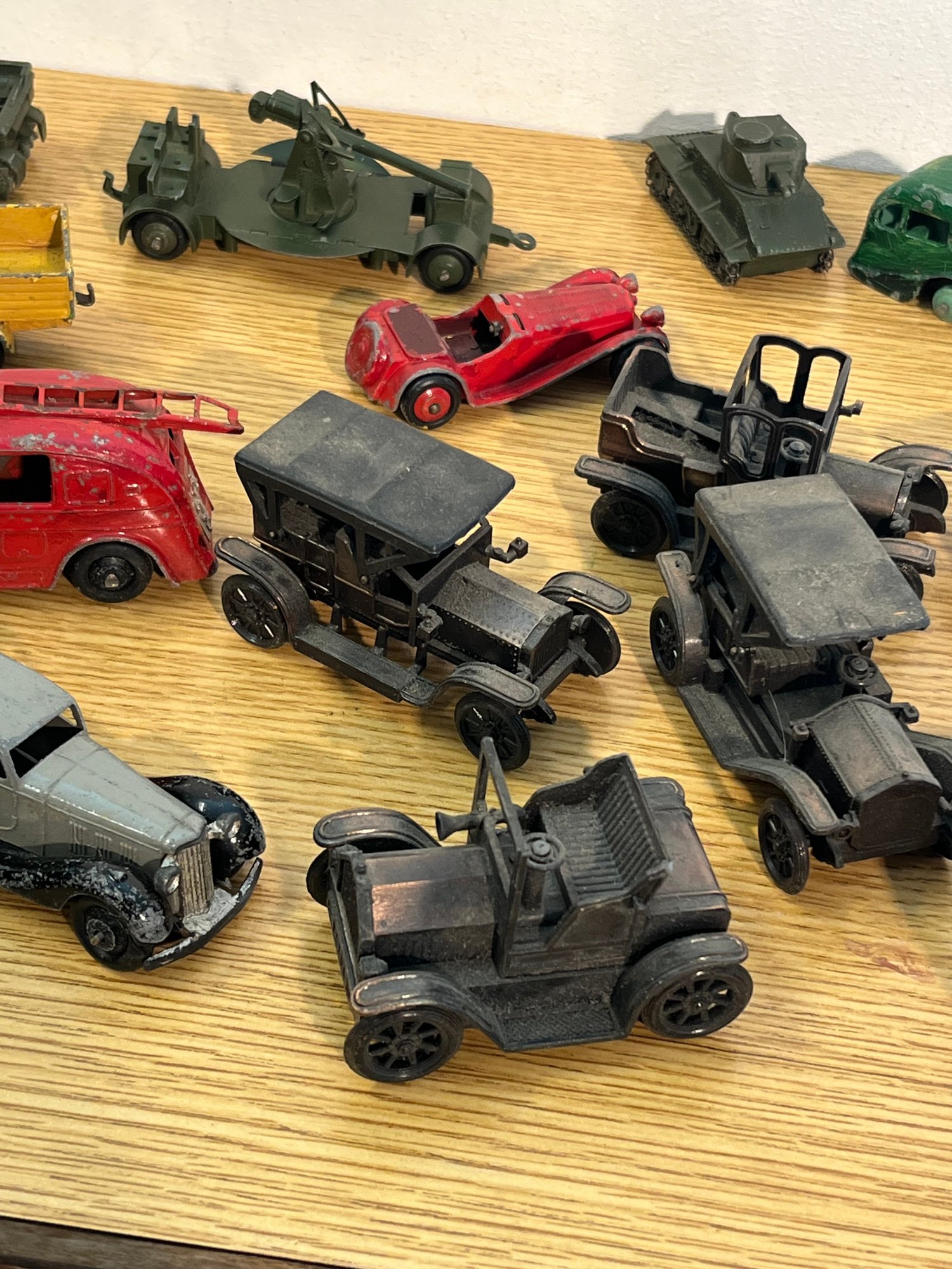 Most compelling are the three to four earlier lead alloy castings in the lower grouping: blackened, unfinished, with spoked wheels and open-cab profiles consistent with pre-Dinky Hornby-era manufacture — genuinely rare survivors in any condition.
