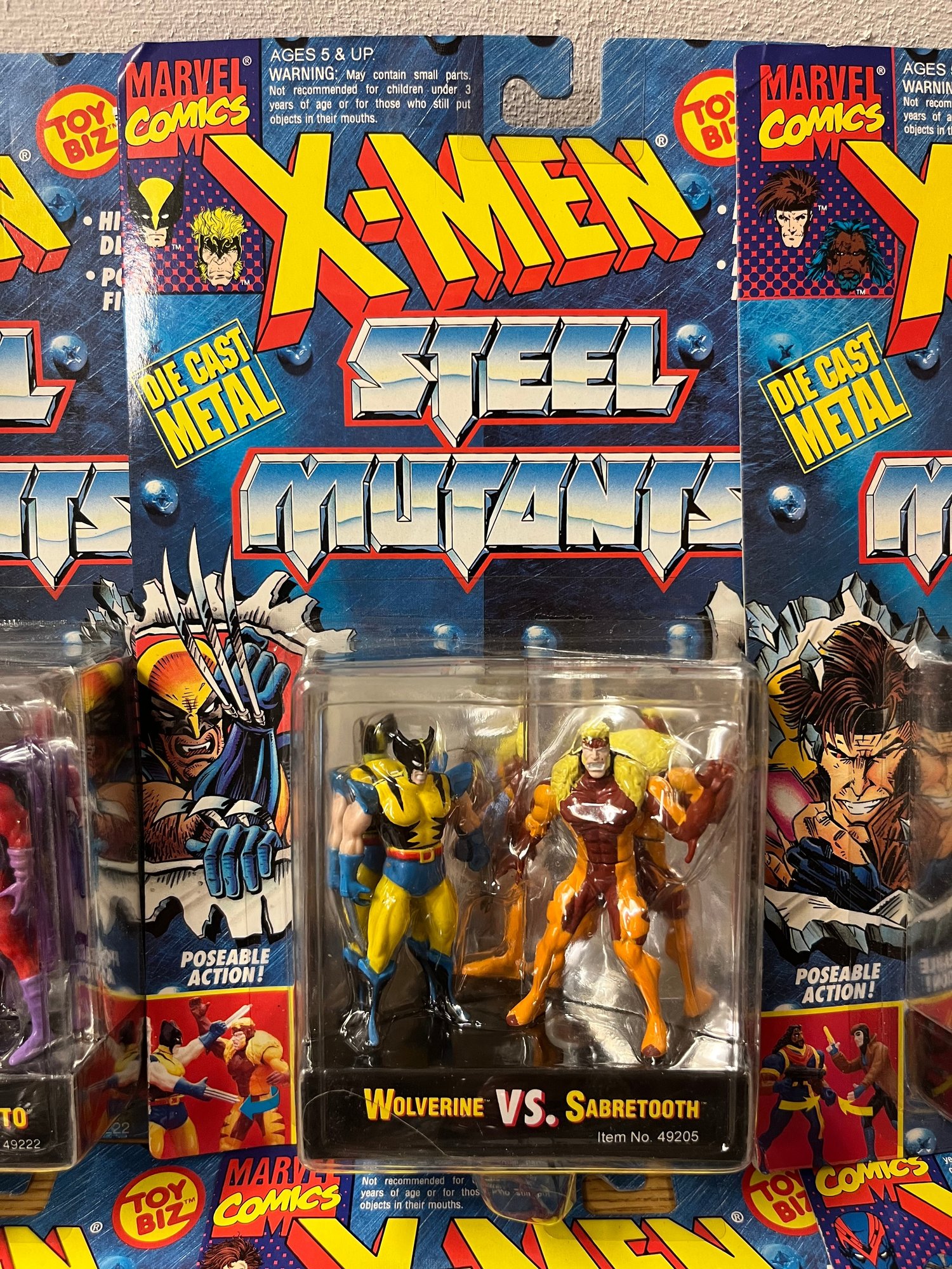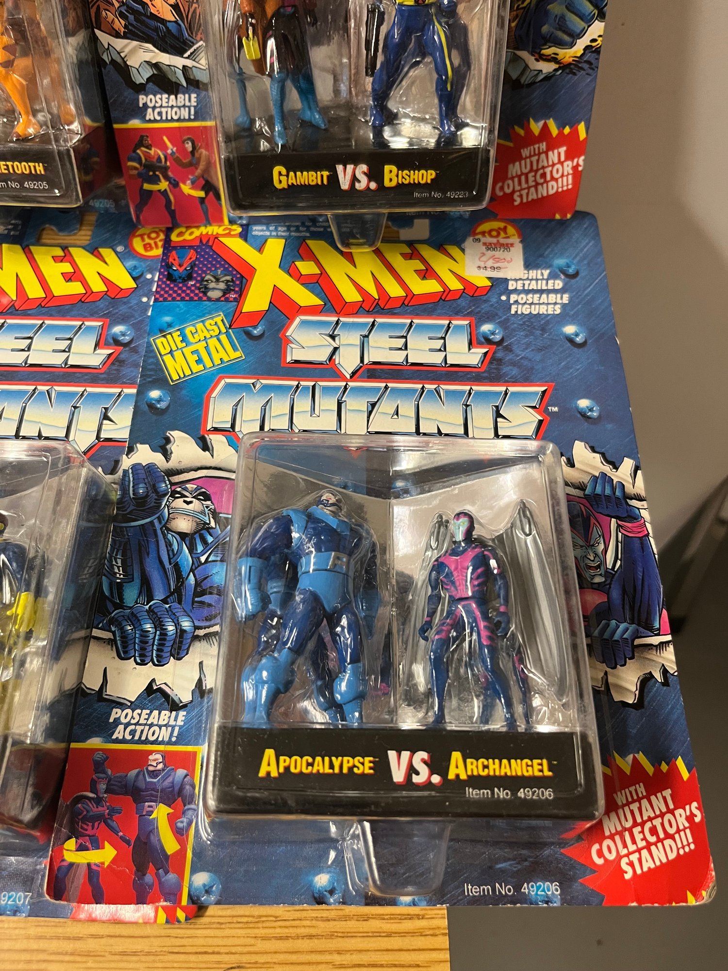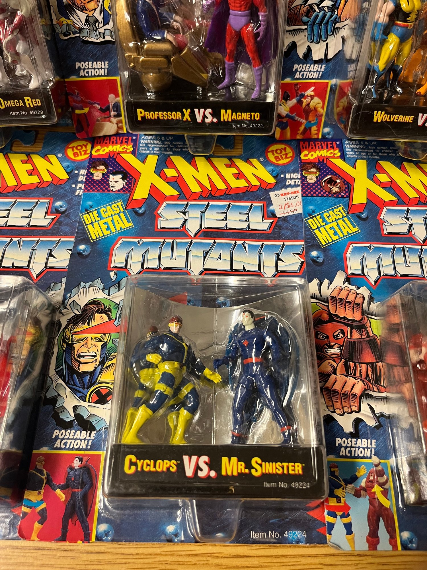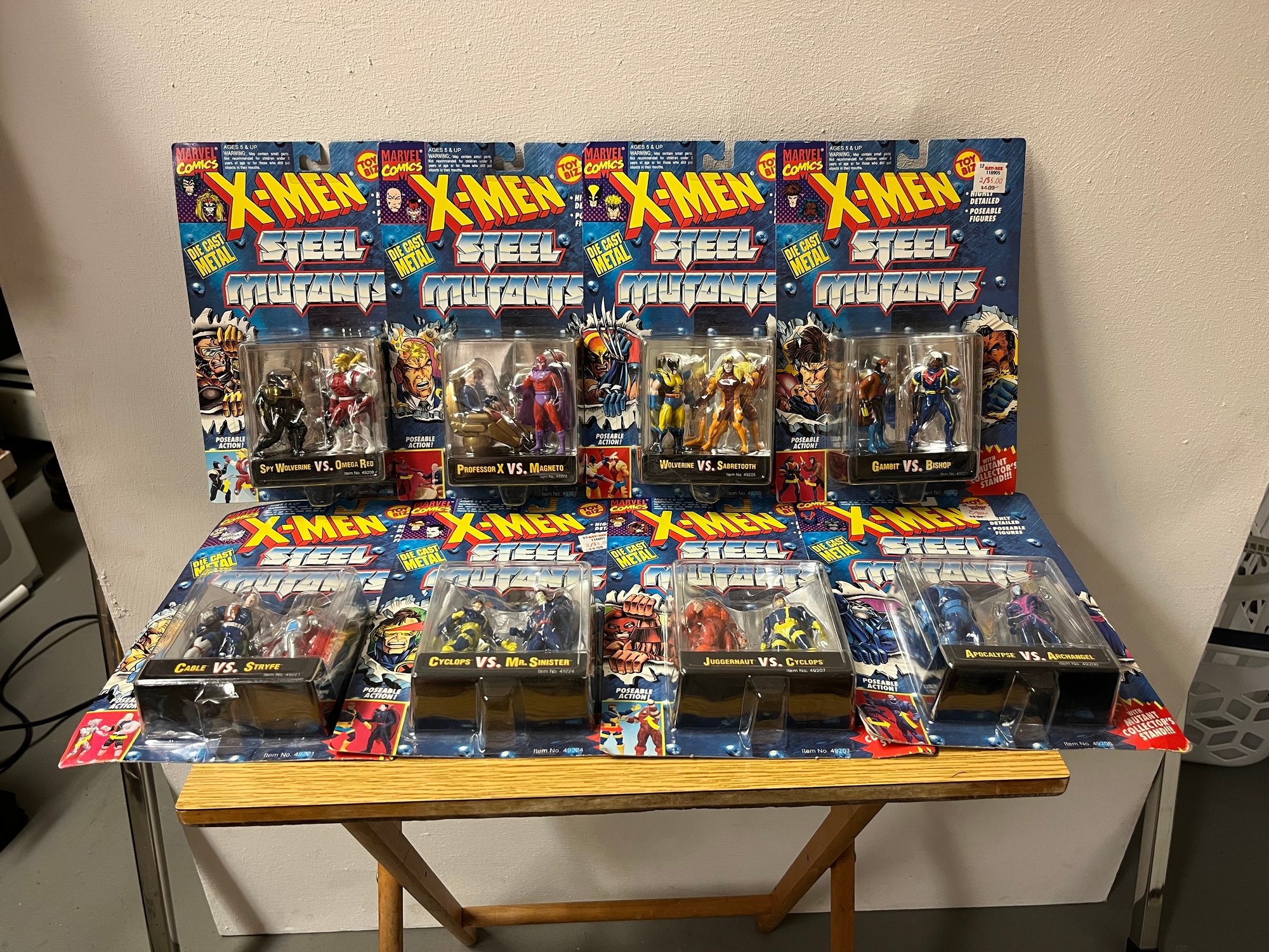 Presented here is a complete run of X-Men Steel Mutants — Marvel's beloved die-cast figure series that transformed the mutant universe into weighty, palm-sized collectibles built to outlast generations. This remarkable assemblage spans the full dramatic breadth of the X-Men mythology, uniting eight two-pack sets: Spy Wolverine vs. Omega Red, Professor X vs. Magneto, Wolverine vs. Sabertooth, Gambit vs. Bishop, Cable vs. Stryfe, Cyclops vs. Mr. Sinister, Juggernaut vs. Cyclops, and the crown jewel pairing — Apocalypse vs. Archangel.