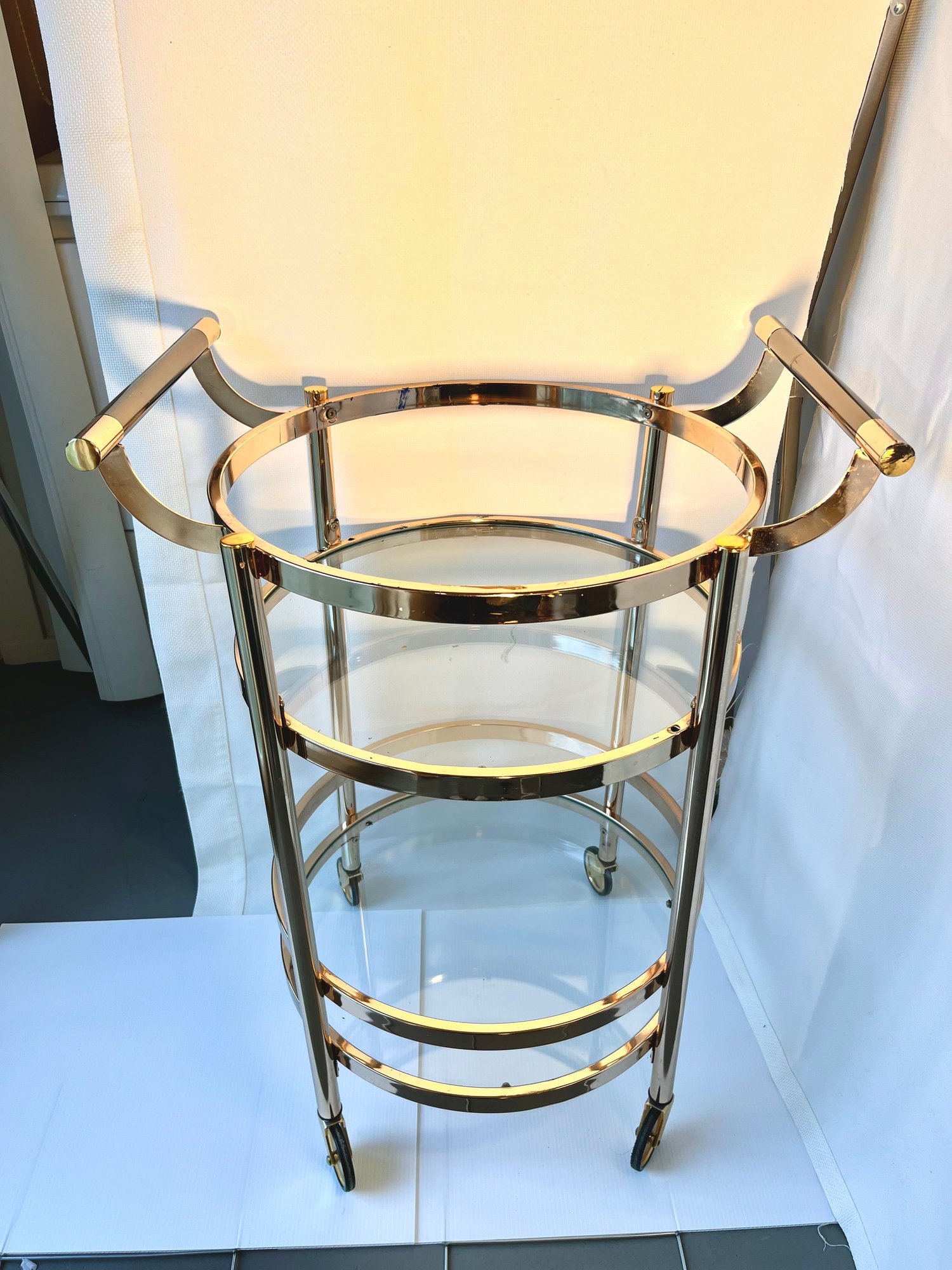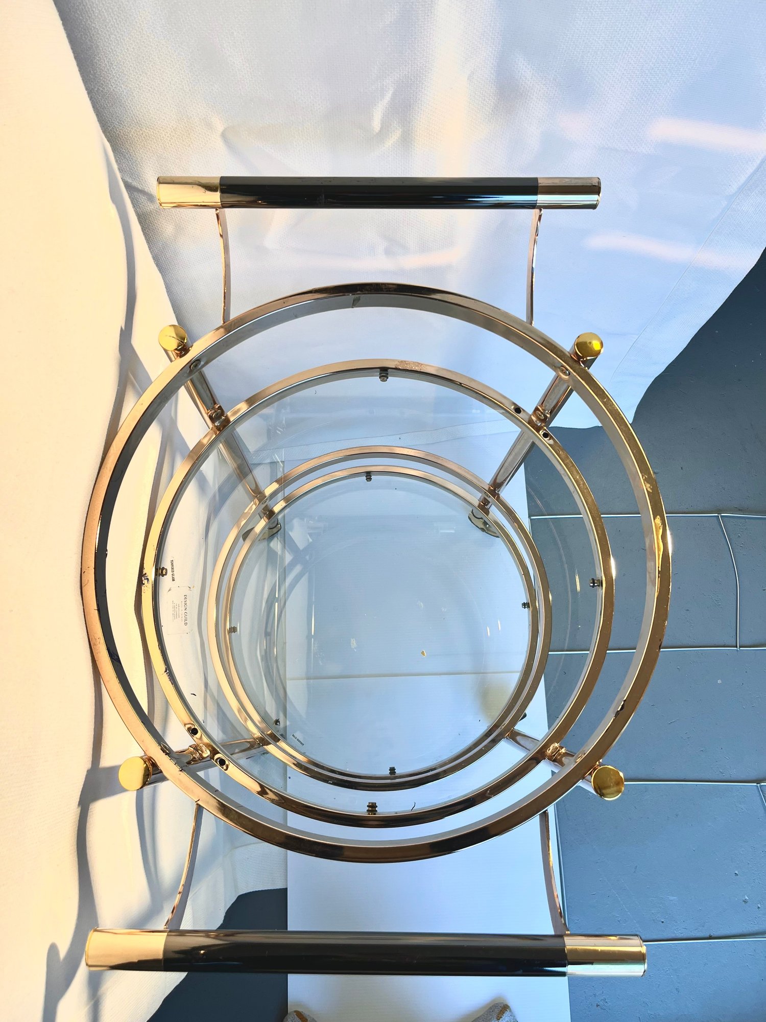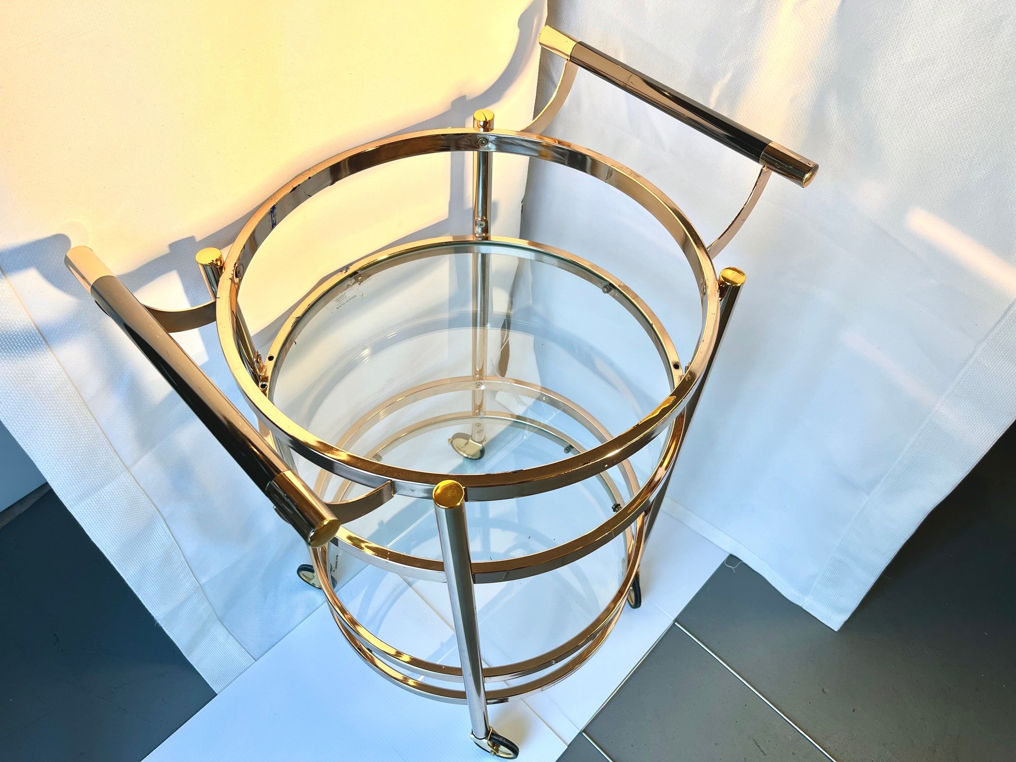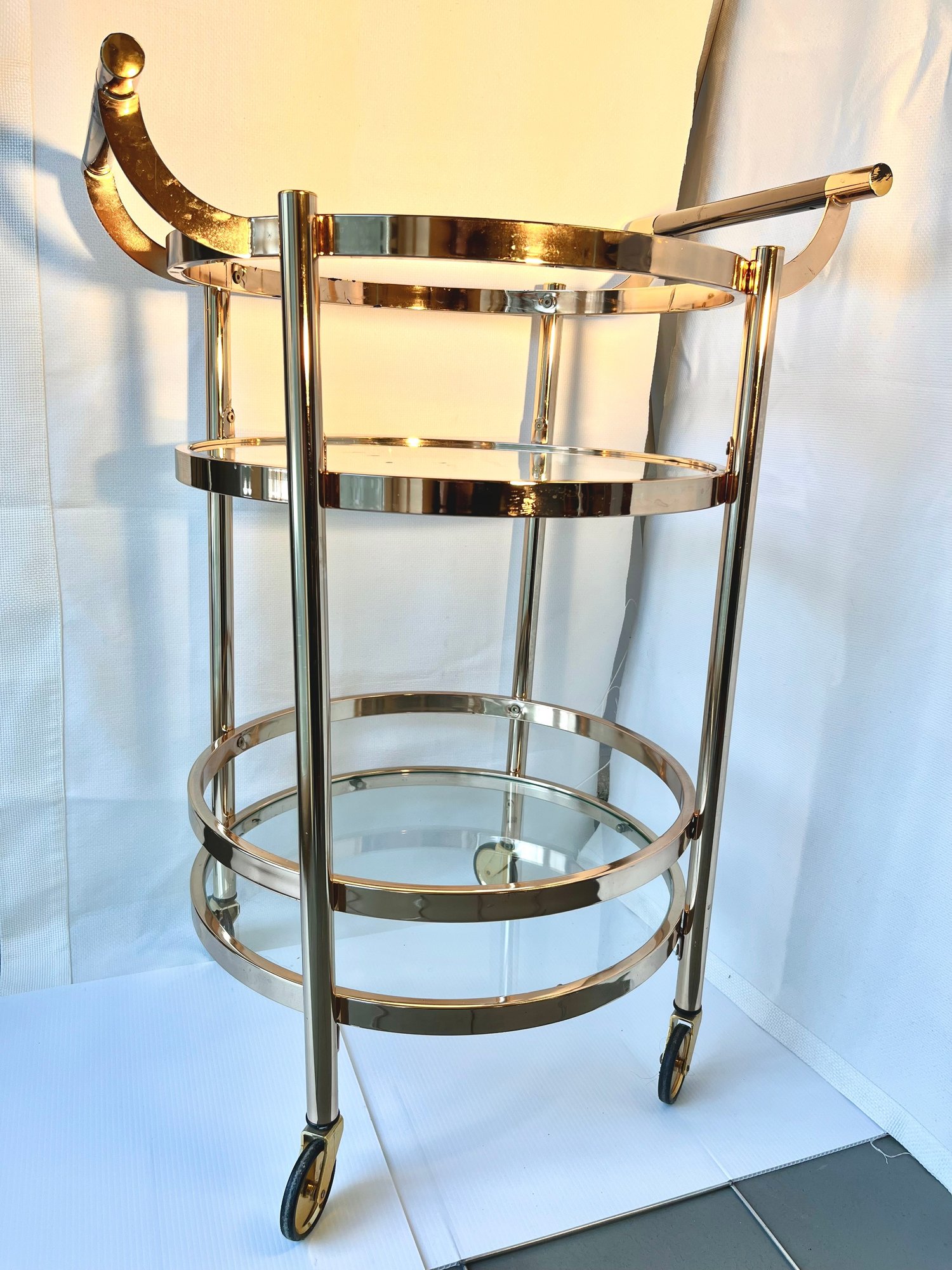 Elevate your hosting game with this stunning Design Guild rolling serving cart – a true vintage gem that combines mid-century elegance with ultimate functionality! Perfect for the discerning entertainer or vintage furniture enthusiast, this two-tier round cart brings a touch of sophisticated mobility to any dining or living space.