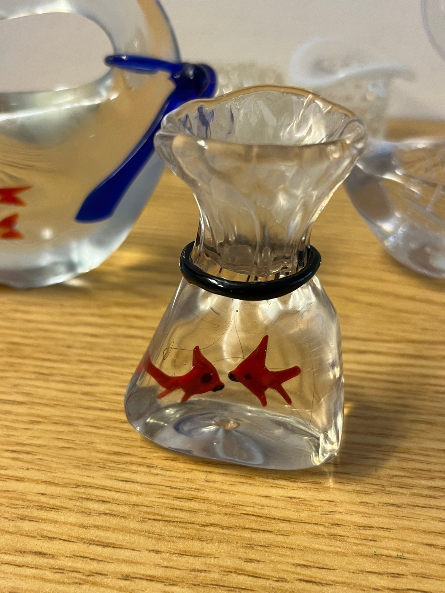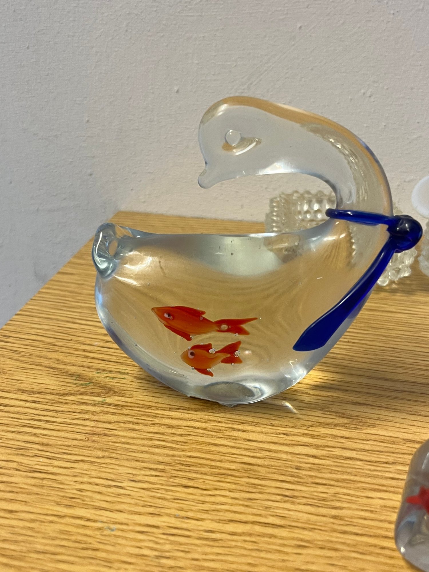 There is something quietly enchanting about white glass — the way it holds light, diffuses it softly, and transforms any surface into something worth pausing over. This charming grouping of white glass ornaments brings together a delightful cast of characters: a whimsical hat, an elegant swan cradling fish within its form, and a petite bag similarly harboring its own aquatic secret. Each piece carries the hallmarks of skilled glasswork — smooth curves, translucent depth, and that particular luminous quality that only hand-finished glass achieves.