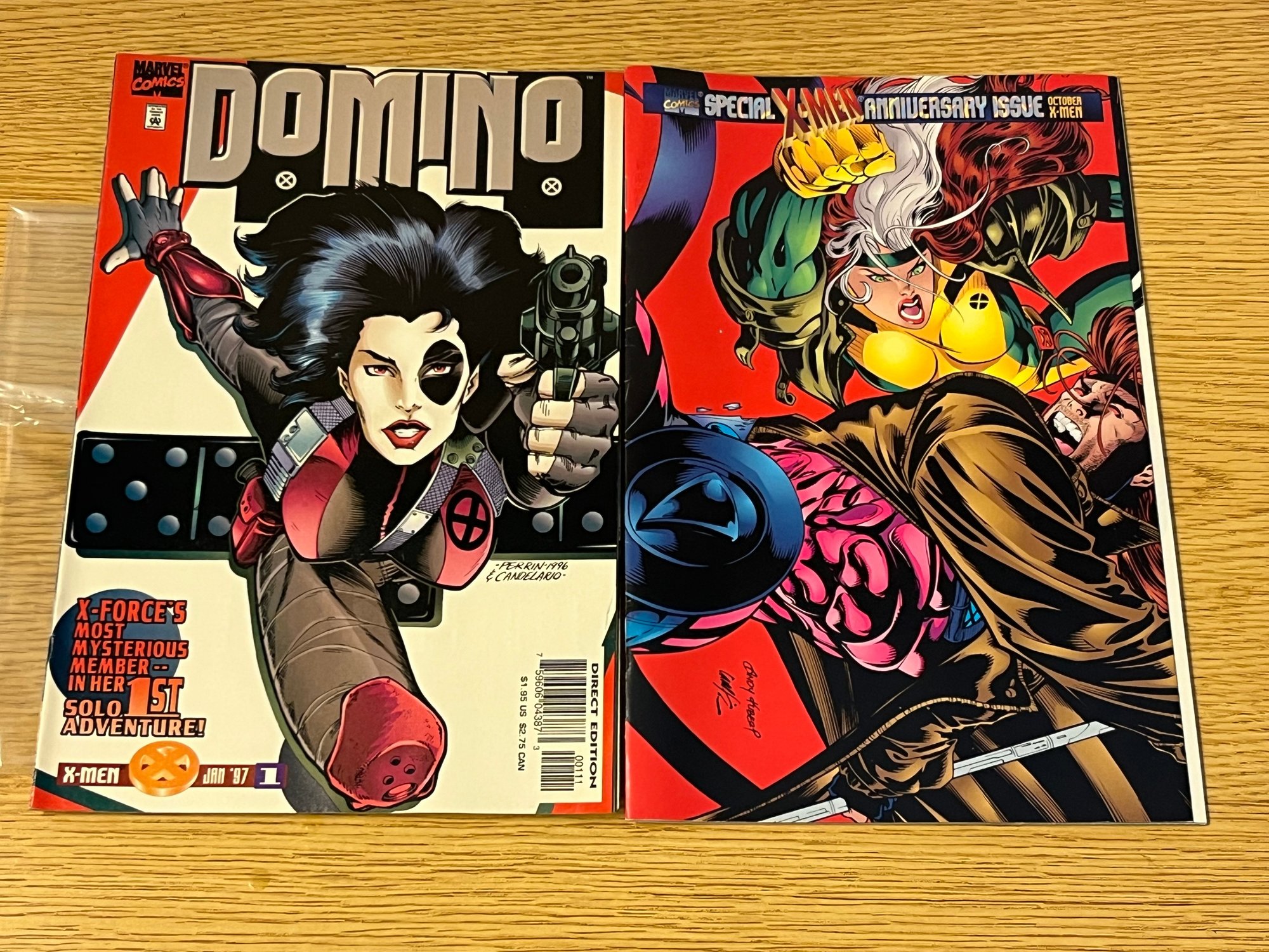 A rare opportunity for the discerning Marvel collector — this compelling two-piece X-Men grouping brings together a milestone anniversary issue and a coveted solo debut in a single, hard-to-replicate lot. The X-Men Anniversary Issue #45 stands as a landmark chapter in the beloved mutant saga, a title that defined a generation of comic readers and continues to command attention on the secondary market. Paired alongside it, the 1997 Domino #1 solo issue — a first-issue debut for one of Marvel's most enigmatic and underrated characters — rounds out this pairing with genuine depth and collectible weight. First issues and anniversary editions rarely surface together, making this grouping a natural centerpiece for any serious Marvel or X-Men collection. Condition details available upon request. Whether you're building a focused run, hunting key issues, or simply acquiring pieces with lasting cultural resonance, this lot delivers on every front. Bid with confidence — opportunities like this don't linger.