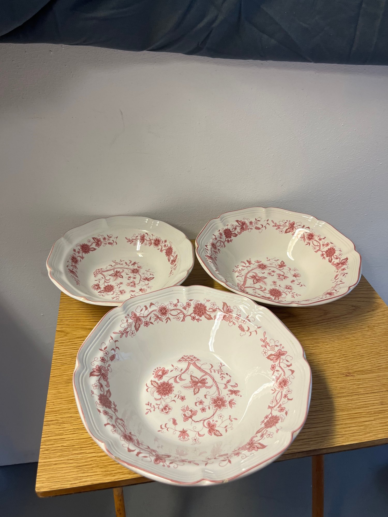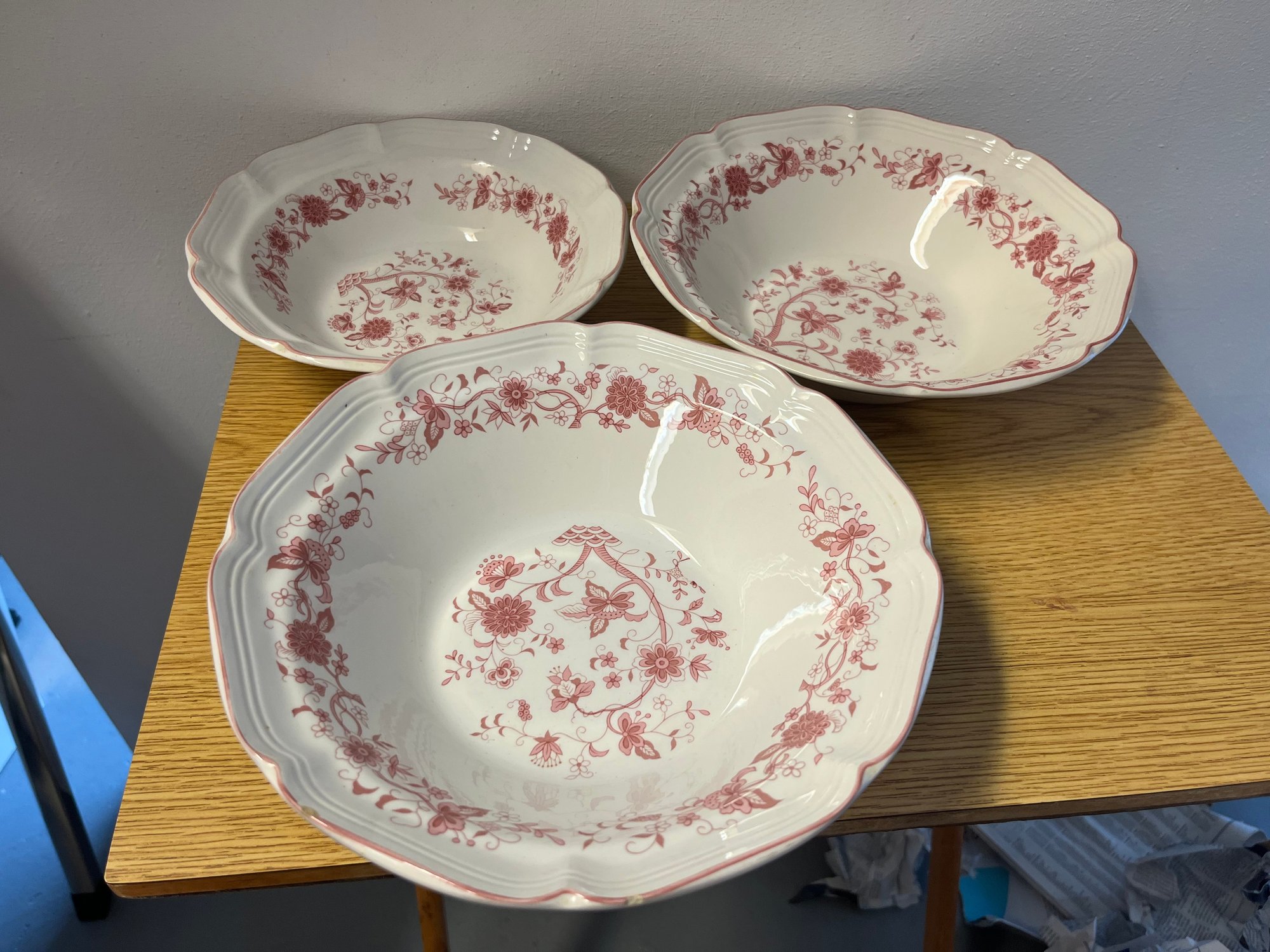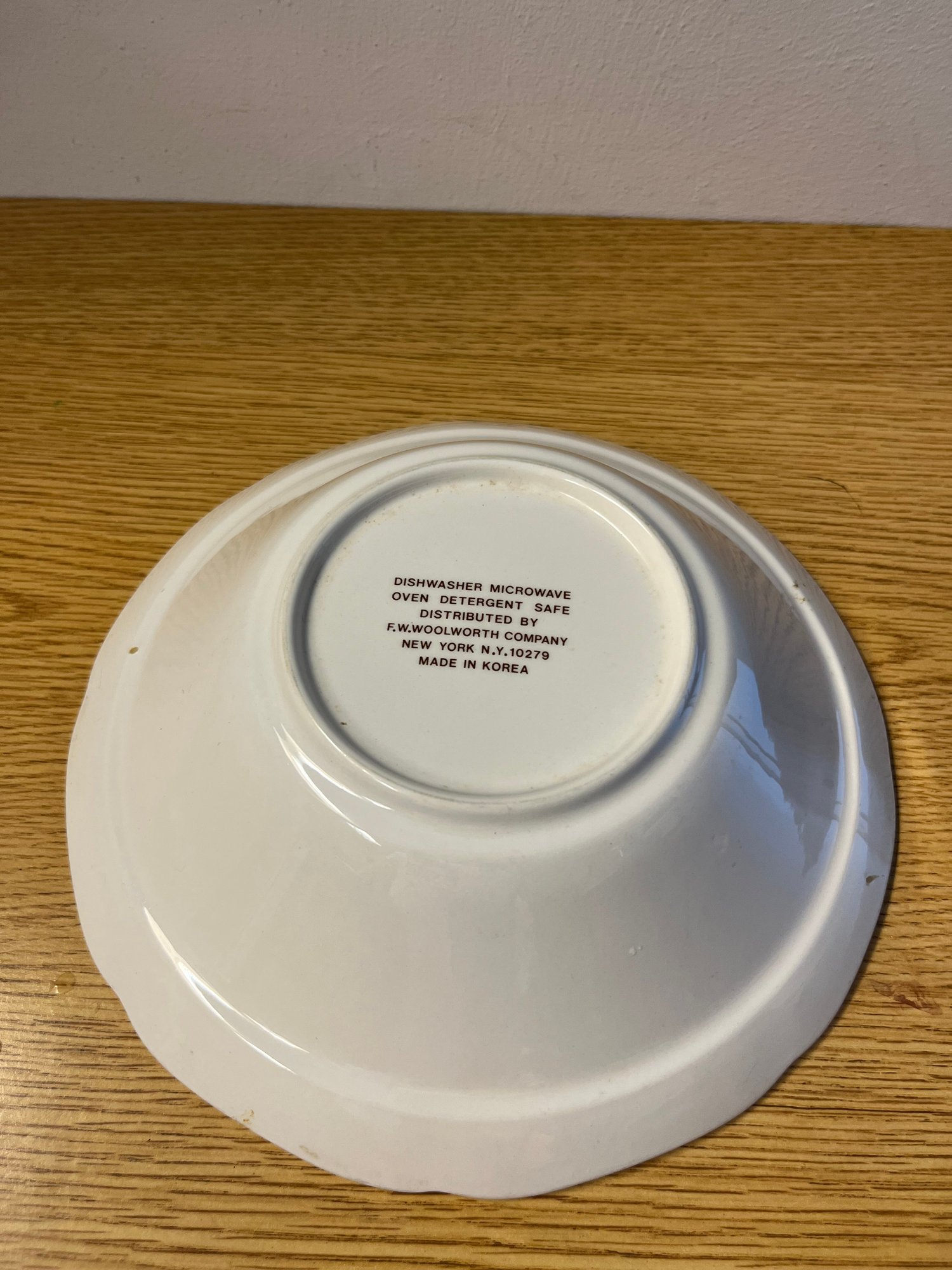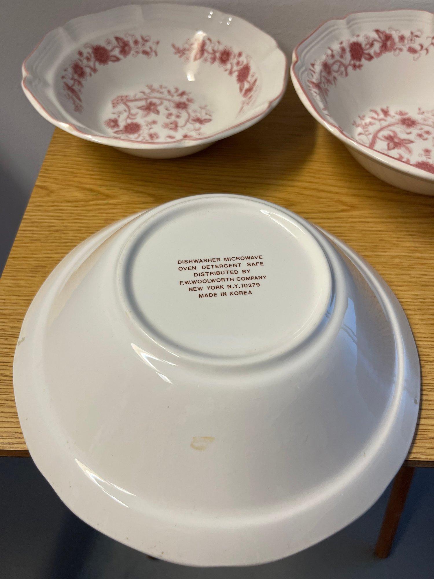 A charming quartet of F.W. Woolworth chinaware surfaces from a beloved five-and-dime era — two pieces in soft blush pink, one in cool powder blue, and one in quiet, understated grey. Woolworth's storied retail legacy is woven into the fabric of American domestic life, and tableware bearing its heritage carries the warm nostalgia of mid-century households from coast to coast. Each piece whispers of an age when the neighborhood Woolworth's anchored Main Street and affordable elegance graced everyday tables. Whether arranged as a pastel vignette on an open shelf, incorporated into a curated vintage tablescape, or displayed as a tribute to five-and-dime Americana, this matched grouping offers genuine collectible appeal that transcends mere utility. Rare in any single piece — rarer still as a coordinated set in three distinct colorways. A find that rewards the discerning collector of American retail history and vintage housewares alike. Do not let this quietly extraordinary set pass without a bid.