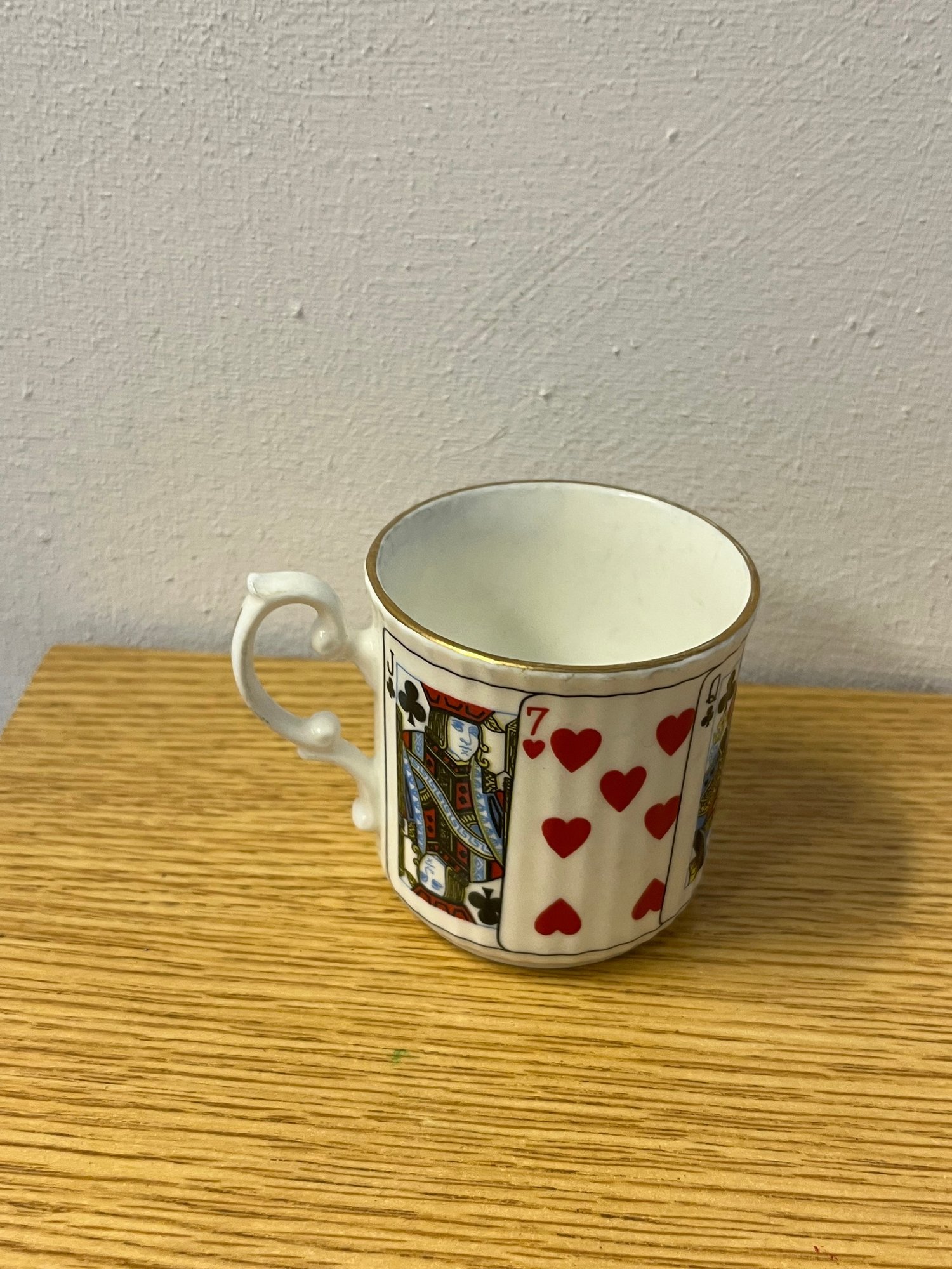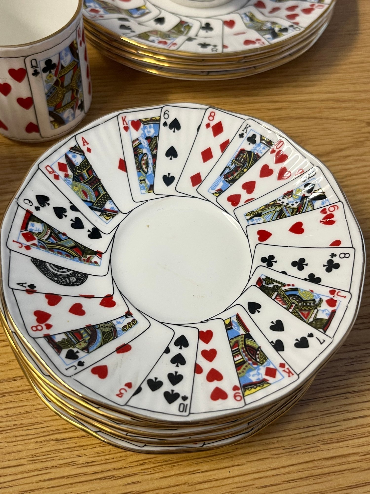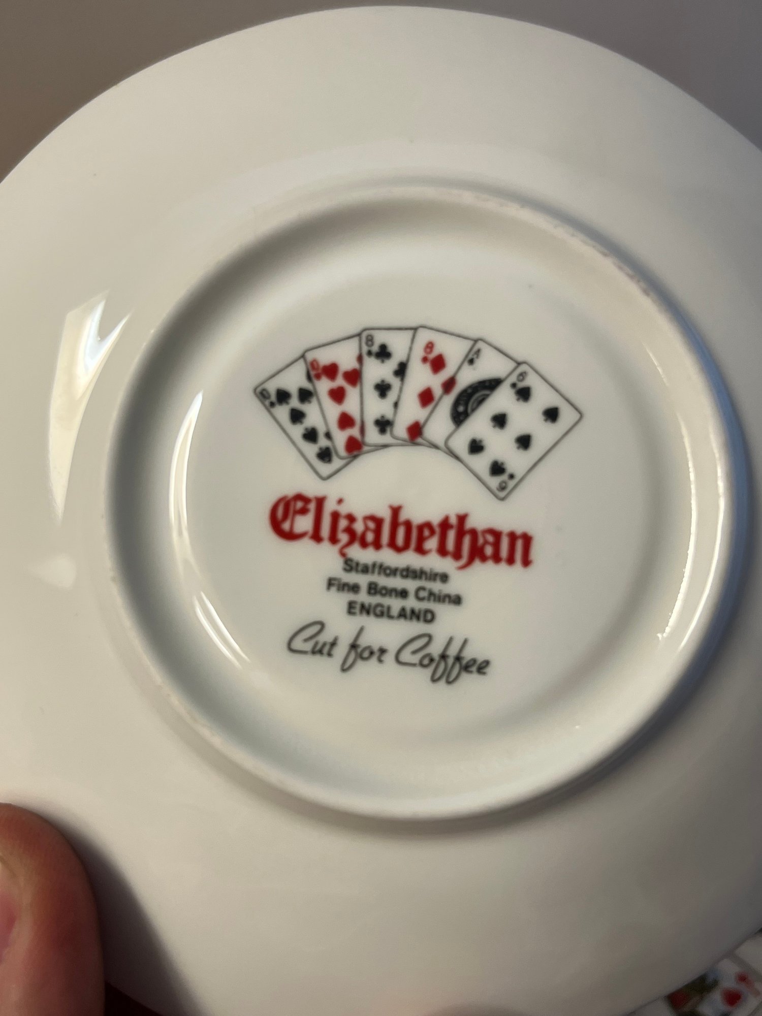 Few table settings command a second glance quite like this enchanting Elizabethan Staffordshire fine bone china coffee service, dressed in the timeless iconography of the card table. Hearts, diamonds, clubs, and spades adorn each translucent, featherlight piece — a whimsical yet thoroughly refined motif that speaks equally to the collector and the devoted entertainer.