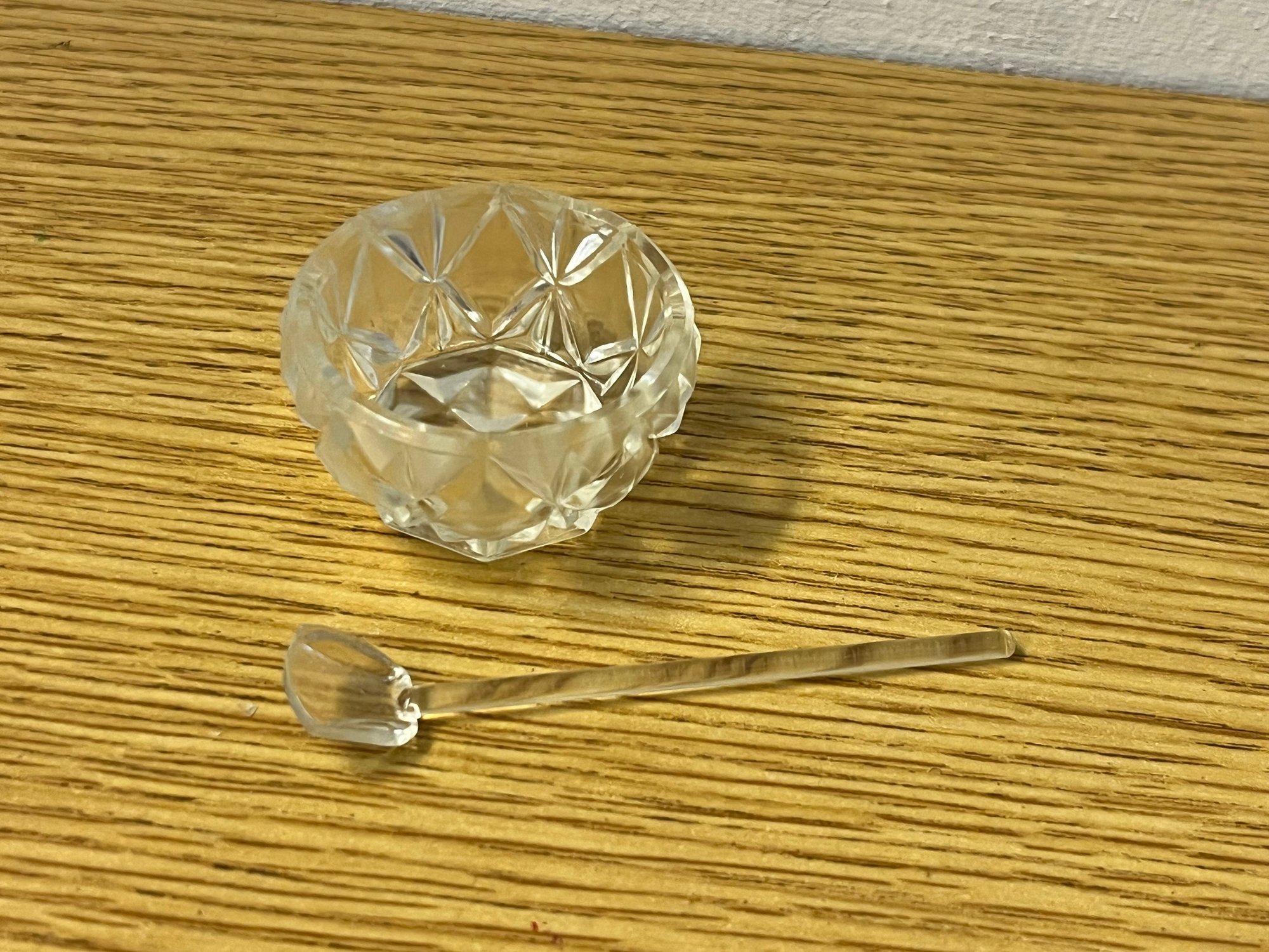 The glass retains its clarity and appeal, and the accompanying spoons — five of the original six — add considerable completeness to the offering. A rare opportunity to acquire a cohesive set of salt dips with genuine presence and provenance in the domestic arts.