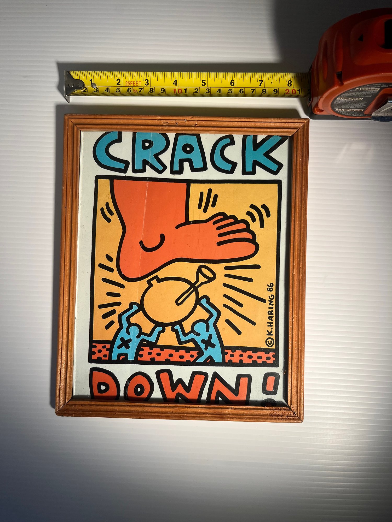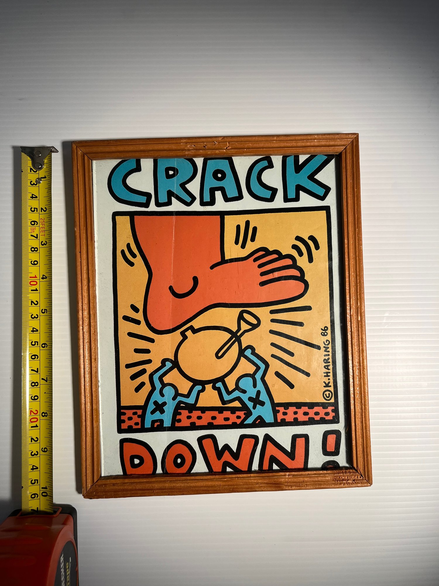Immerse yourself in the electrifying world of Keith Haring with this captivating small lithograph that embodies the raw energy and social commentary of one of the most iconic street artists of the 20th century. The "Small Keith Haring Crack Down! Lithograph" refers to art created for a 1986 anti-crack cocaine benefit concert in NYC, featuring his iconic style with figures fighting drug use, often showing a large foot crushing a crack pipe; these are typically offset lithographs or silkscreens, available as posters or concert programs, serving as social commentary and fundraising pieces, distinct from his larger murals but embodying his activism for causes like AIDS awareness and nuclear disarmament. This lithograph captures Haring's signature bold graphic style - a testament to his groundbreaking approach to contemporary art. The piece showcases the artist's unique ability to communicate complex social messages through simplified, energetic figures that seem to pulse with life and urgency.