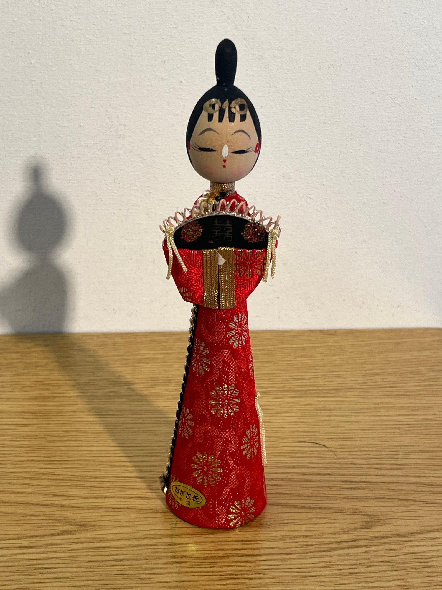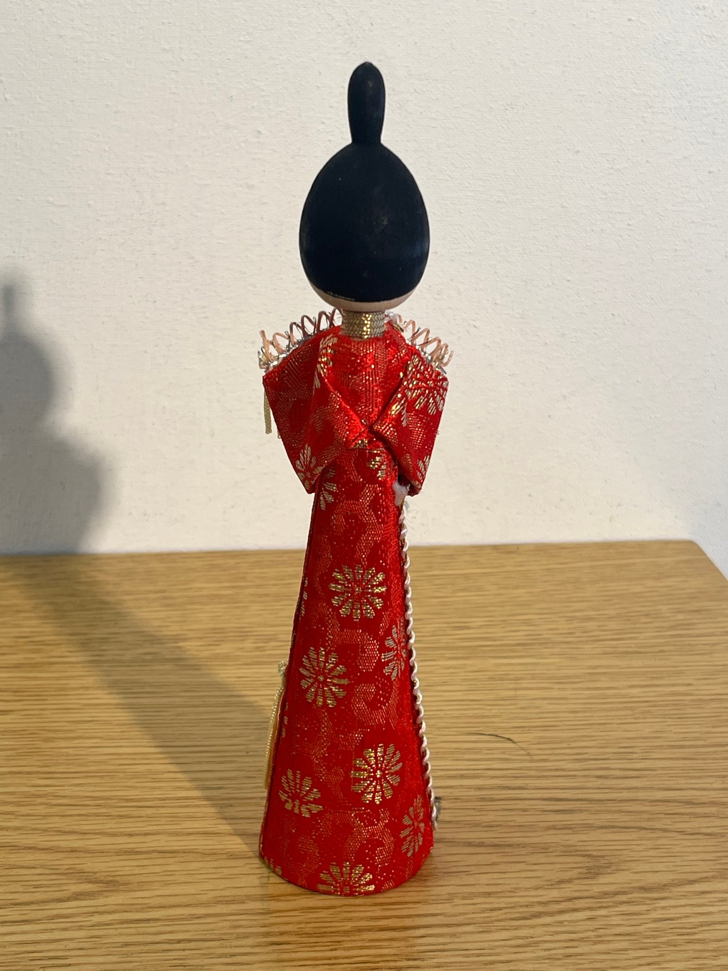 Her vibrant red silk-brocade robe, richly embroidered with gold floral motifs, flows to a cone-shaped base in the classic display doll construction of the 1960sā1980s. A black decorative yoke trimmed in red, gold, and silver chain frames her shoulders, while gold fringe tassels at the sleeves speak to the skilled hands that assembled her. Colors remain vivid and wholly unfaded.