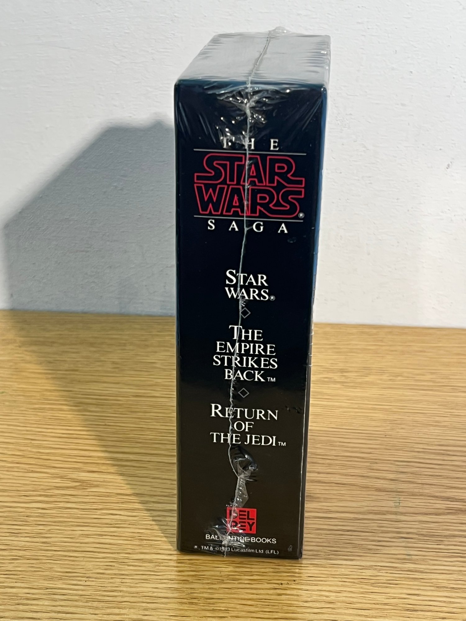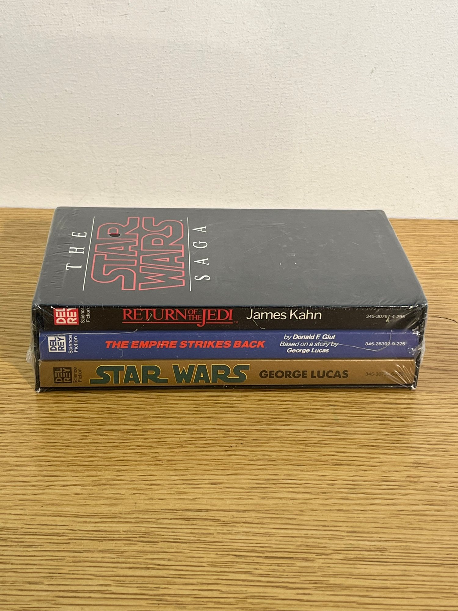 A crown jewel for any serious Star Wars collector: the complete original Ballantine Books novelization trilogy, all three volumes factory sealed and preserved in extraordinary condition. This is the saga as it was first committed to the printed page — Star Wars by George Lucas himself, The Empire Strikes Back by Donald F. Glut, and Return of the Jedi by James Kahn — the literary foundation upon which a cultural empire was built.